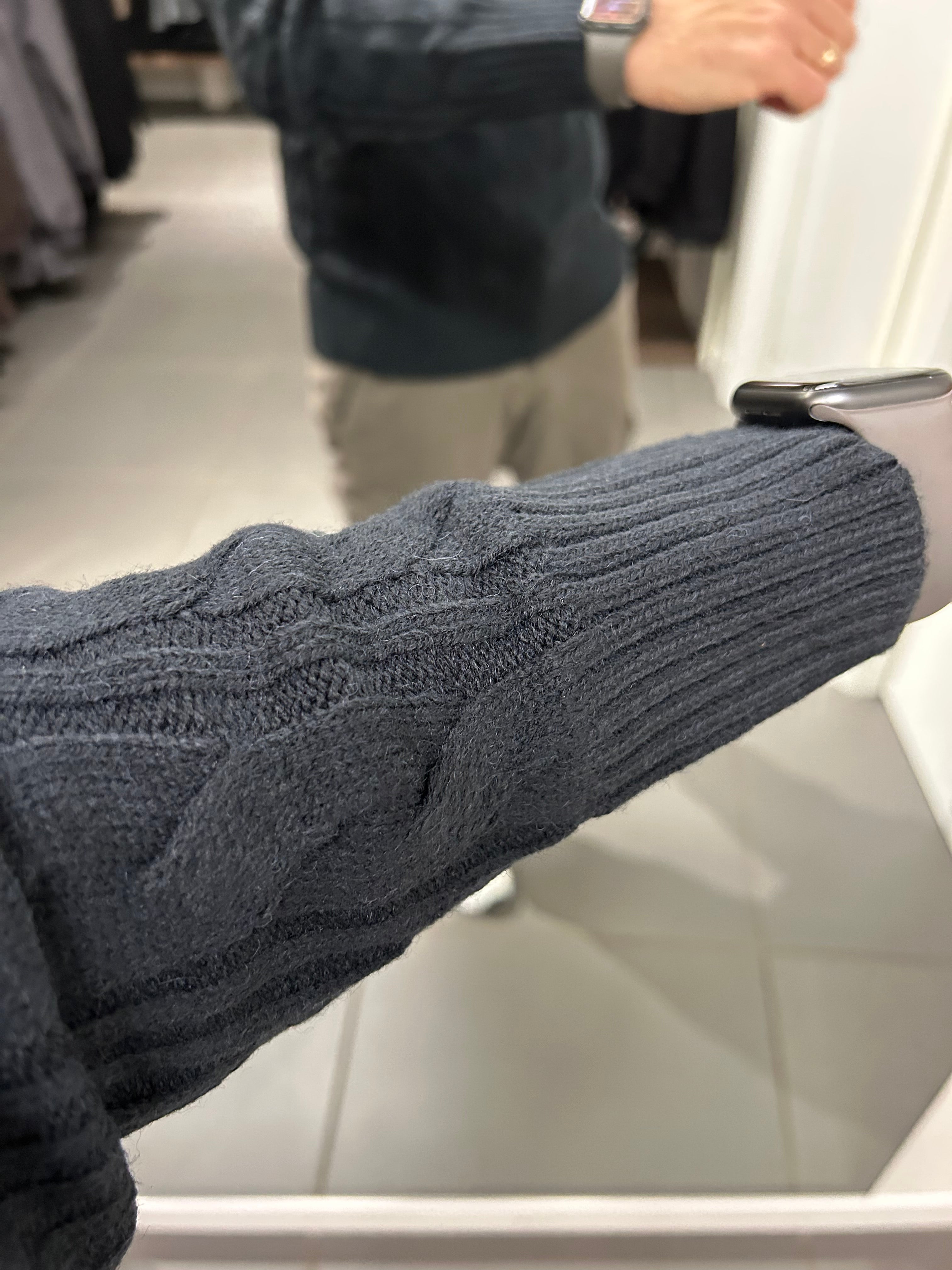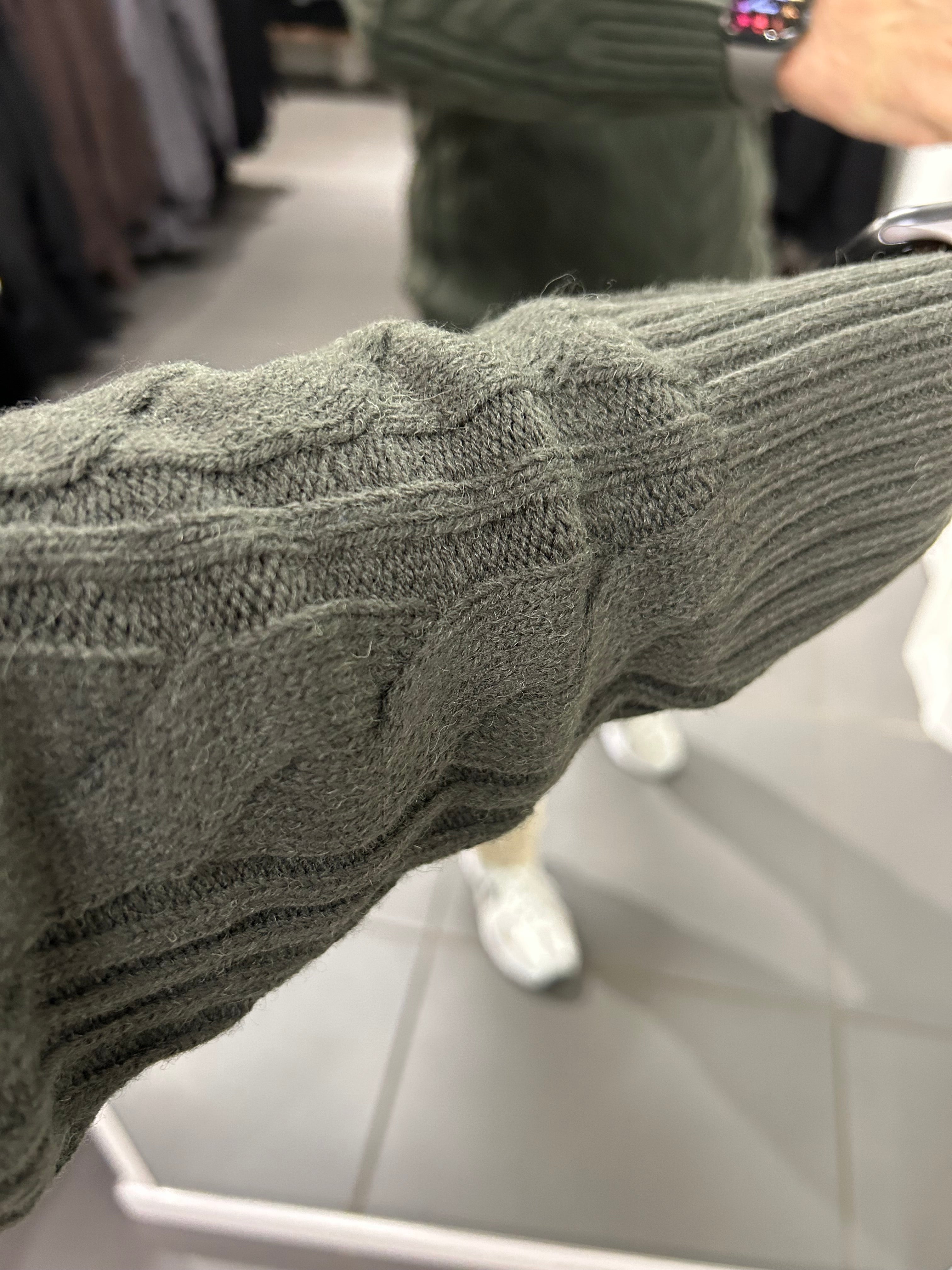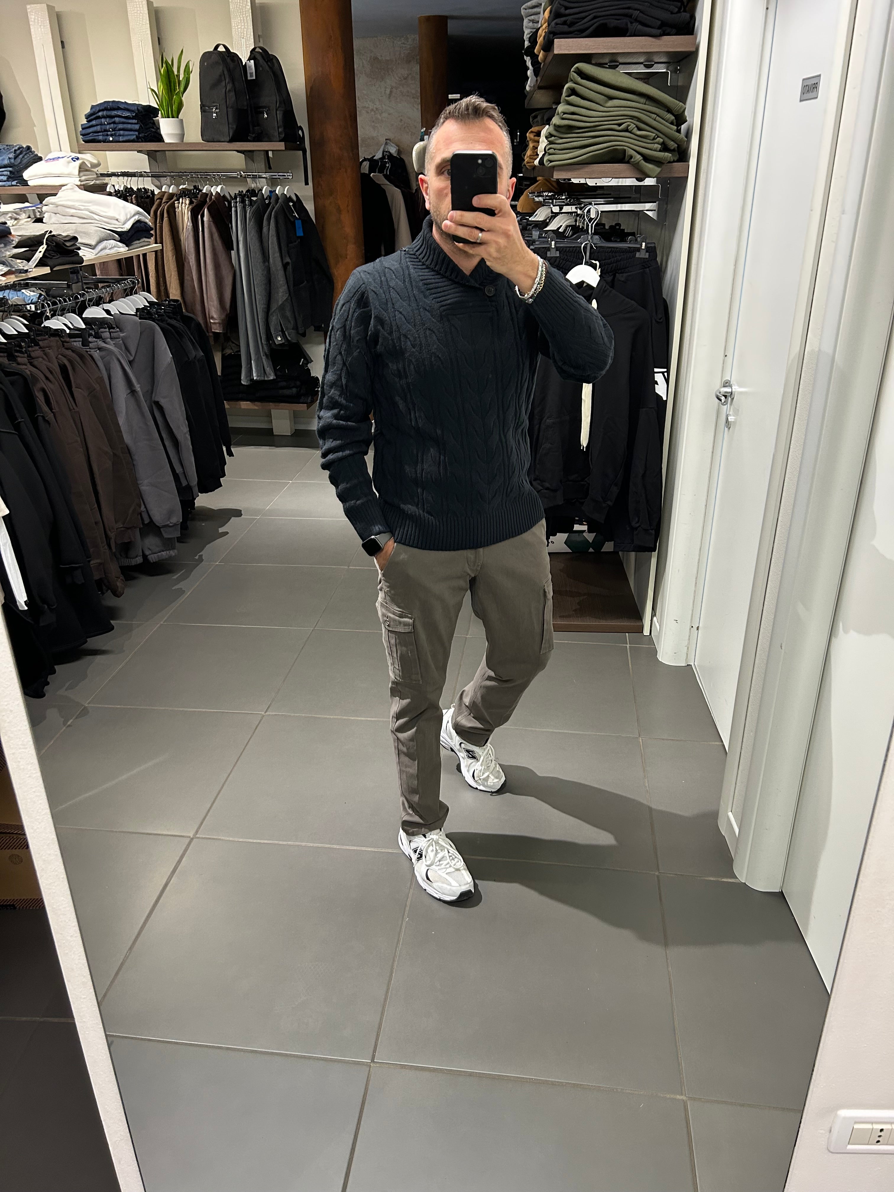 Maglia scellare dov’è il collo scende morbido con un bottone a fine a fine scollatura grigio, il motivo del maglioncino è a intreccio