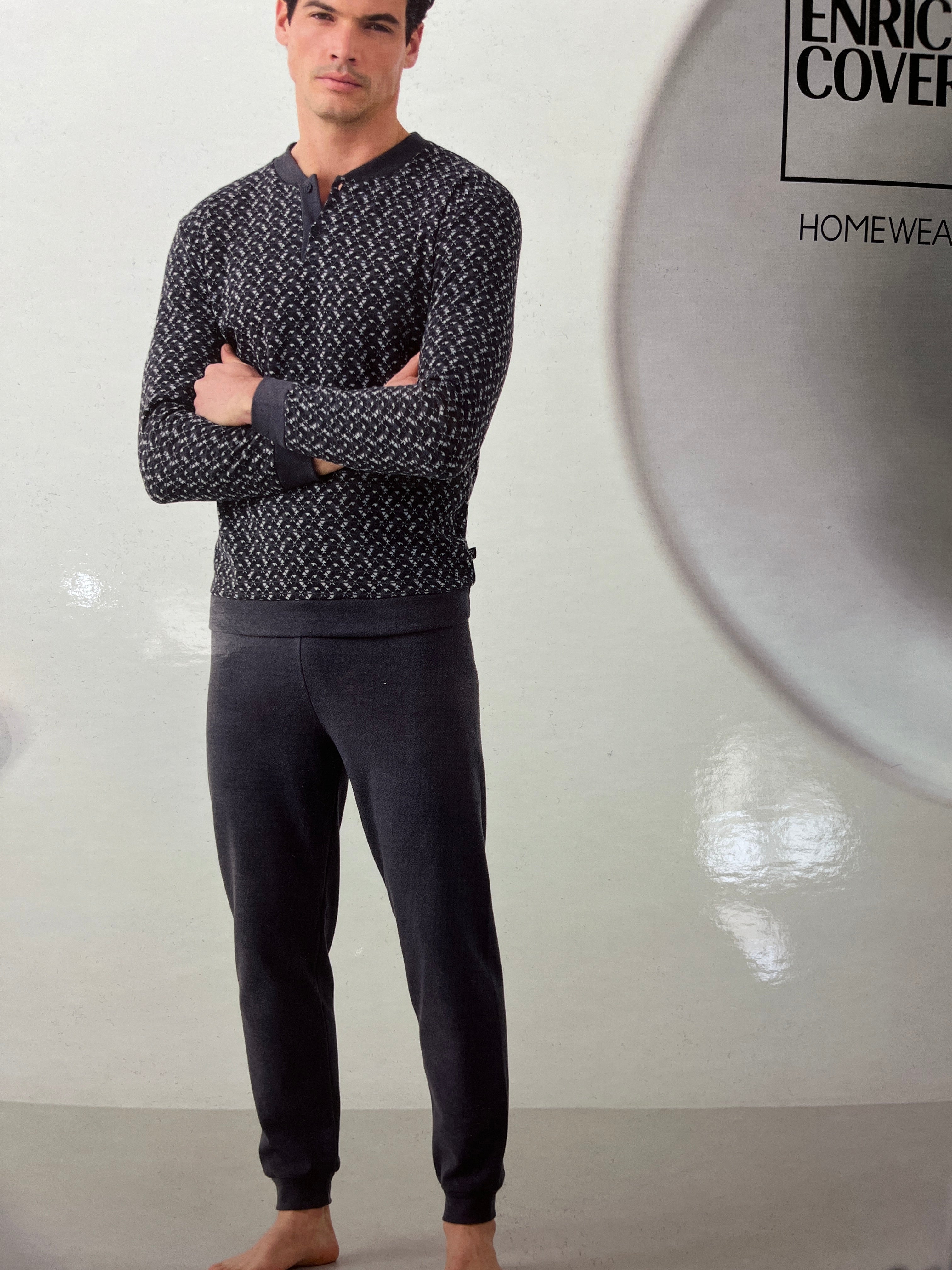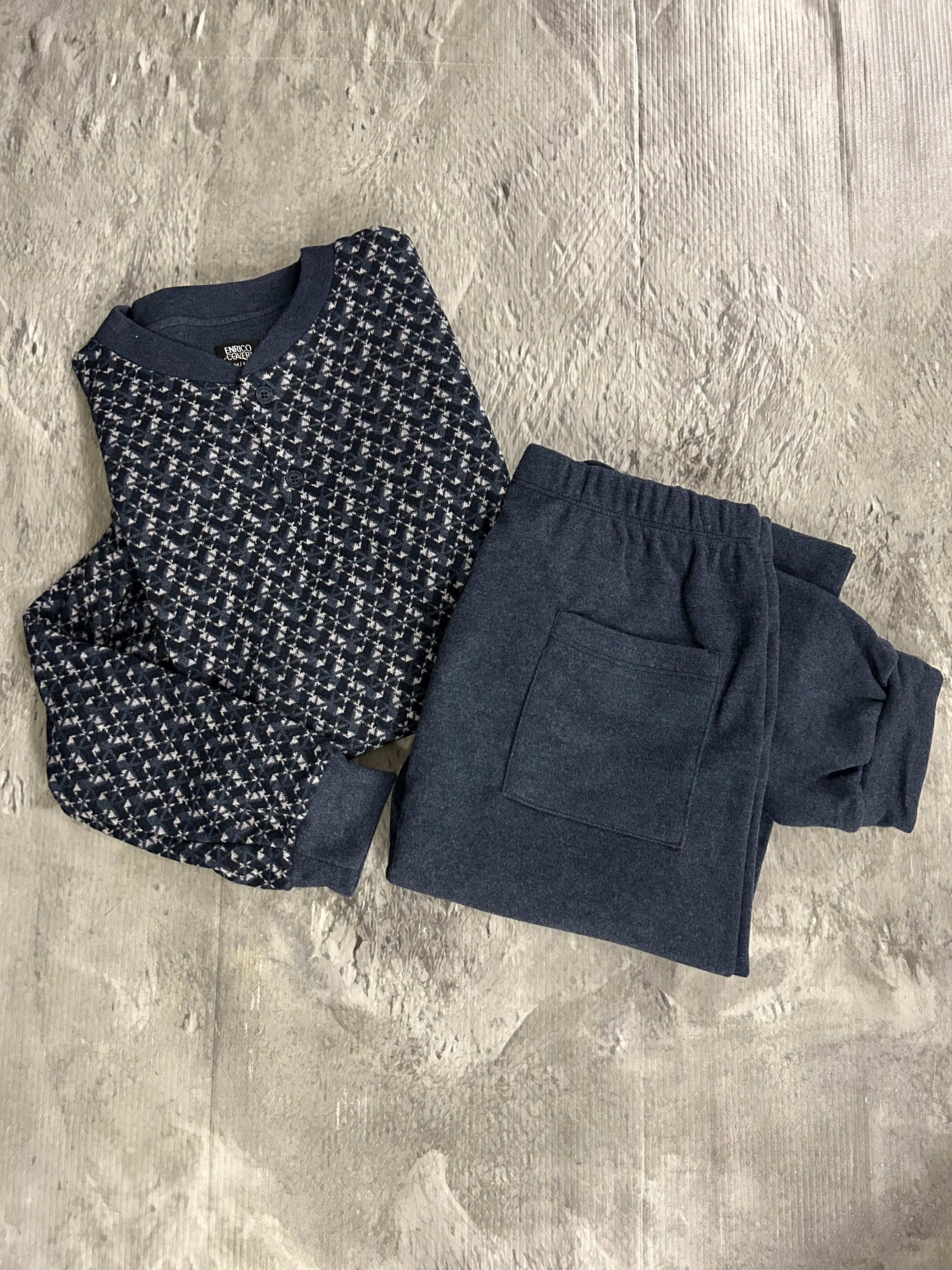Pigiama in morbido e caldo punto milano.  Maglia a girocollo con 2 bottoncini, in micro fantasia geometrica. Pantalone monocolore con polsini al fondo. Taglie dalla M alla XXL.