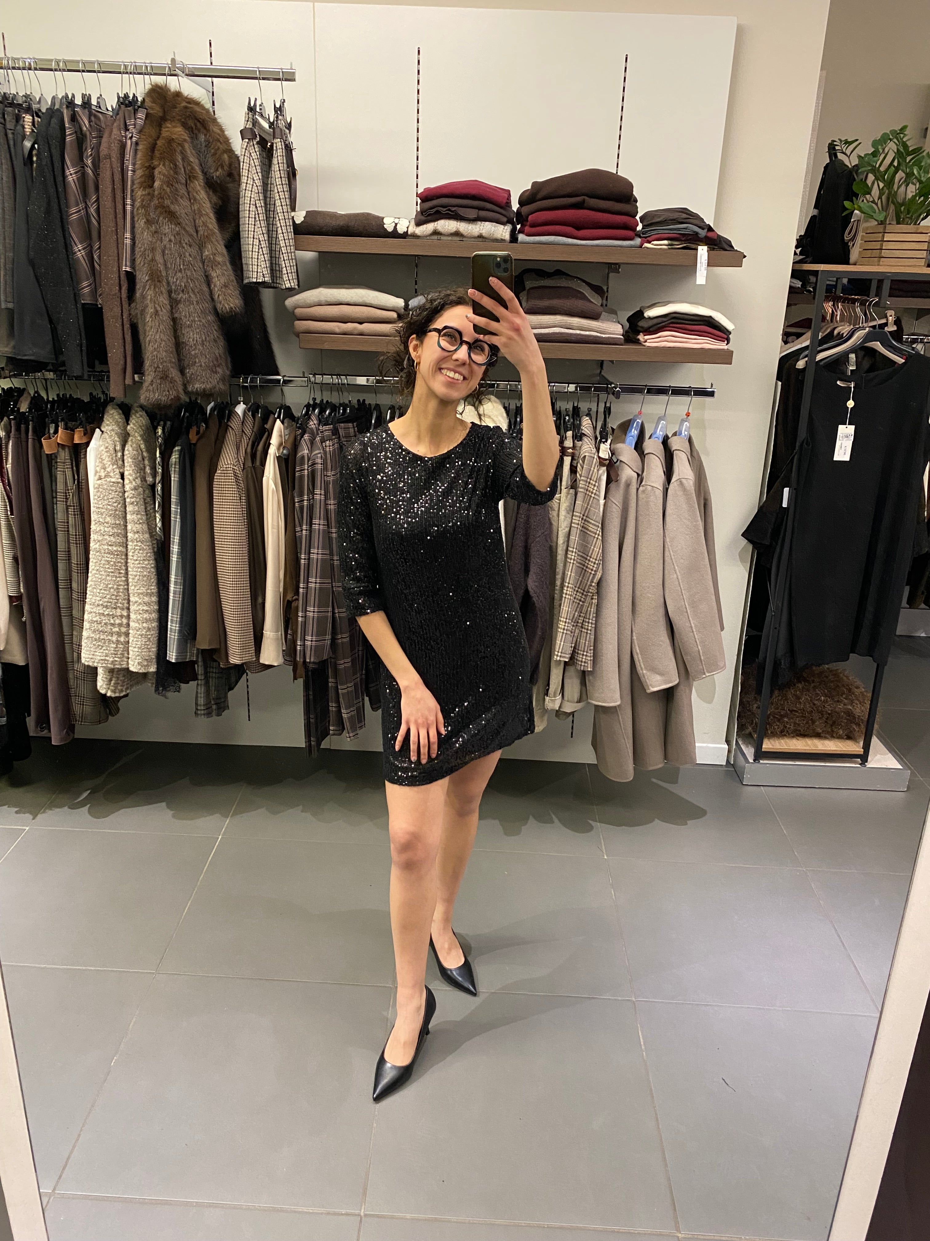 Abito dal taglio sfiancato tutto elasticizzato con paillettes nere.        L’ abito è a manica 3/4 ed è un girocollo. Il vestito ha una lunghezza cortino. Bello per le tue festività. Taglie unica.