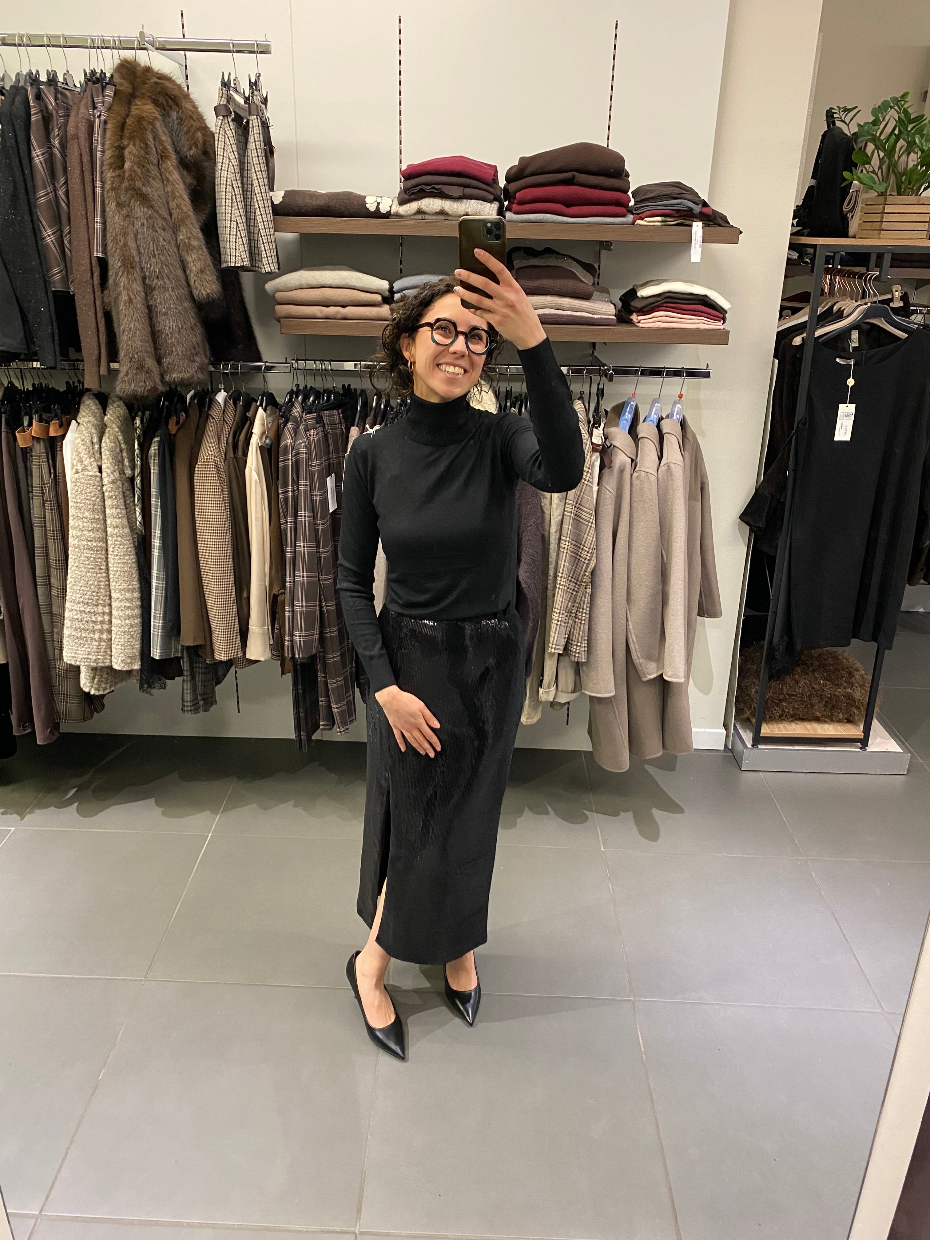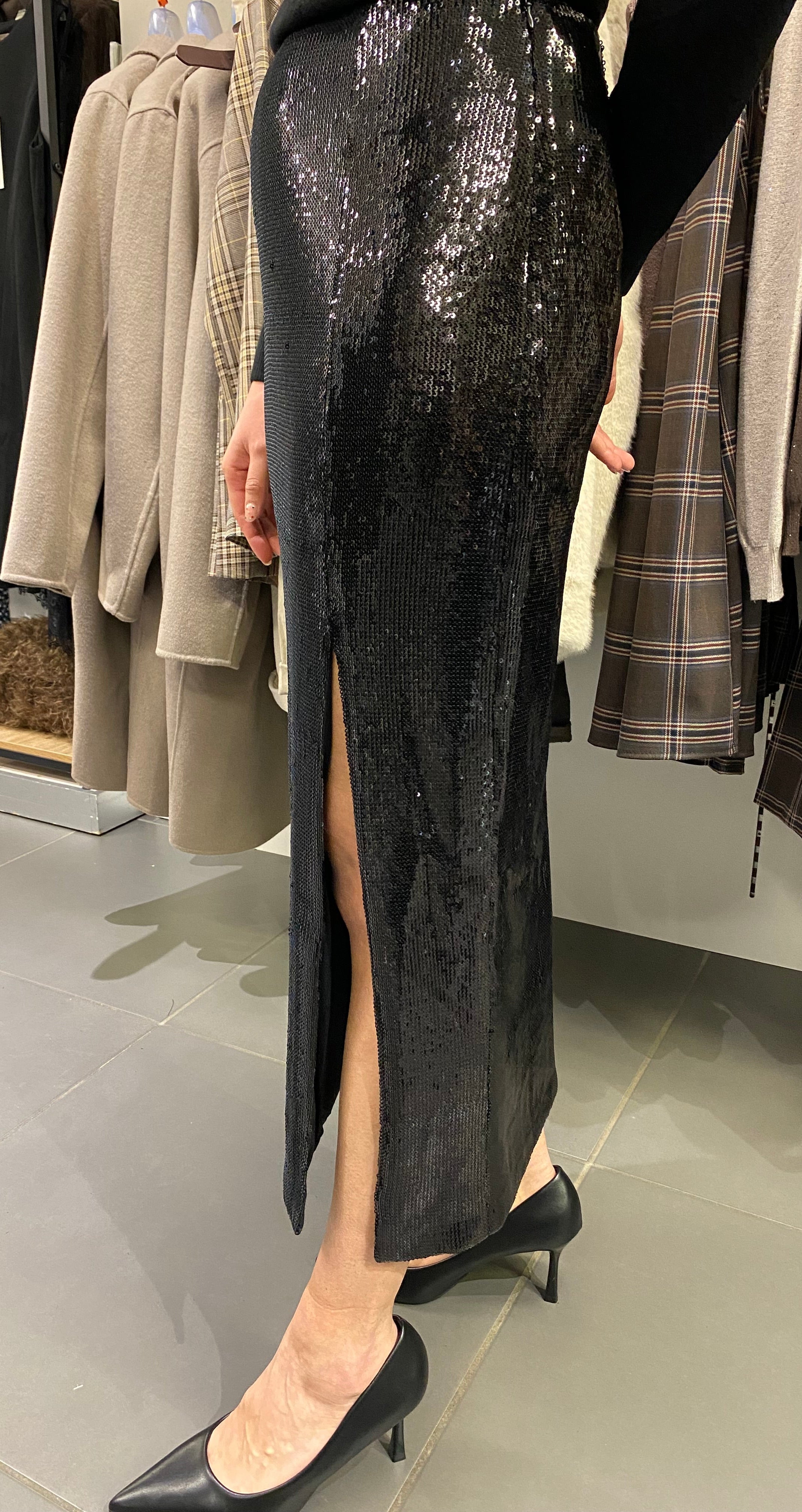 Gonna longuette midi tutta in paillettes con spacco davanti laterale. La gonna è tutta ricoperta di paillettes nere ed è a vita alta ed ha una chiusura con zip laterale. Taglie