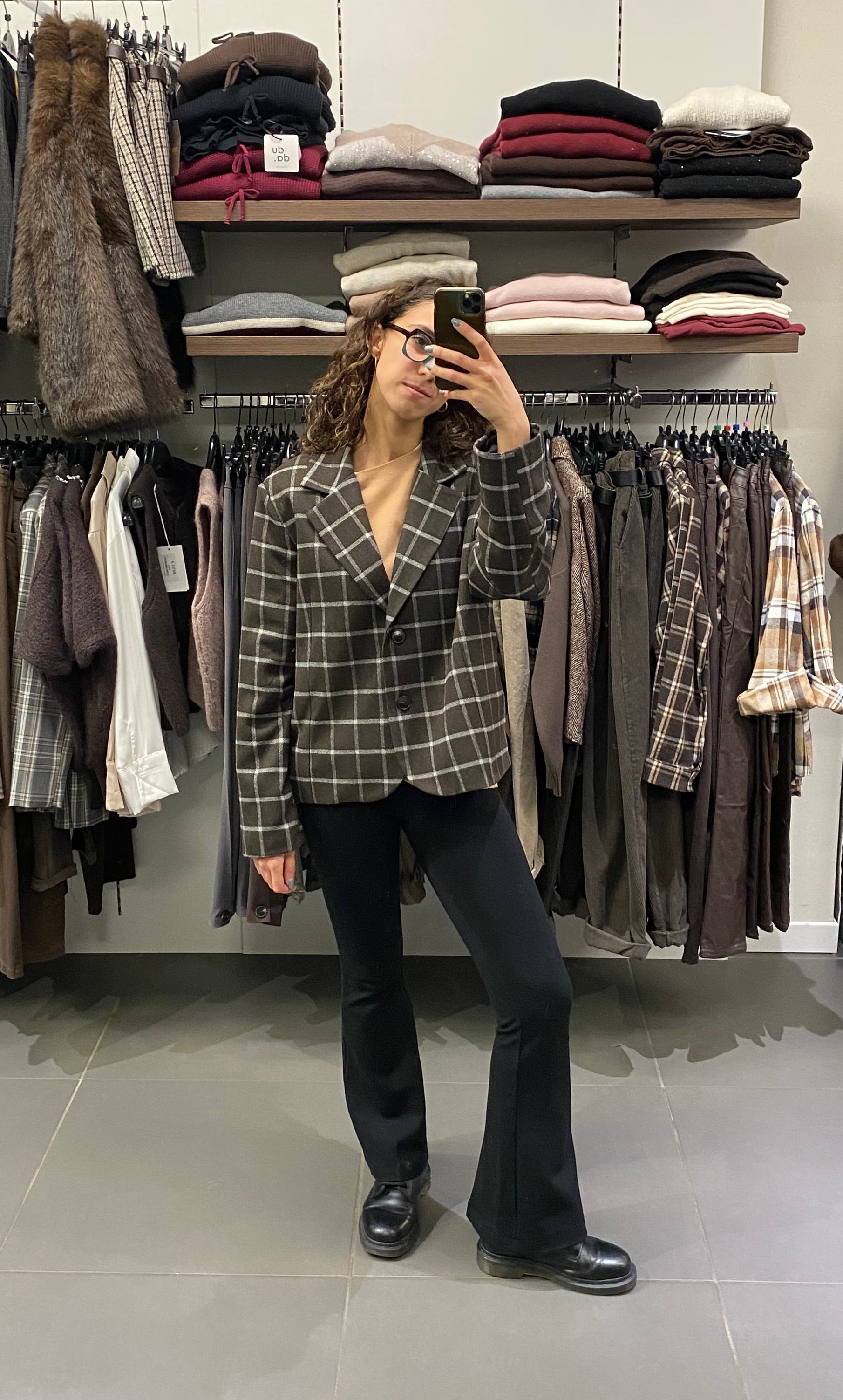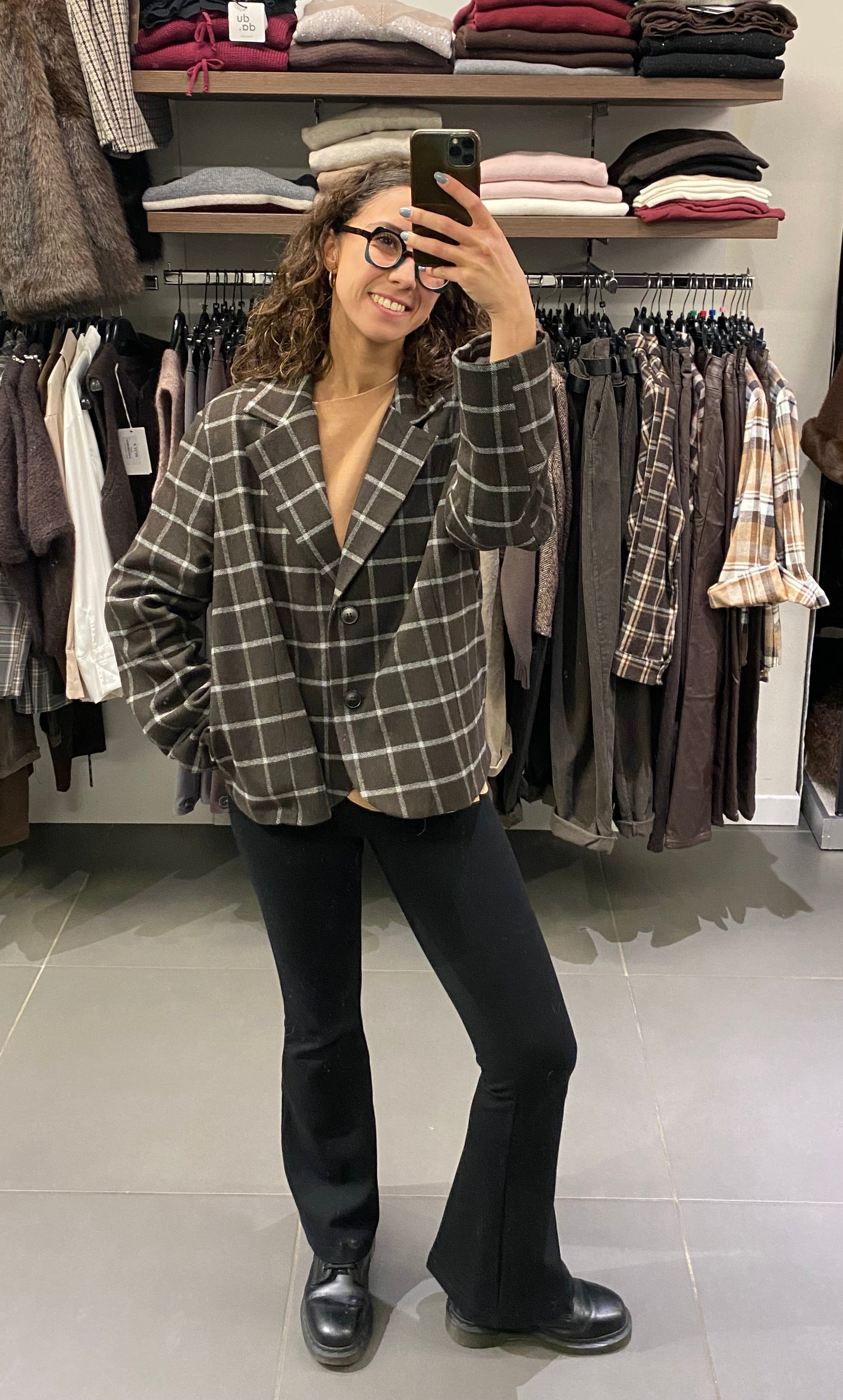 Cappottino corto a quadri TWOWAY. Il cappottino arriva ai fianchi quindi è bello da usare anche come blazer sotto ai cappotti over. È in colorazione testa di moro con questo disegni a quadri sui toni del grigio/azzurro a contrasto. Taglio over a scatoletta con due bottoni a chiusura sul davanti. Vestibilità regolare e taglie XS/S ed M/L.