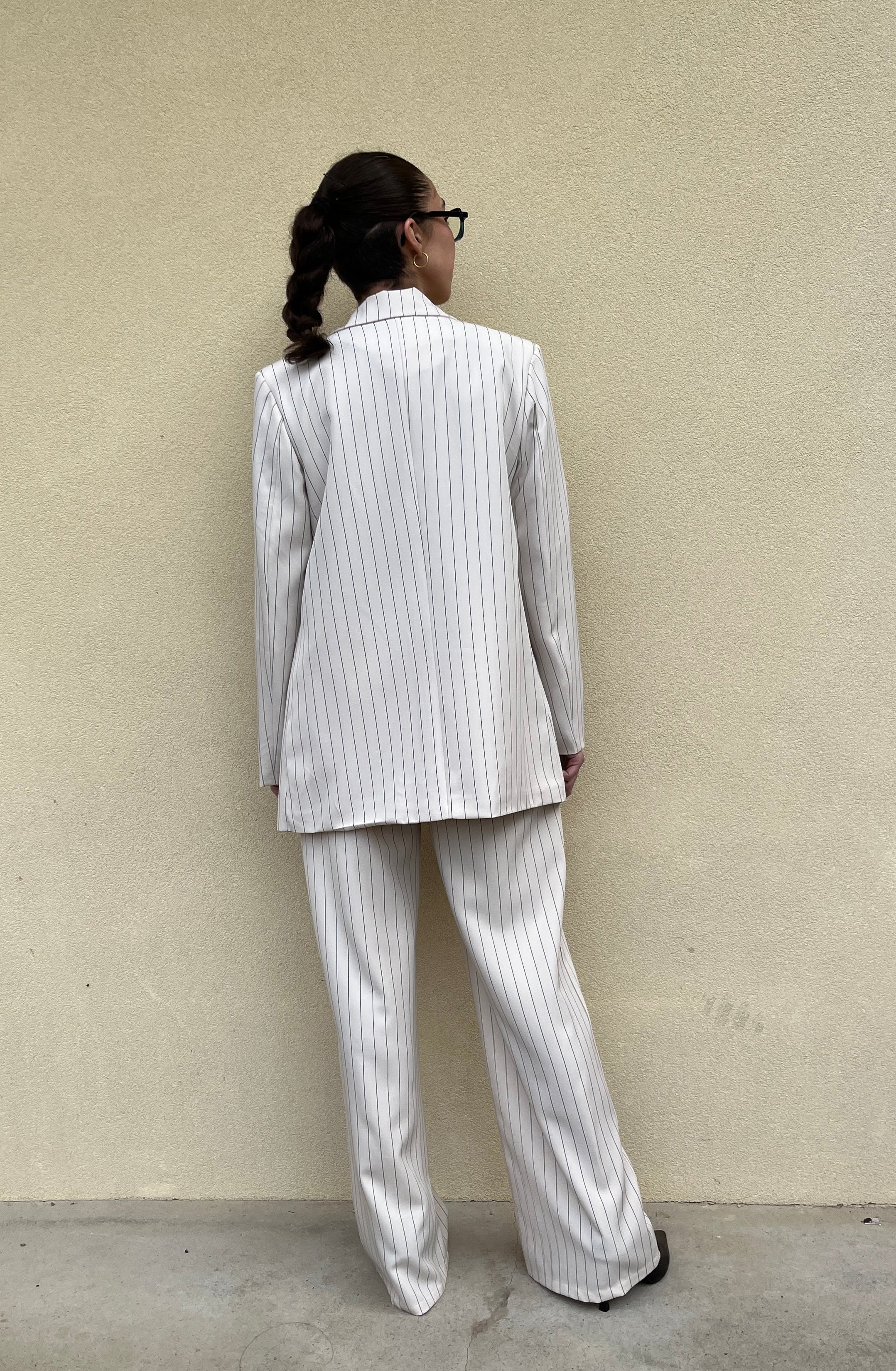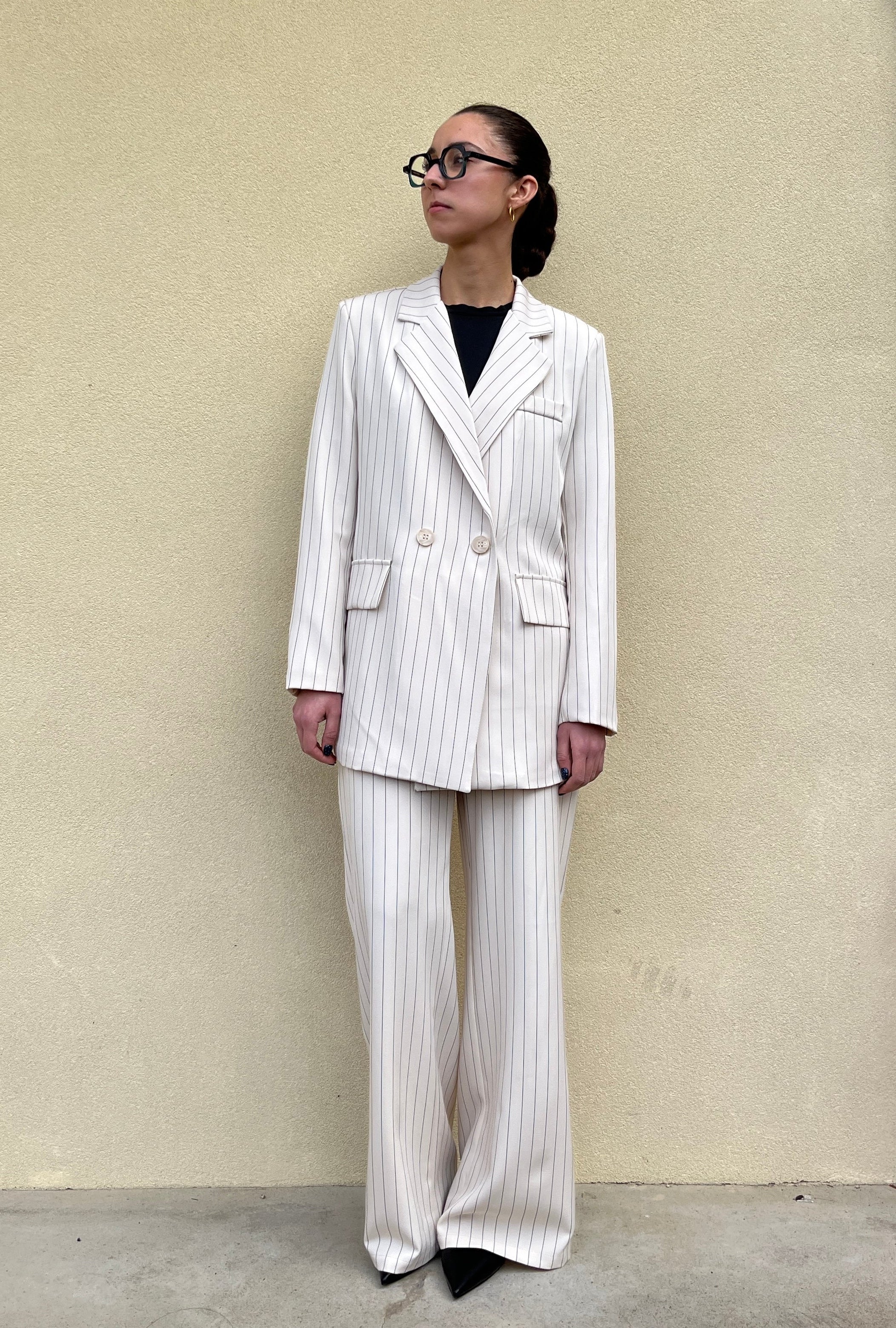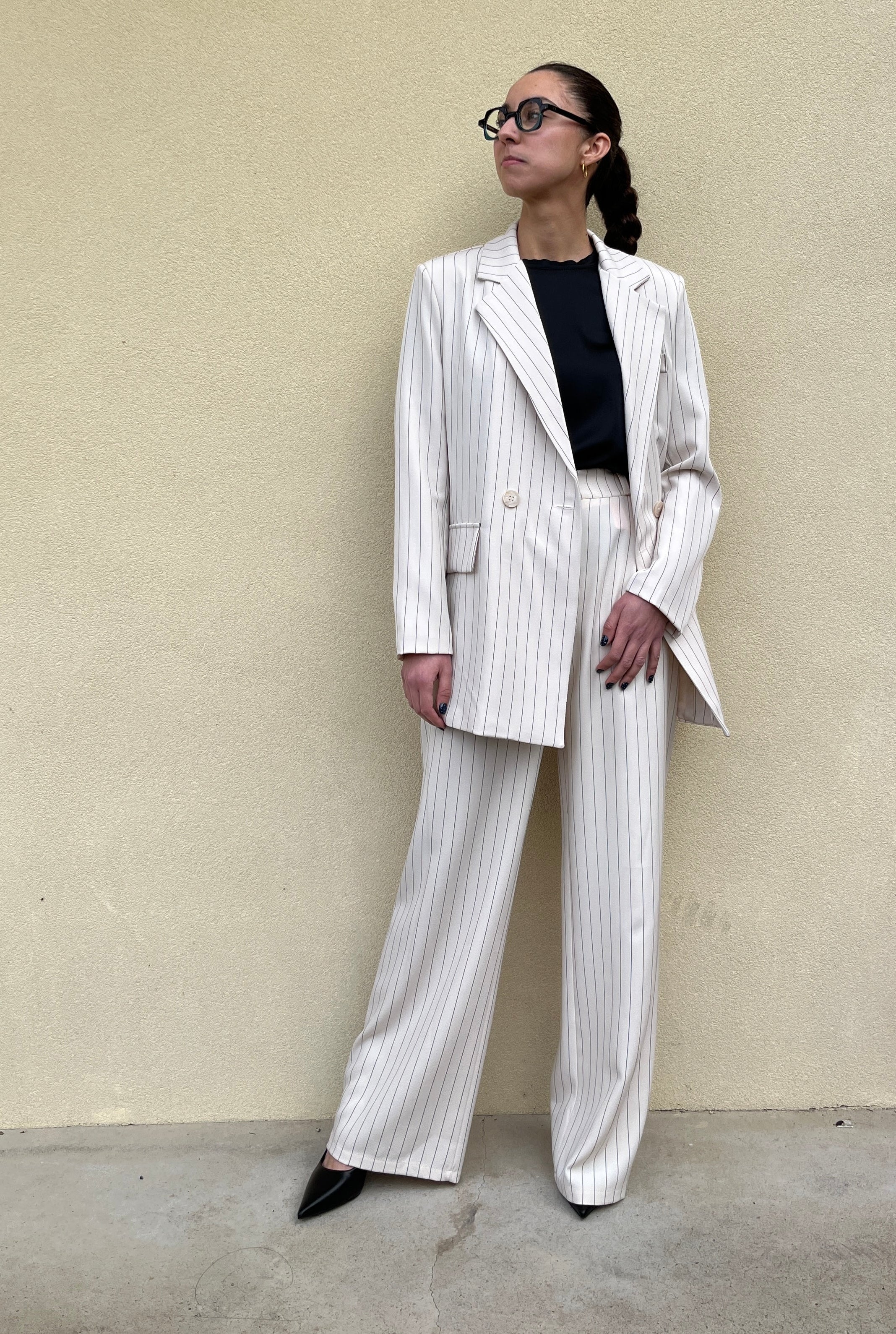 -Pantalone a palazzo(gamba morbida) con chiusura con zip e bottone classica. Passanti per cintura e doppia pences davanti. Come per la giacca, il pantalone è su base panna con gessatura nera.