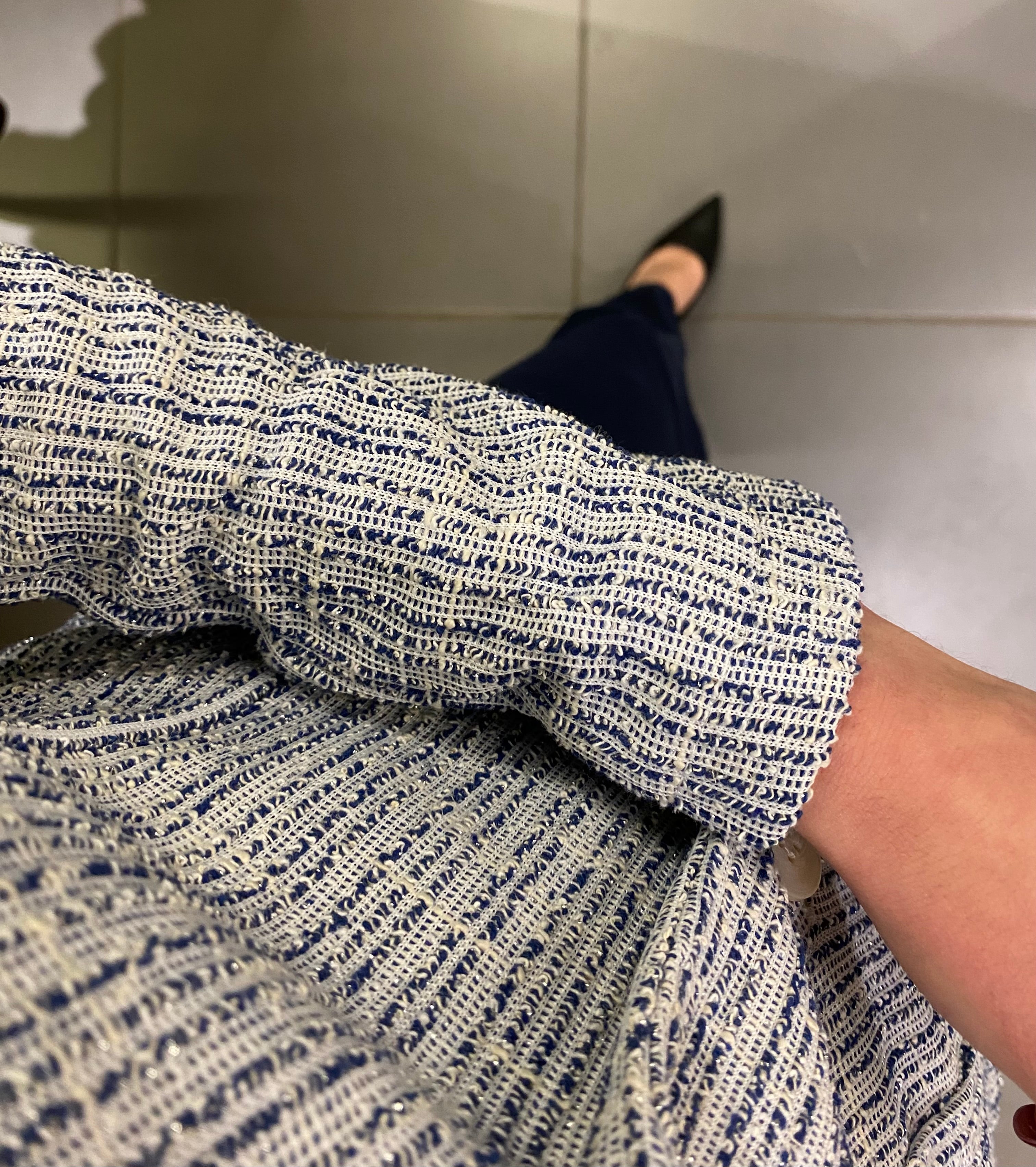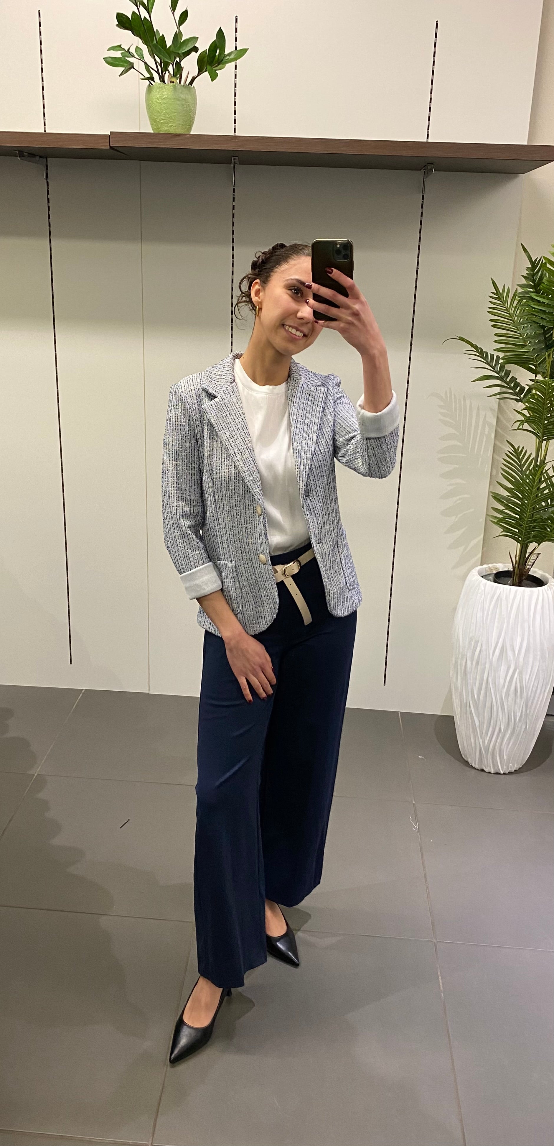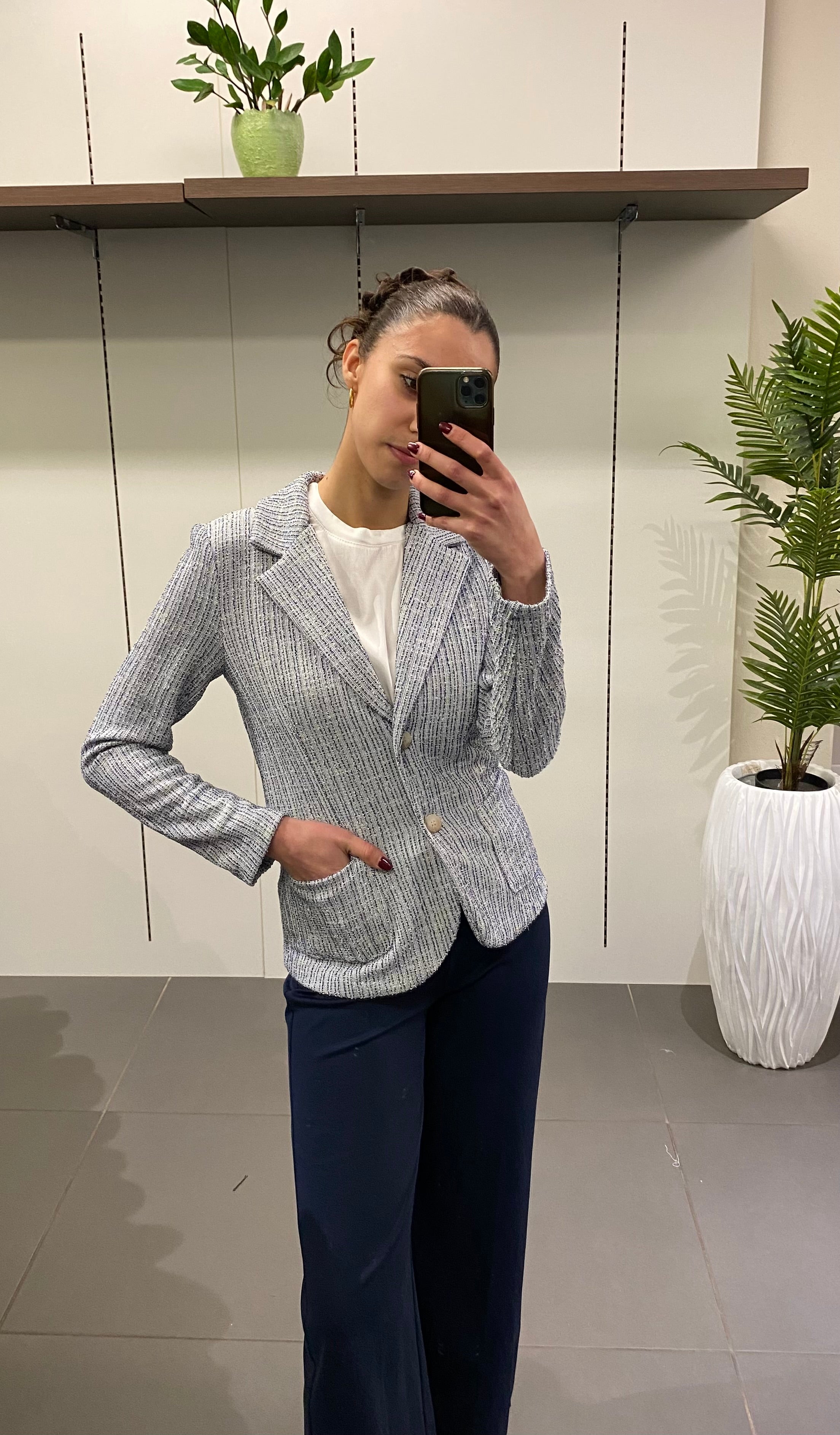 -Base bianca con ricami e rifiniture in blu e un punto di lurex