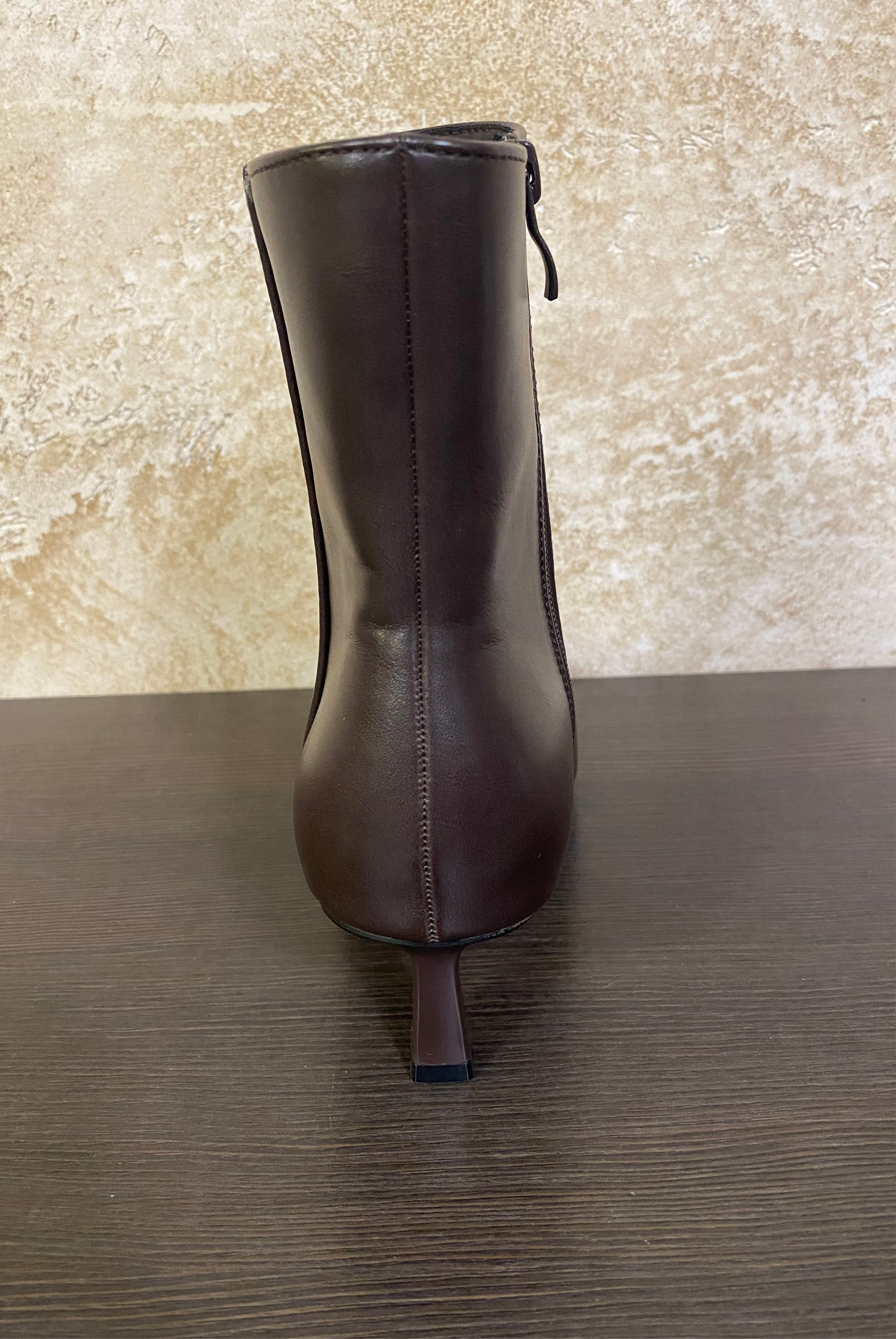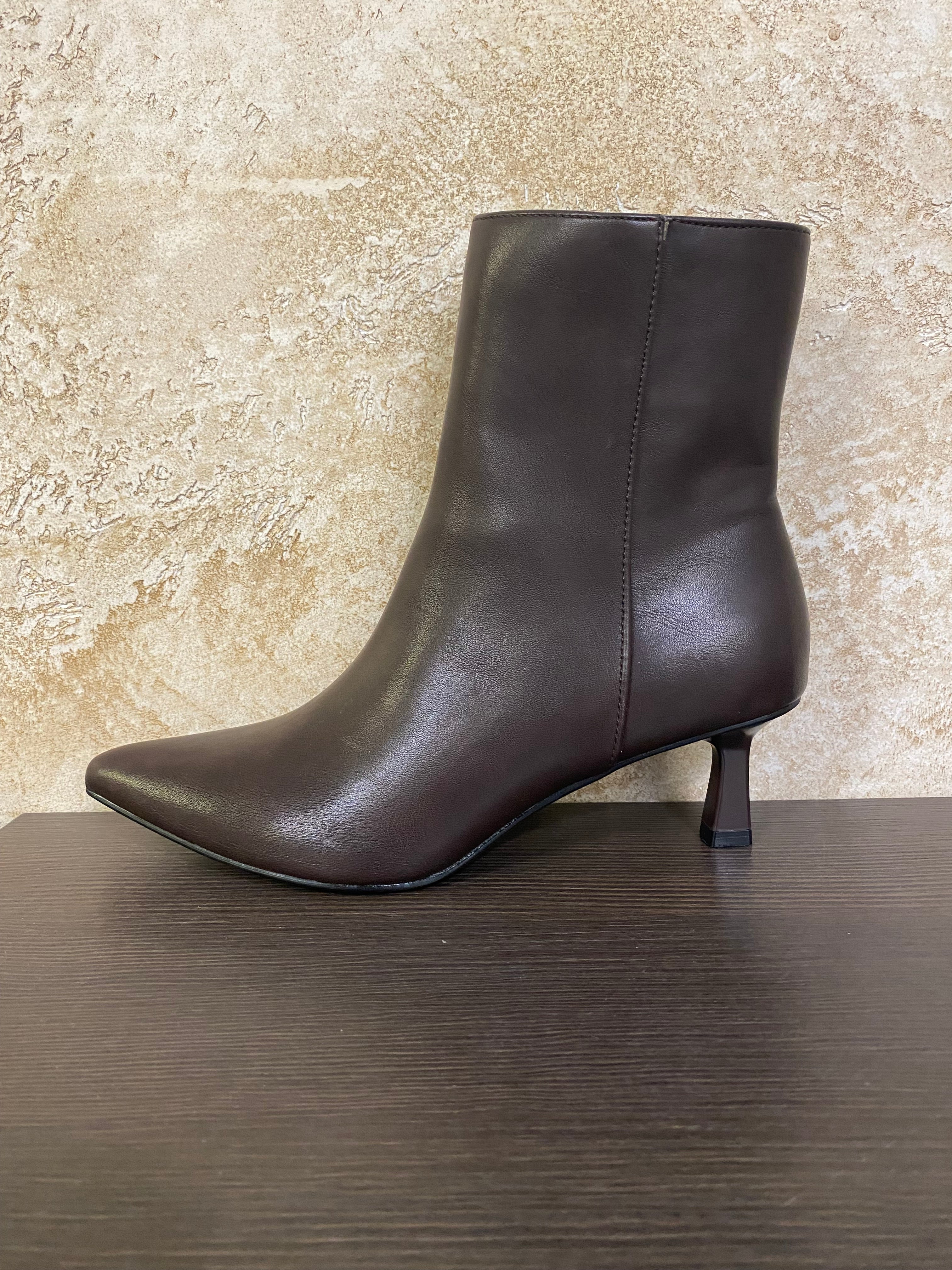 Stivaletto con tacco marrone in finta pelle a punta. Tacco alto 5 cm a stiletto. La scarpa è molto comoda perché la suola è dotata di un cuscinetto morbido che dà conforto e sostegno nella camminata. Ideale da portare con un jeans o con un vestito in una versione più elegante. Numeri dal 36 al 40.