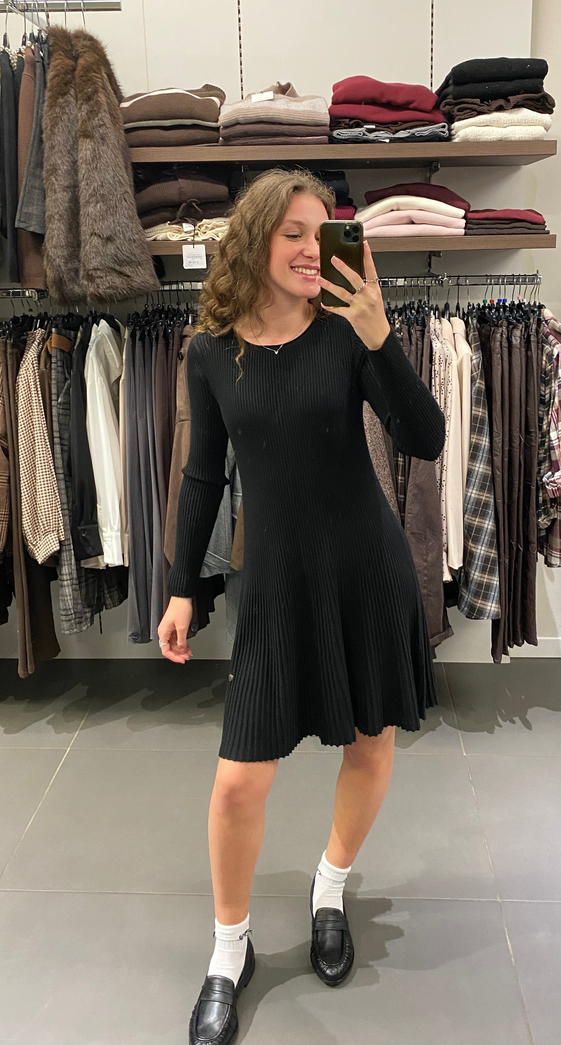 Abito svasato a manica lunga in costina maglia di viscosa. Tinta unita e disponibile in due varianti colore. Lunghezza media sopra il ginocchio con la parte sopra del busto più sfiancata e la gonna più morbida sotto aperta(fa quasi effetto ruota). Taglia unica e vestibilità dalla 40 alla 44.