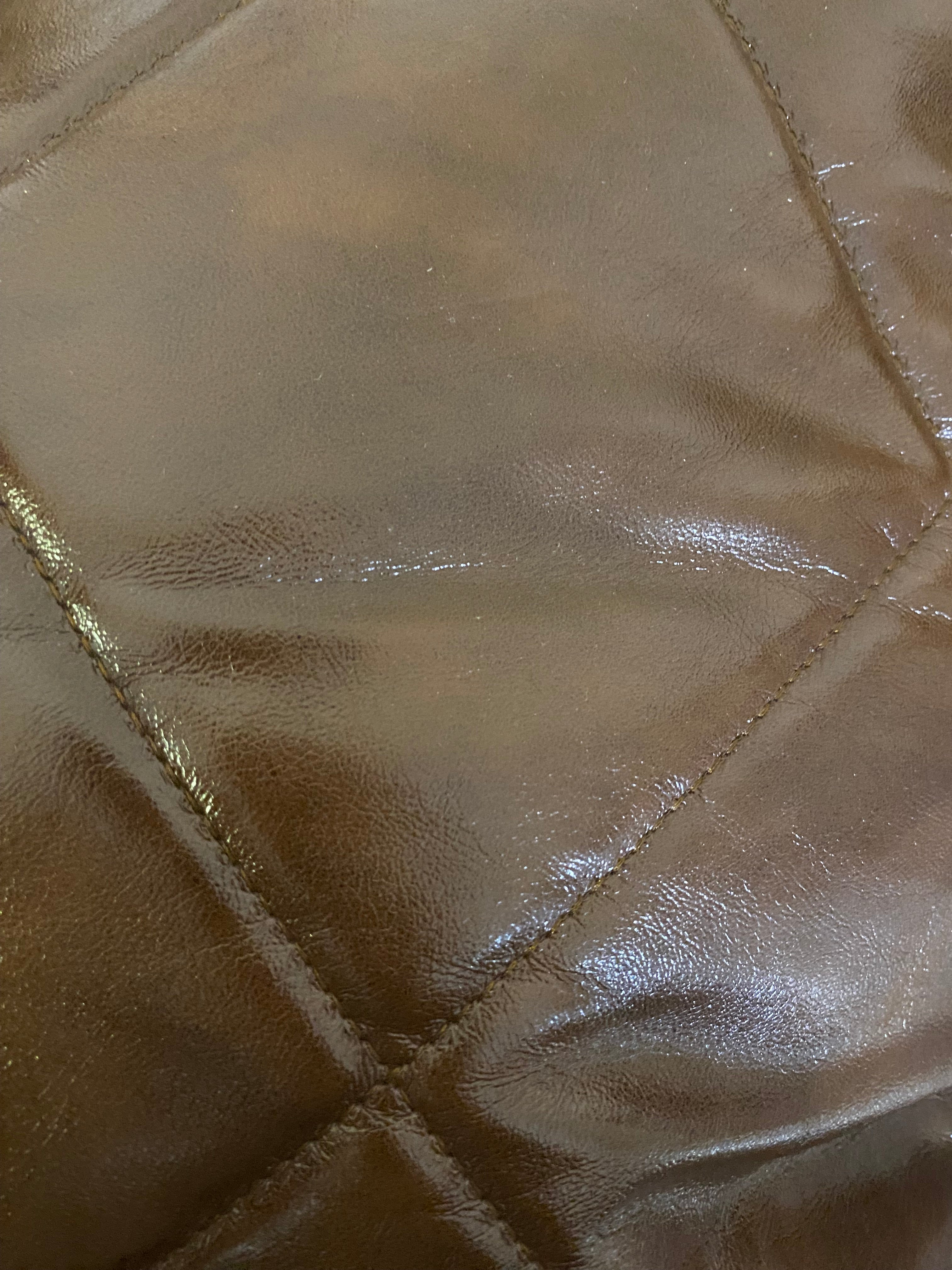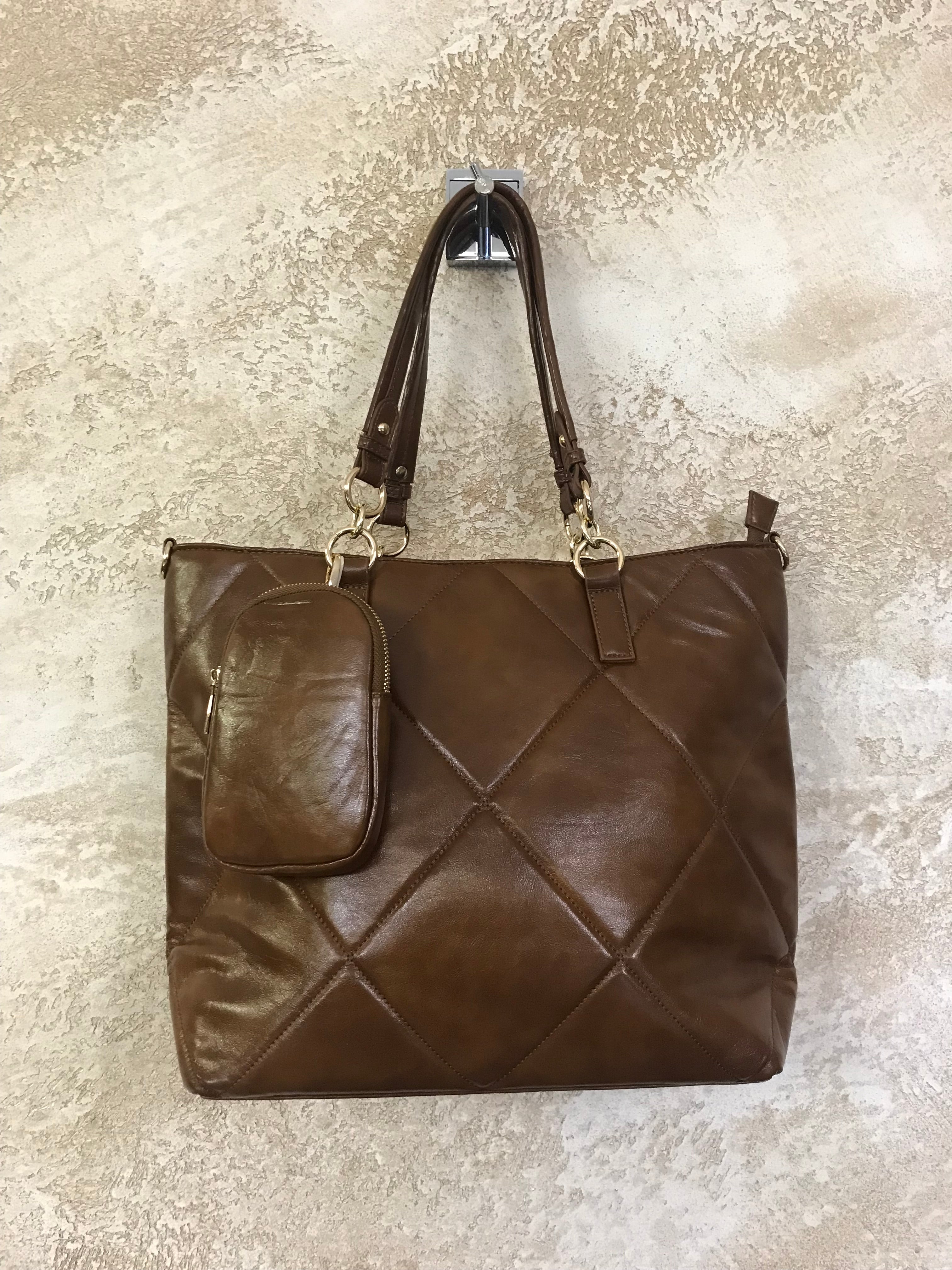 Borsa a spalla in finta pelle con finitura lucida, dettagli in oro, é presente un piccolo borsellino (staccabile) attaccato davanti sulla borsa. Chiusura a zip. Tracolla più lunga all’interno.