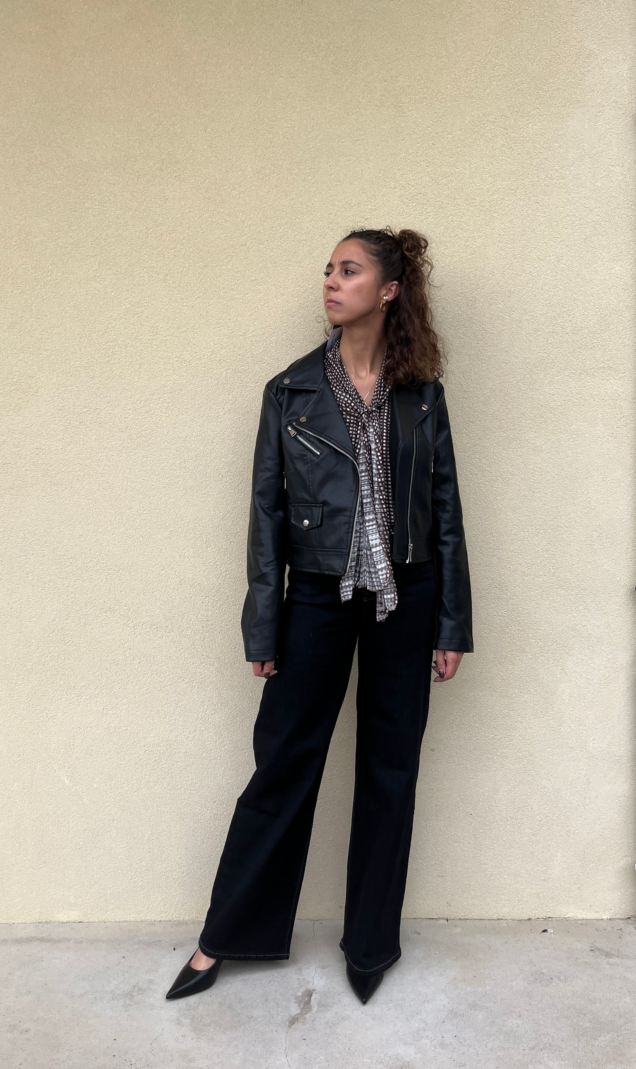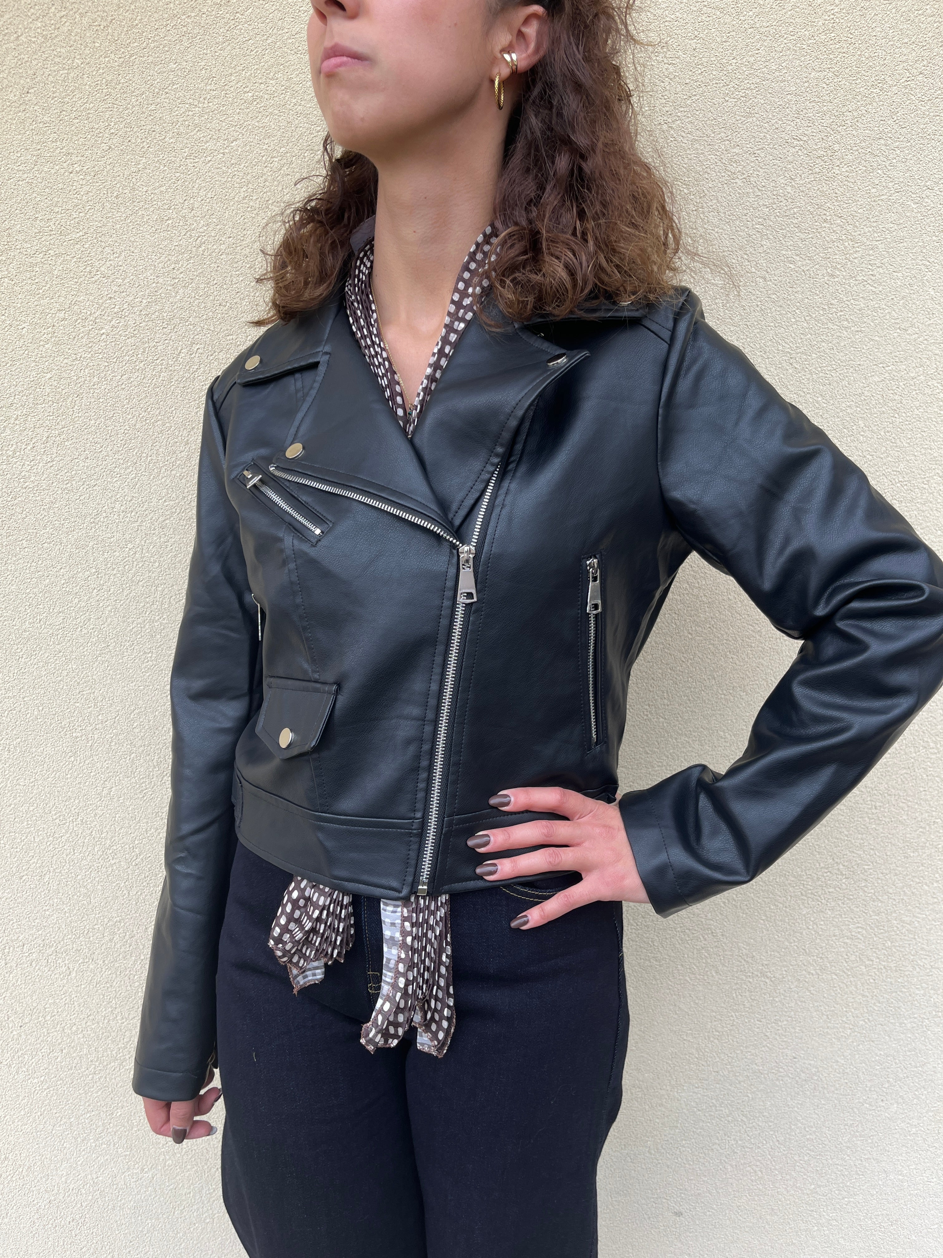 Giubbino a chiodo in ecopelle foderata corto. Girocollo con doppia zip color argento. Tasche con zip argento.