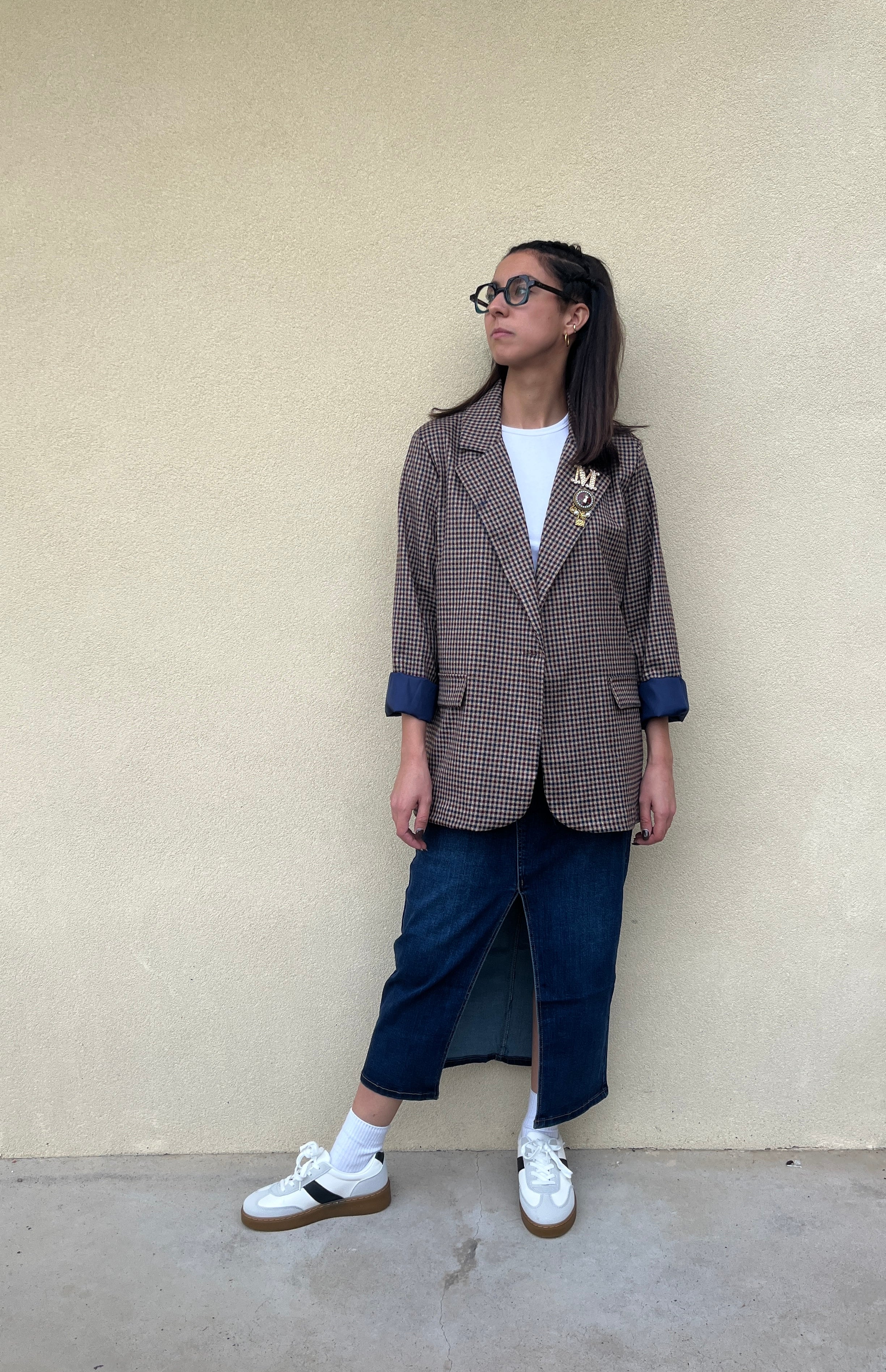 Gonna in denim, lunghezza midi dal lavaggio scuro. La gonna arriva ai polpacci e presenta uno spacco non eccessivamente alto sul davanti facendo intravedere le gambe slanciando la figura. Inoltre sul davanti presenta due tasche frontali e ha una chiusura zip e bottone. Molto elasticizzata a vita alta. Taglie dalla XS alla XL