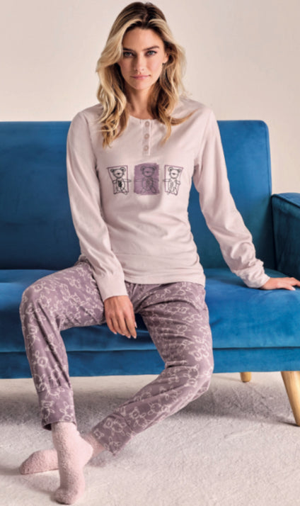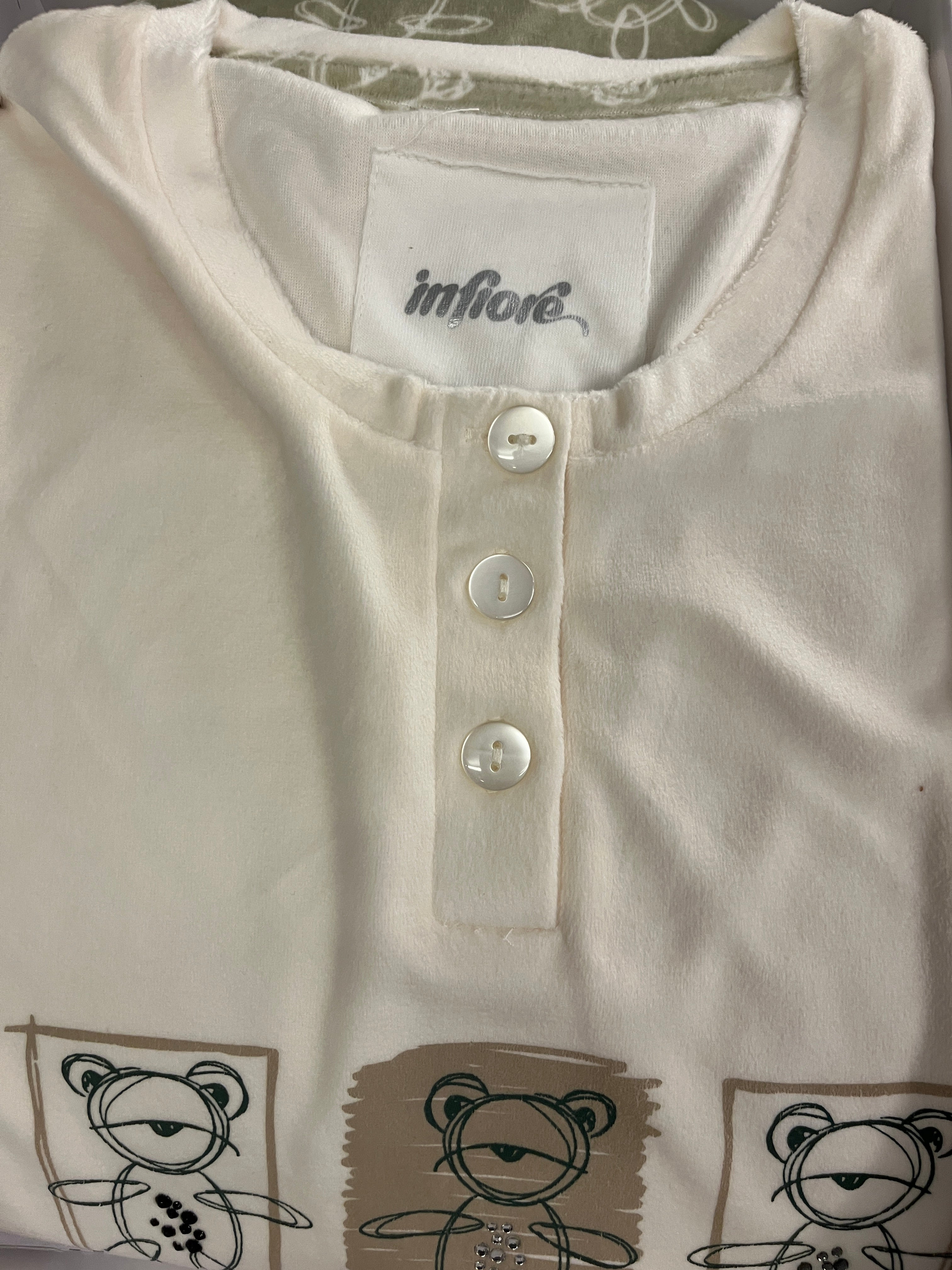 Pigiama in morbido e caldo microcoral INFIORE. Maglia a girocollo con 4 bottoncini, polsini sulle maniche stampa centrale teddy. Pantalone in fantasia con piccoli orsetti stilizzati, morbido elastico in vita e polsini al fondo. Taglie dalla S alla XL
