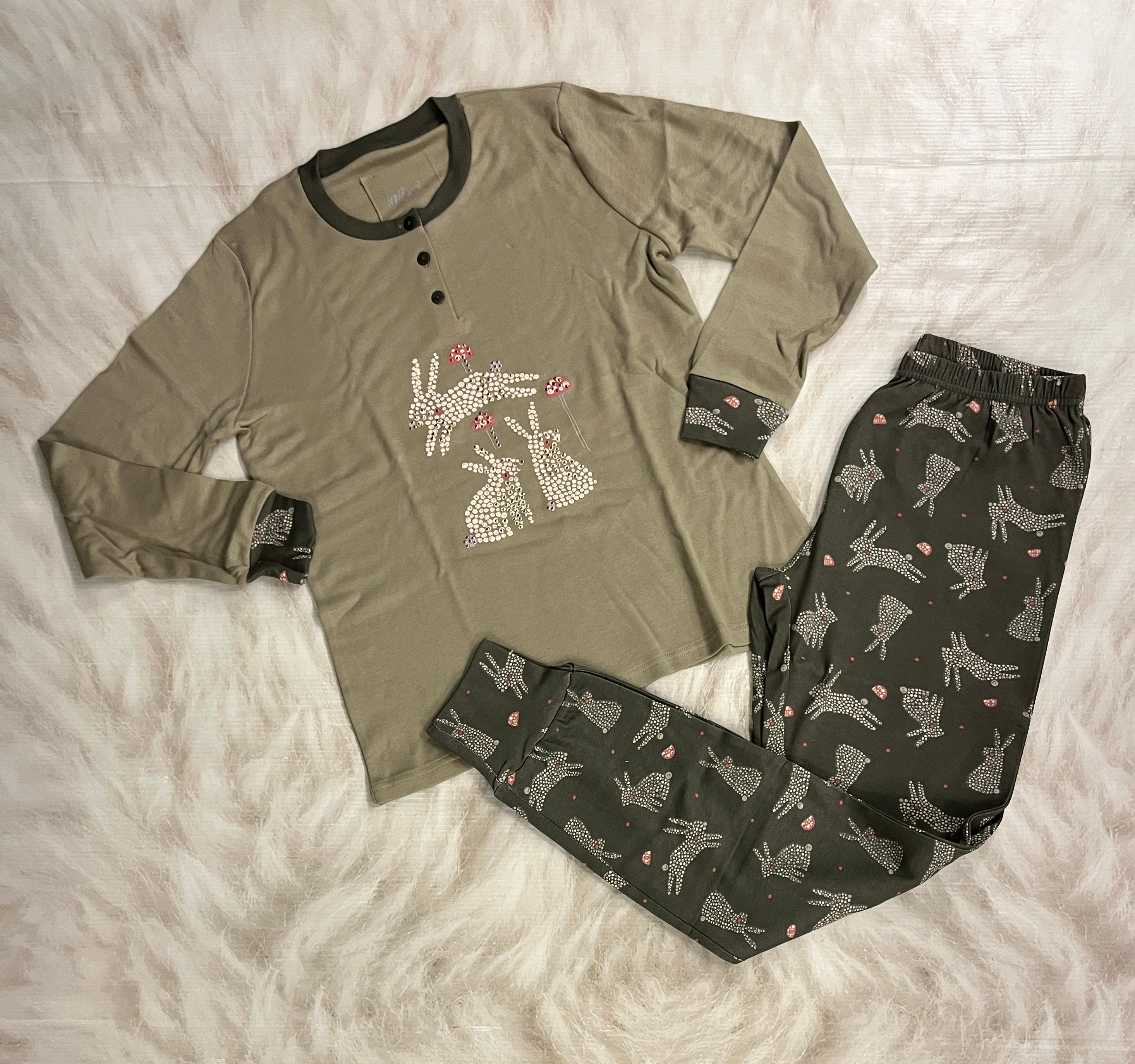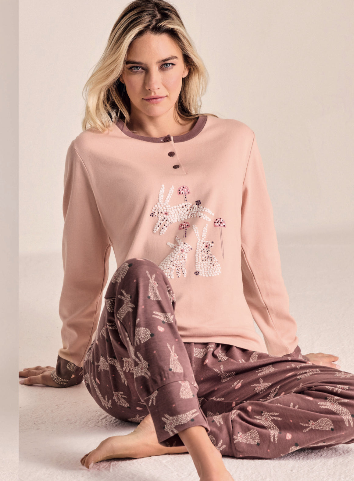 Pigiama in caldo cotone INFIORE. Maglia a girocollo con 3 bottoncini stampa centrale e applicazioni, profilo e polsini nella stessa fantasia del pantalone che riprende la stampa. Pantalone con morbido elastico in vita e polsini al fondo. Taglie dalla S alla XL.