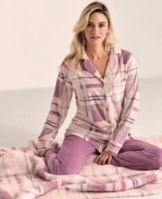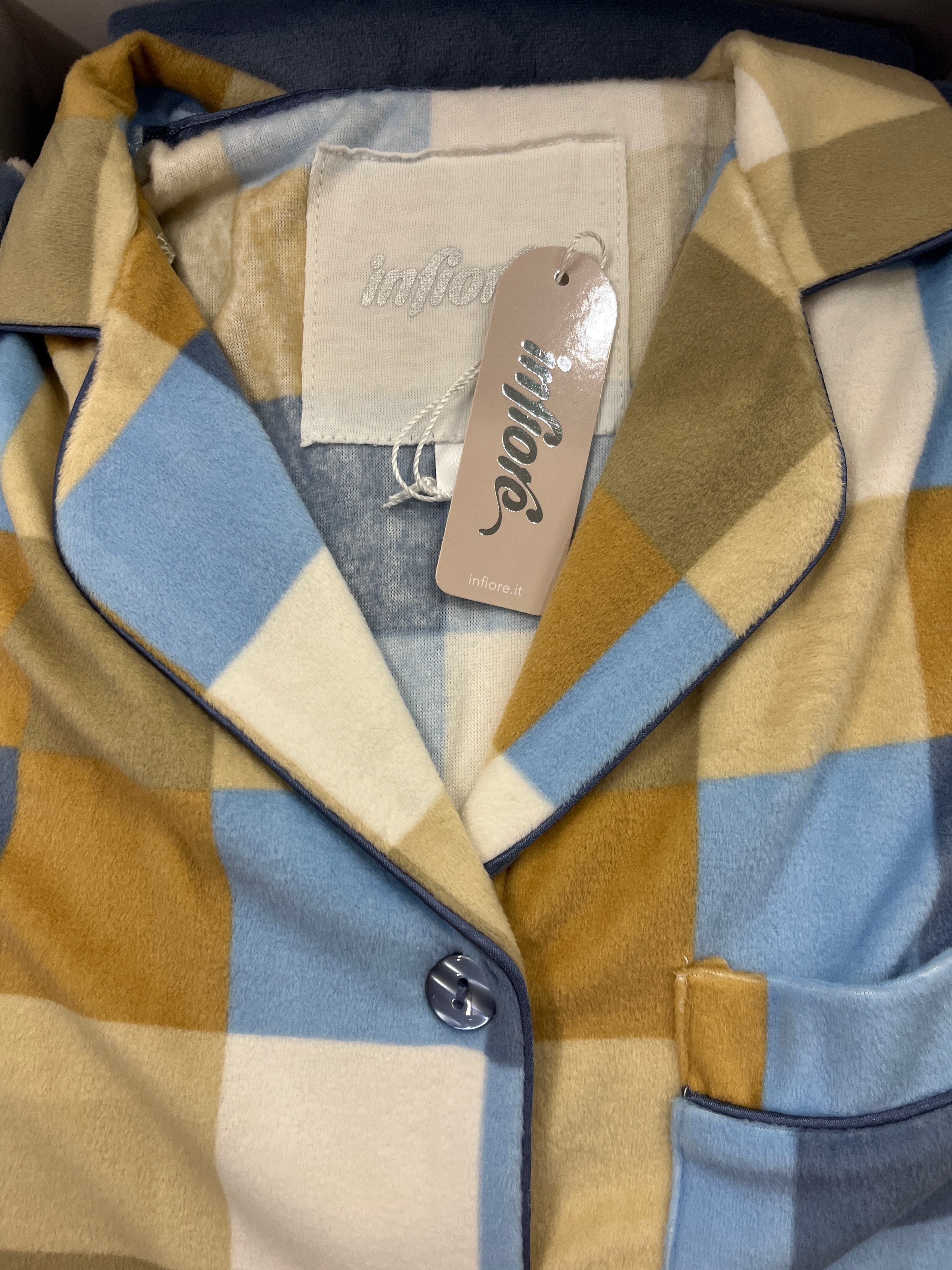 Pigiama in morbido e caldo microcoral INFIORE. Maglia in fantasia  con abbottonatura fono in fondo, collo a camicia e taschino laterale. Pantalone con morbido elastico in vita. Taglie dalla S alla XL