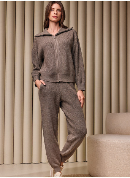 Pigiama effetto tuta in misto viscosa con lavorazione a costa. È composto da una maglia a felpa con zip e collo alto con un fascia che si stringe sotto altezza vita. Il pantalone modello jogging morbido ma non eccessivamente largo con polsino al fondo. Non è tanto lungo quindi arriva alla caviglia. Taglie S/M, M/L ed L/XL.
