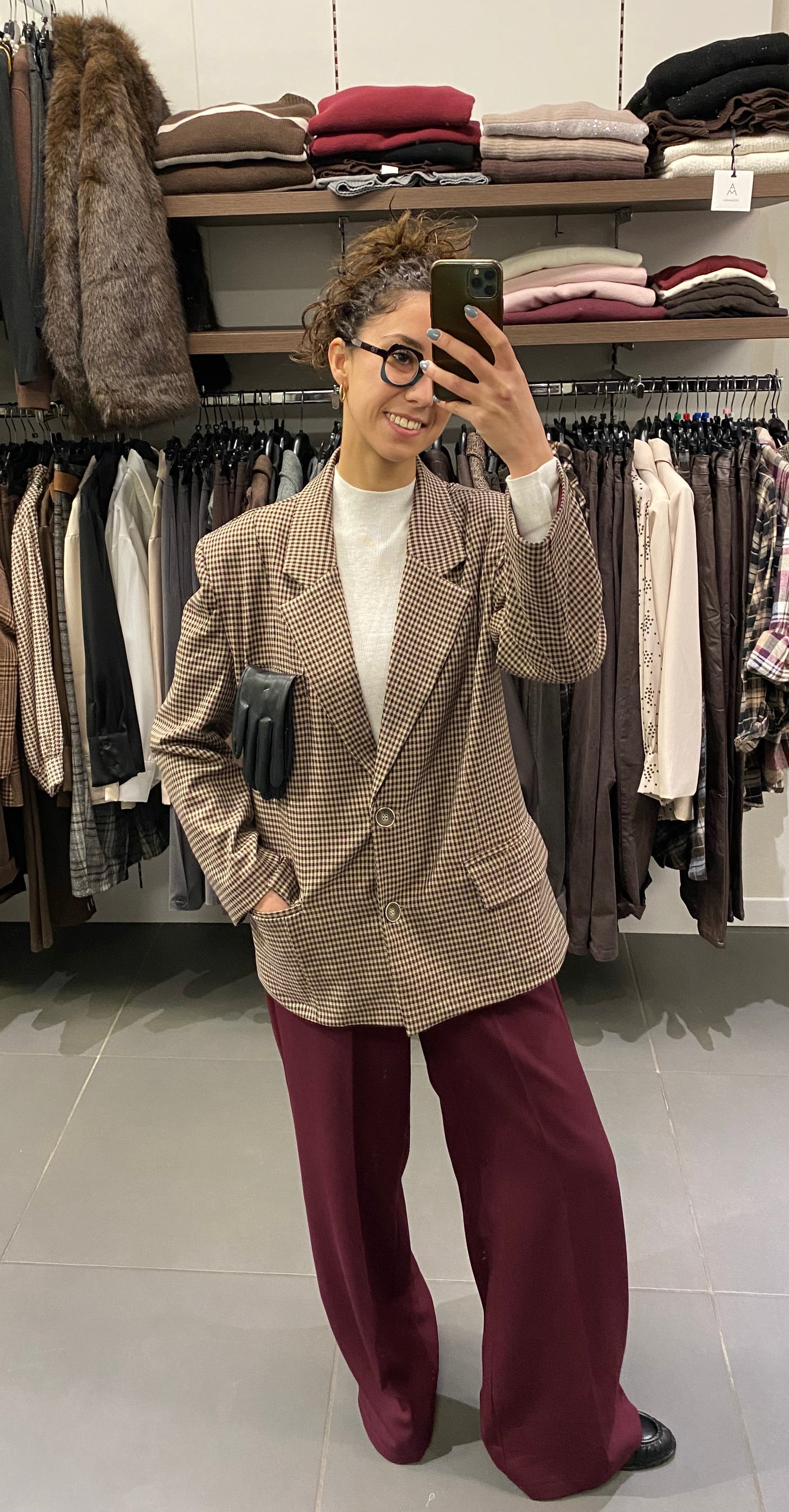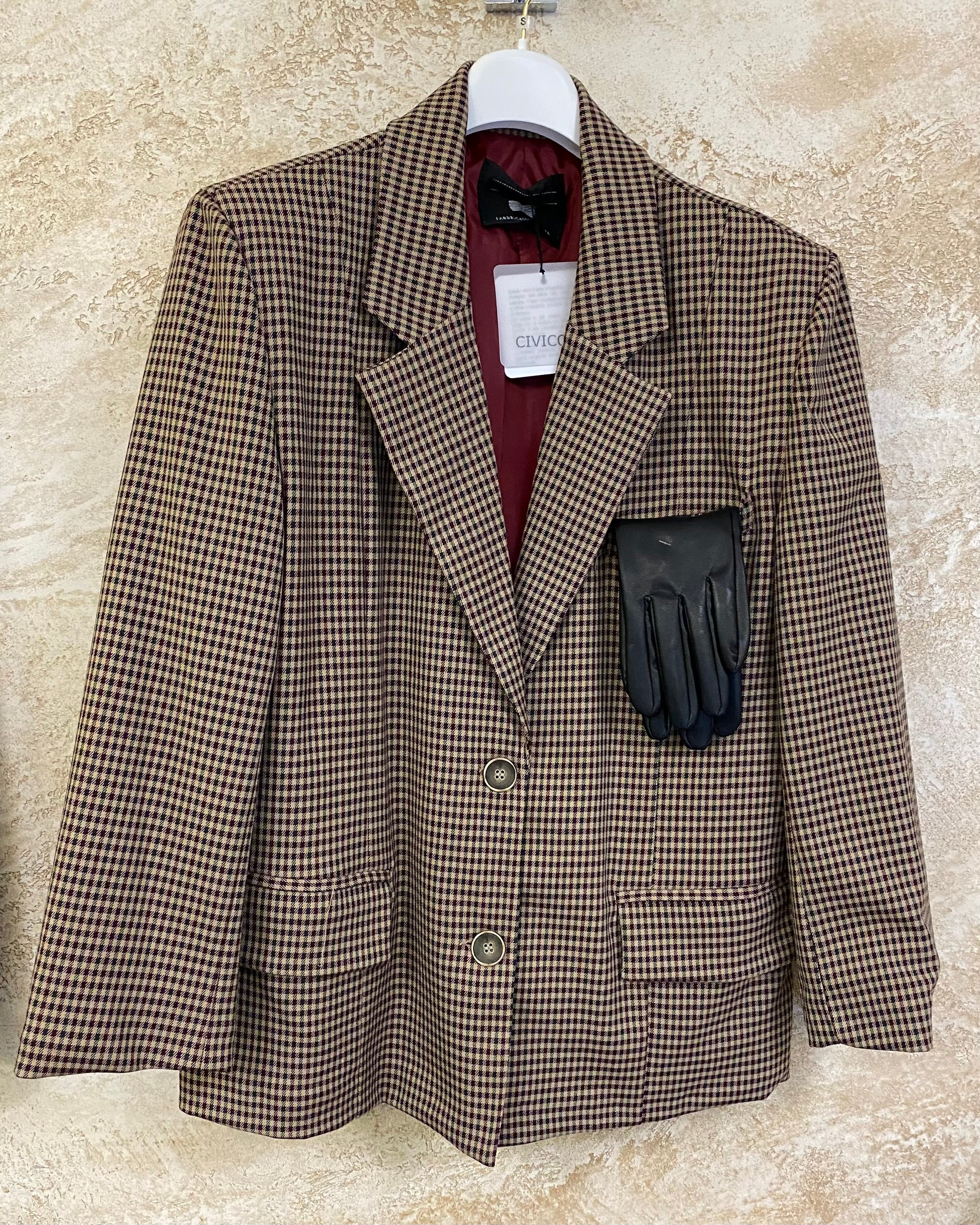 Blazer CIVICO a micro quadratini dal taglio over. La giacca è su base beige con i quadratini sui toni del nero e bordeaux, ha delle tasche in basso davanti e doppio bottone per chiuderla. È inoltre foderata e quindi è più pesantina per la stagione che sta arrivando. Incorporati alla giacca ci sono dei guanti in pelle che troverete rimovibili dalla tasca altezza seno. Disponibile in due taglie S(40-42)ed M(42-44)