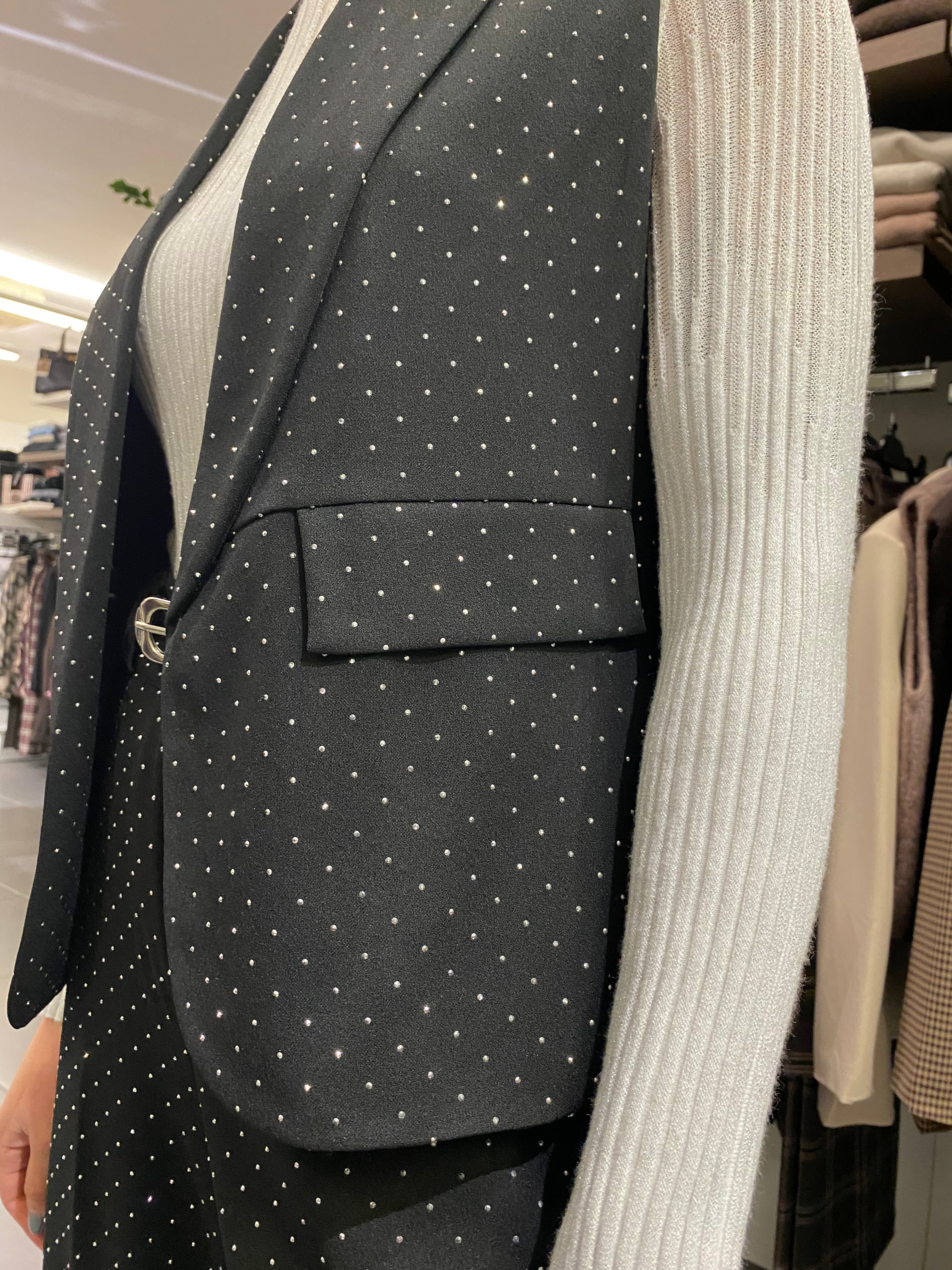 Gilet in tinta unita con strass argentati applicati. Il gilet ha una media lunghezza che poggia sulle tasche, ha finte taschine altezza fianchi ed è foderato. Bello da abbinare con il suo pantalone oppure portato spezzato con jeans e tacco per sdrammatizzarlo. Taglie S/M ed M/L.