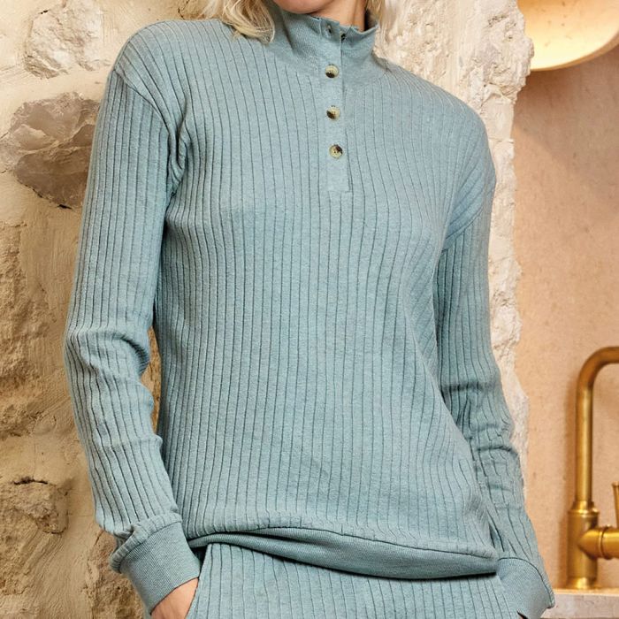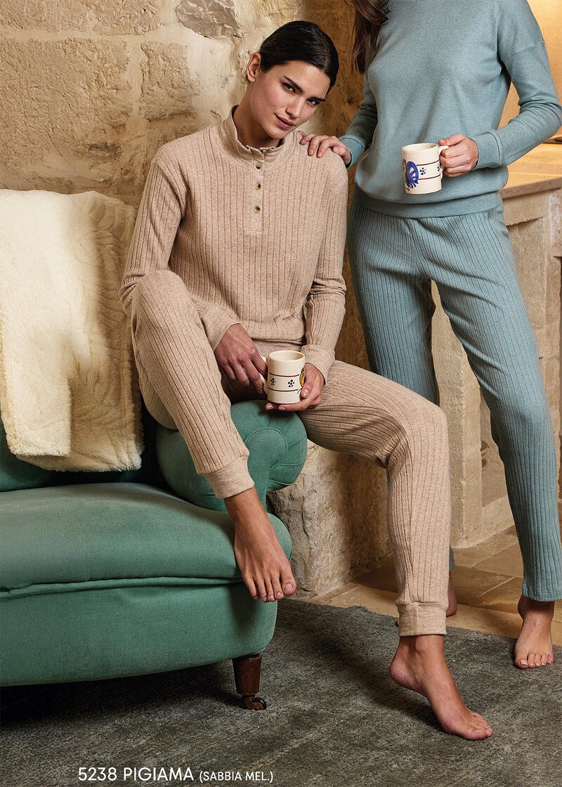 Pigiama lungo tutto in costa in morbida e calda viscosa, tinta unita con effetto mélange. Maglia con colletto a serafino, pantalone vestibilità asciutta con polsini in fondo e con tasche laterali.