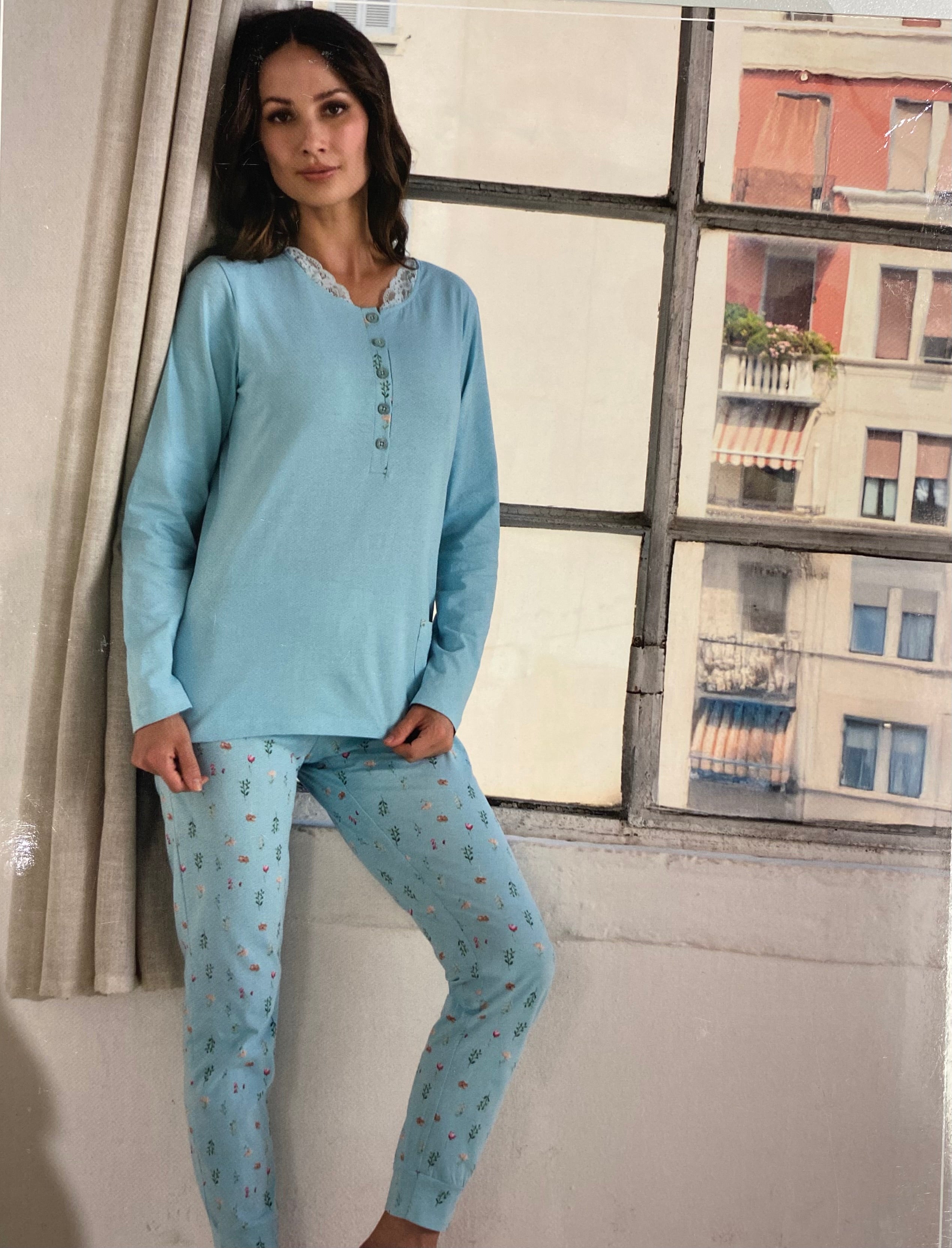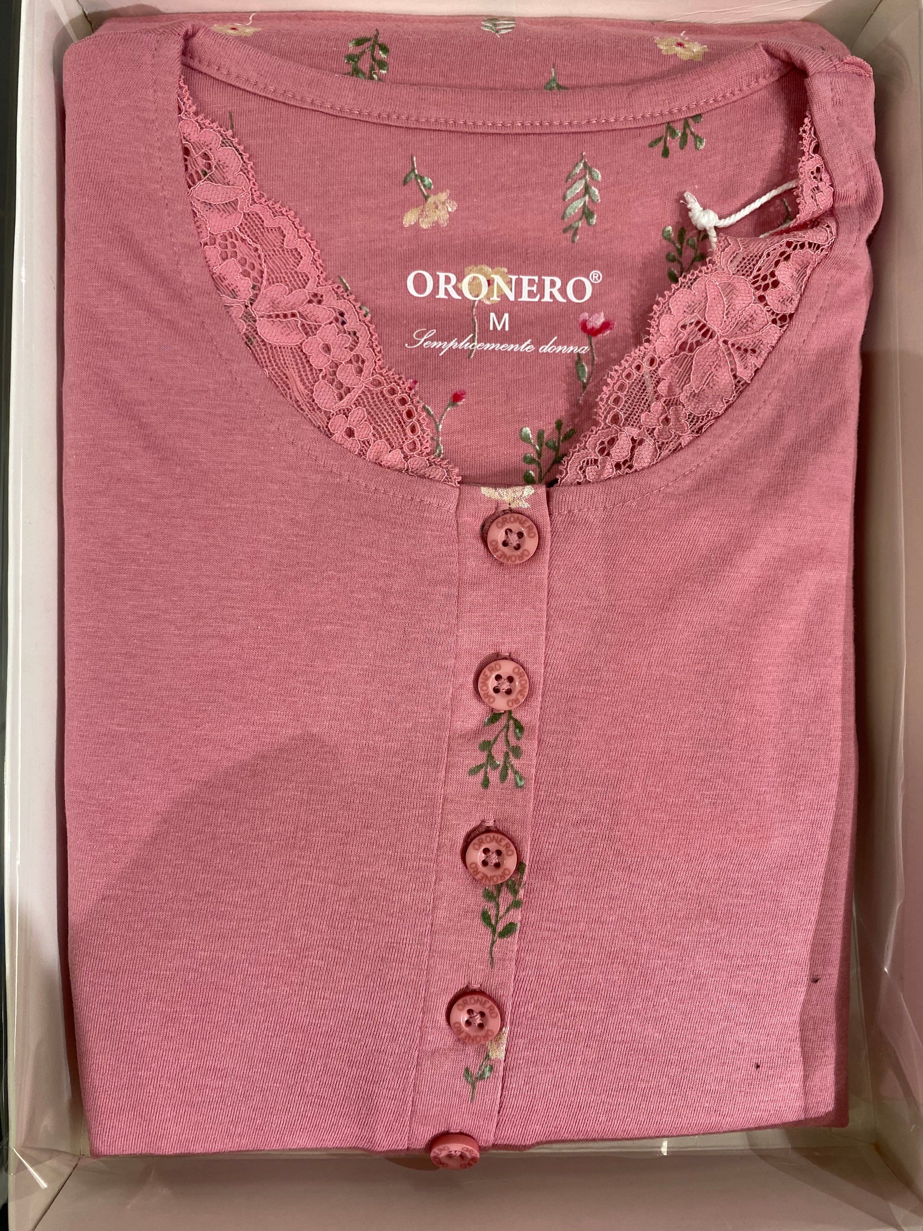 Pigiama ORONERO lungo donna in cotone. La maglia è un girocollo con inserto in pizzo e presenta un collo a serafino con 5 bottoncini sul davanti. In tinta unita con una leggera fantasia a fiori lungo i bottoni. Il pantalone ha tutto elastico in cintura e i polsini a fantasia a fiori. Disponibile in sue varianti colore. Taglie dalla M alla XXL.