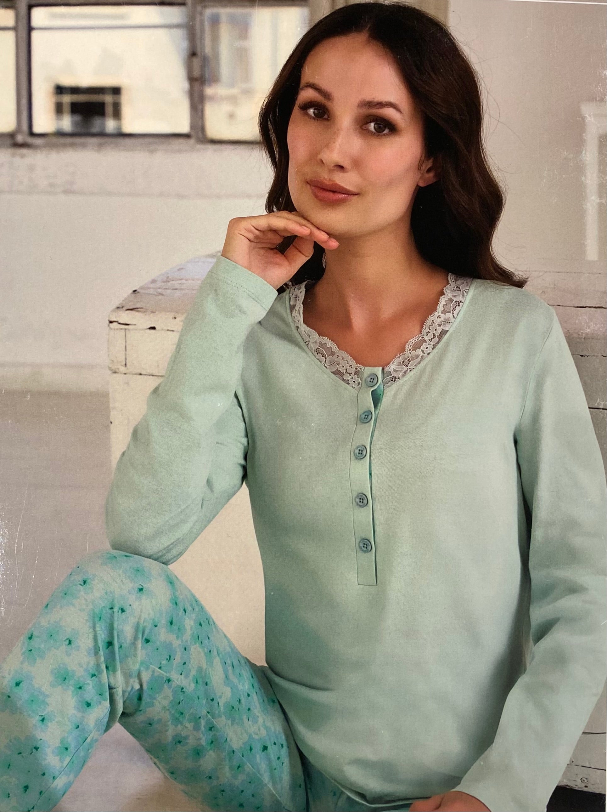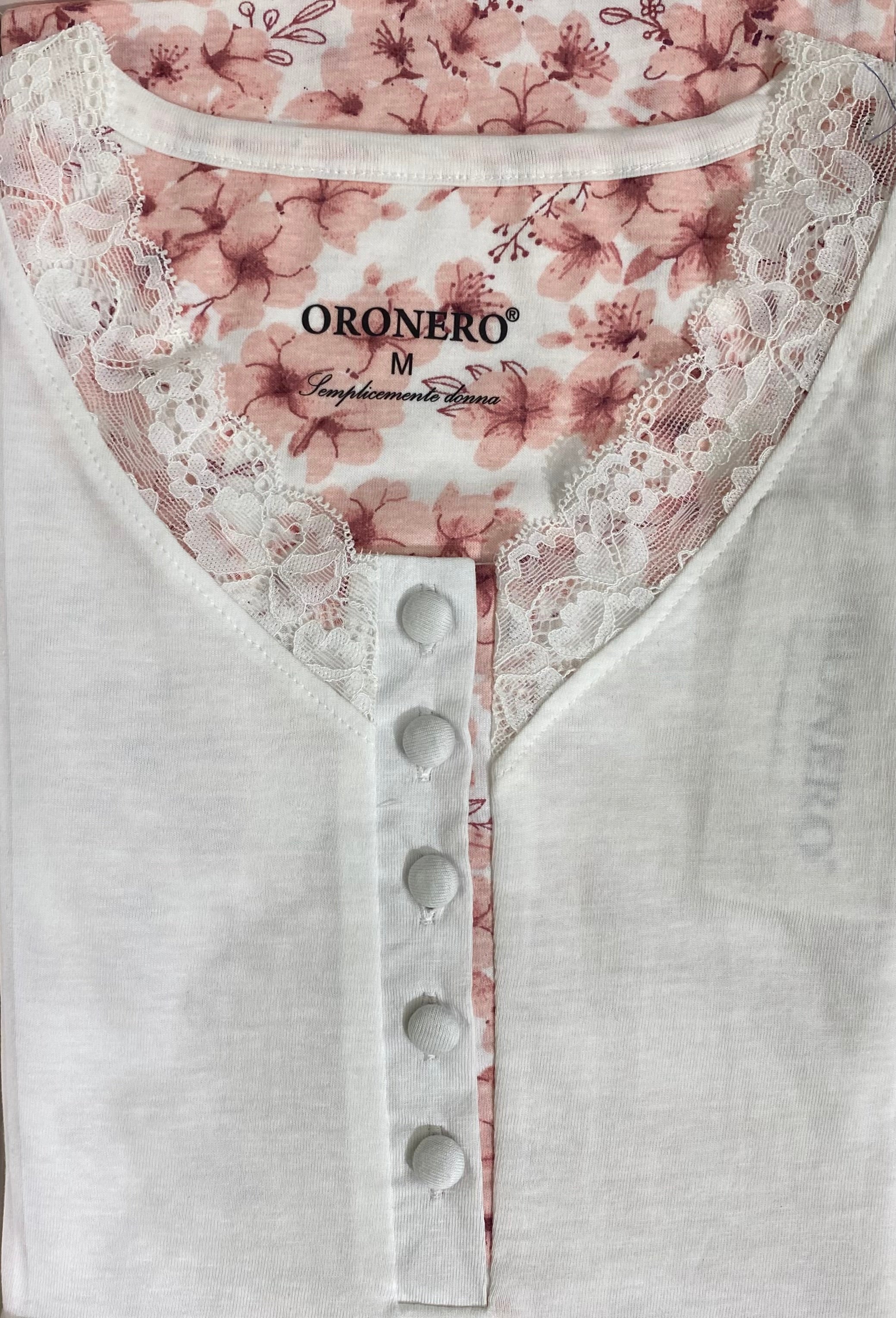 Pigiama ORONERO lungo donna in cotone. La maglia è in tinta unita ed ha uno scollo leggermente a V con inserto in pizzo. Inoltre presenta un collo a serafino con cinque bottoncini sul davanti. Il pantalone ha tutto l’elastico in cintura e i polsini, tutto a fantasia floreale. Disponibile in due varianti colore. Taglie dalla M alla XXL.