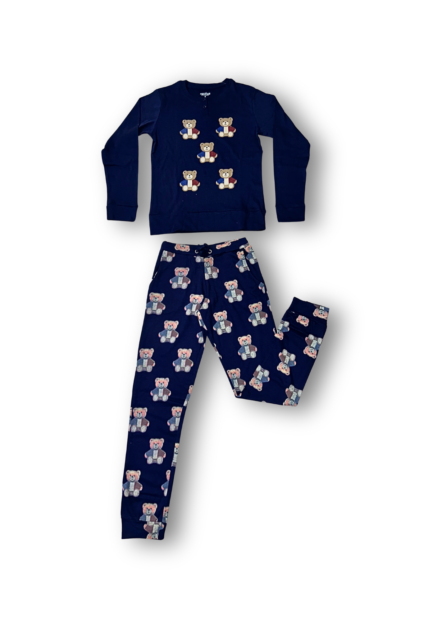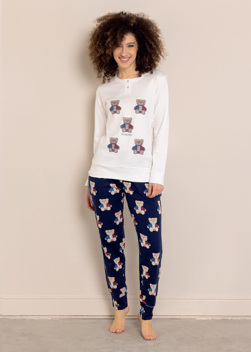 Pigiama in caldo cotone girocollo in fantasia orsetti. La maglia a manica lunga ha il collo a serafino con i 2 bottoni e i polsini e presenta 5 orsetti stampati con applicato sopra dei brillantini tono su tono. Il pantalone in fantasia con orsetti stampati ha tutto elastico in cintura, tasche laterali e sul fondo presenta i polsini. Disponibile in due colori: turto blu oppure maglio panna e pantalone blu. Taglie dalla S alla XL.