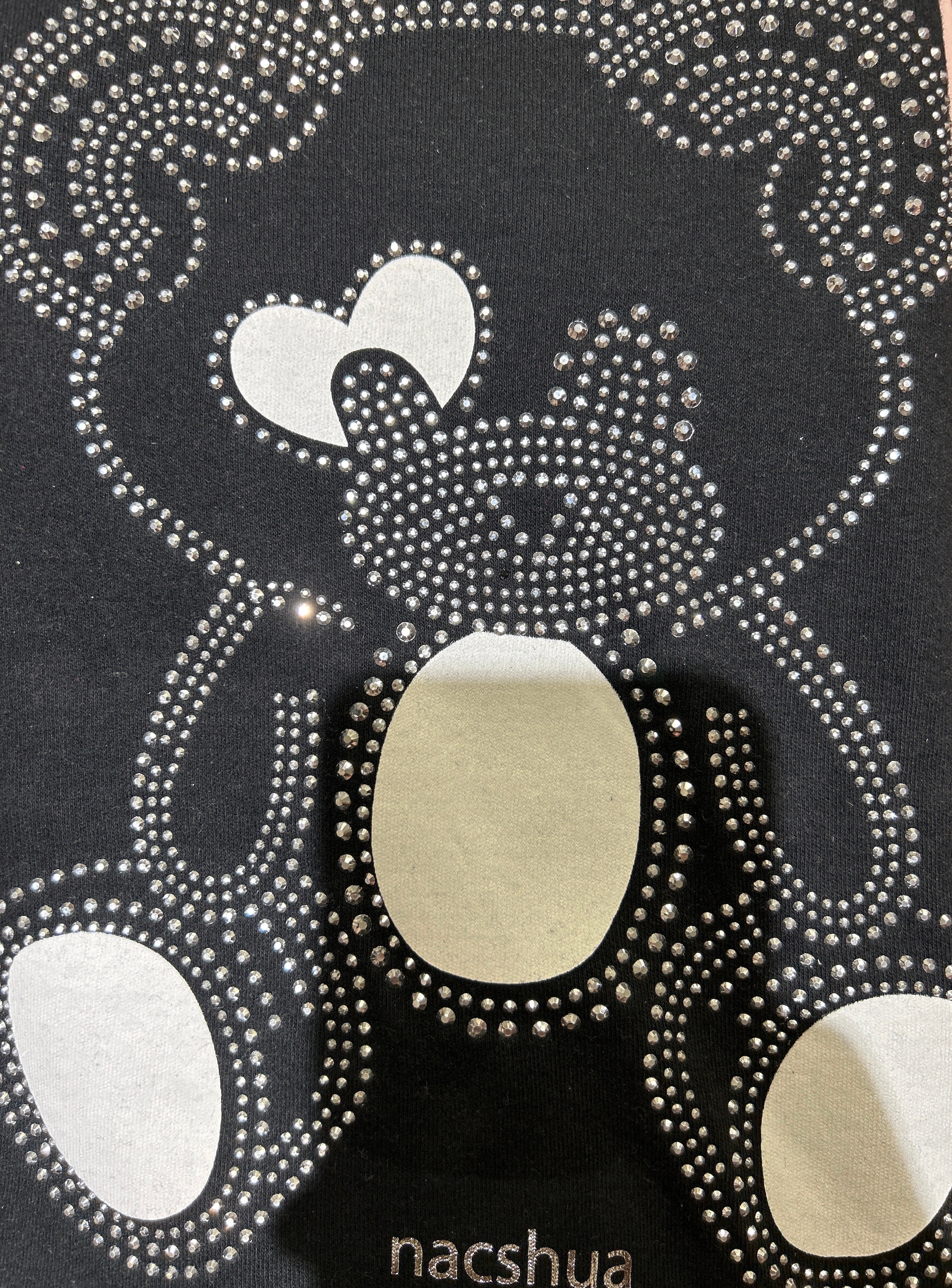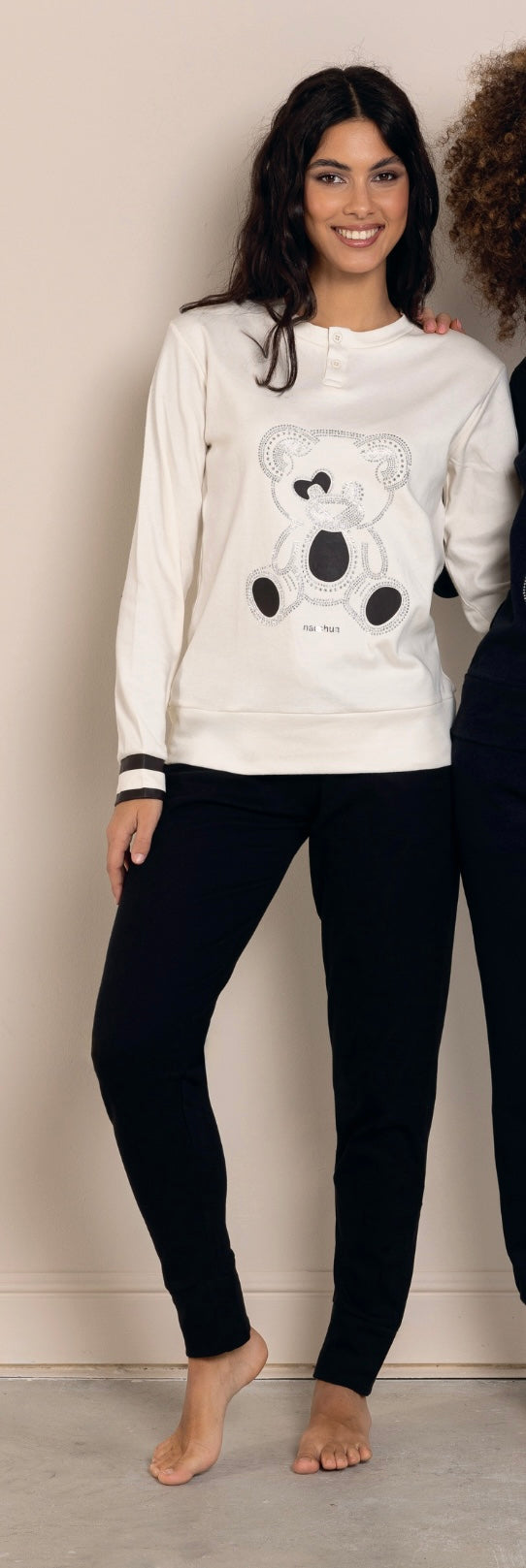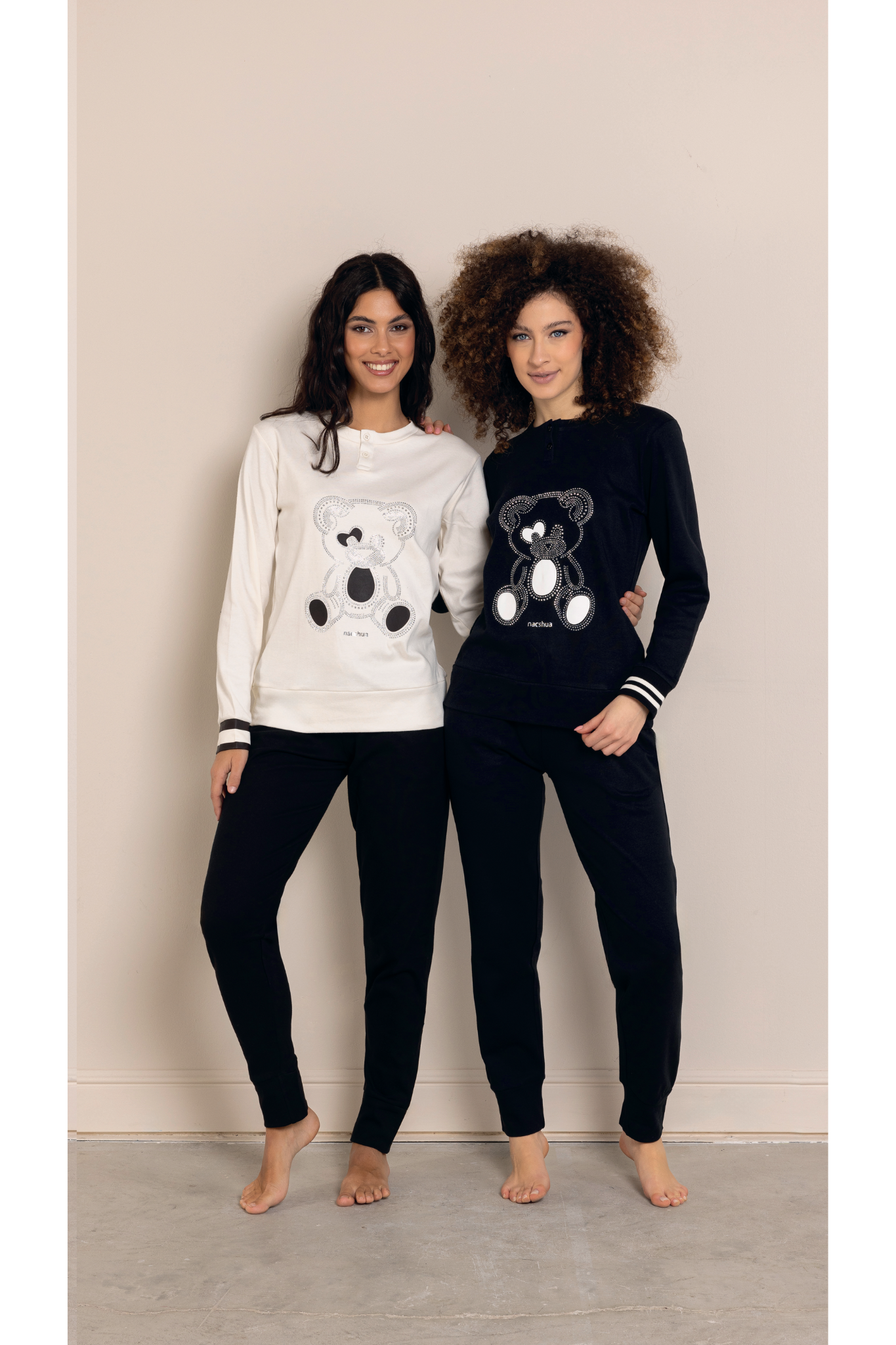 Pigiama in caldo cotone girocollo con Orsetto bordato da brillantini. La maglia a manica lunga ha il collo a serafino con i 2 bottoni e i polsini rigati sulla manica e presenta un Orsetto bordato da brillantini e stampa sul davanti. Il pantalone in tinta unita ha tutto elastico in cintura, tasche laterali e sul fondo presenta i polsini. Disponibile in due colori: turto nero oppure maglio panna e pantalone nero. Taglie dalla S alla XL.