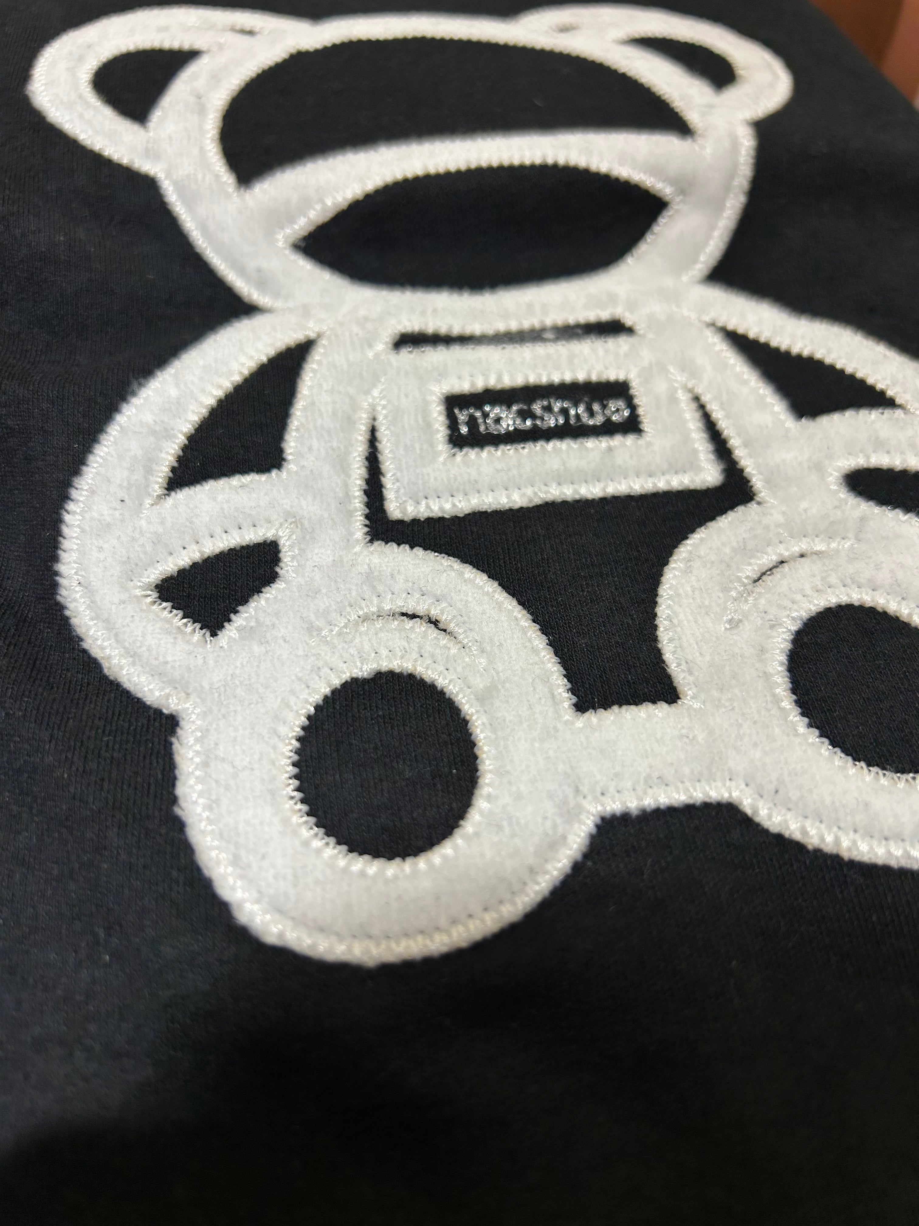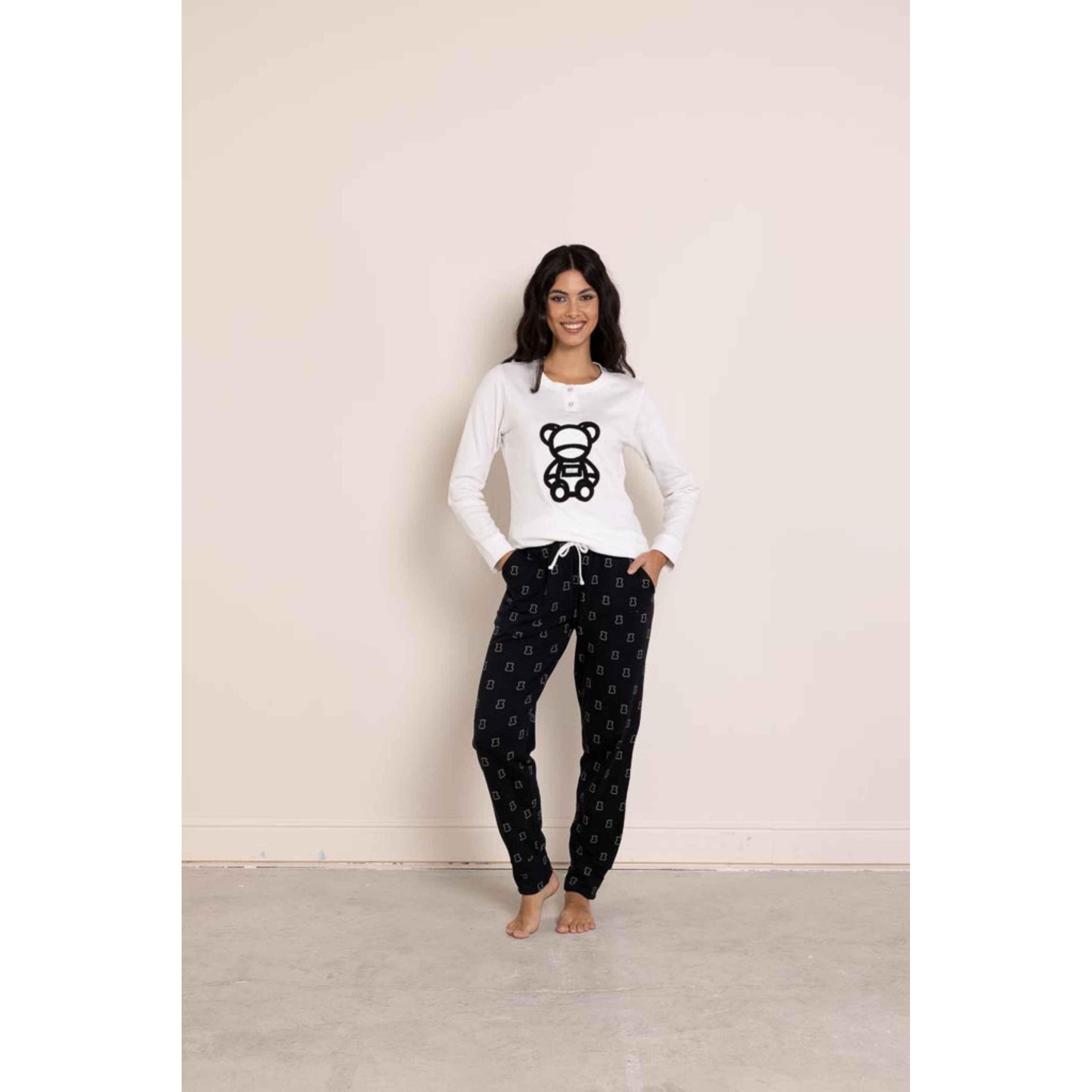 Pigiama in caldo cotone girocollo con Orsetto ricamato. La maglia a manica lunga ha il collo a serafino con i 2 bottoni e i polsini e presenta un ricamo sul davanti. Il pantalone in fantasia con piccoli orsetti ha tutto elastico in cintura, tasche laterali e sul fondo presenta i polsini. Disponibile in due colori: turto nero oppure maglio panna e pantalone nero. Taglie dalla S alla XL.