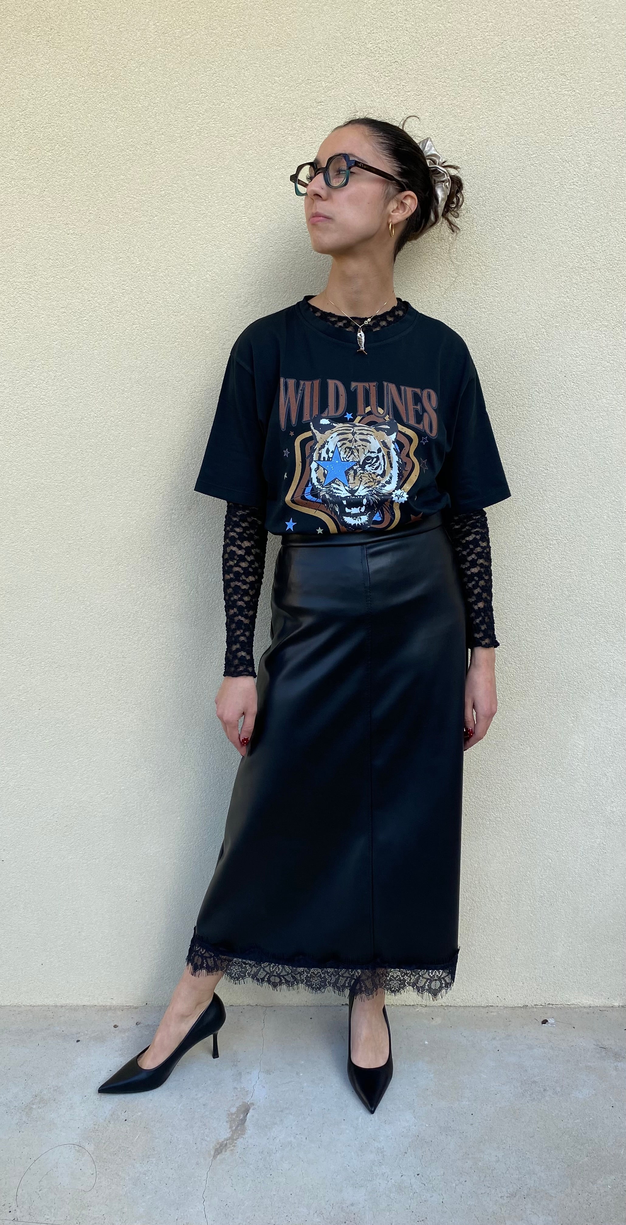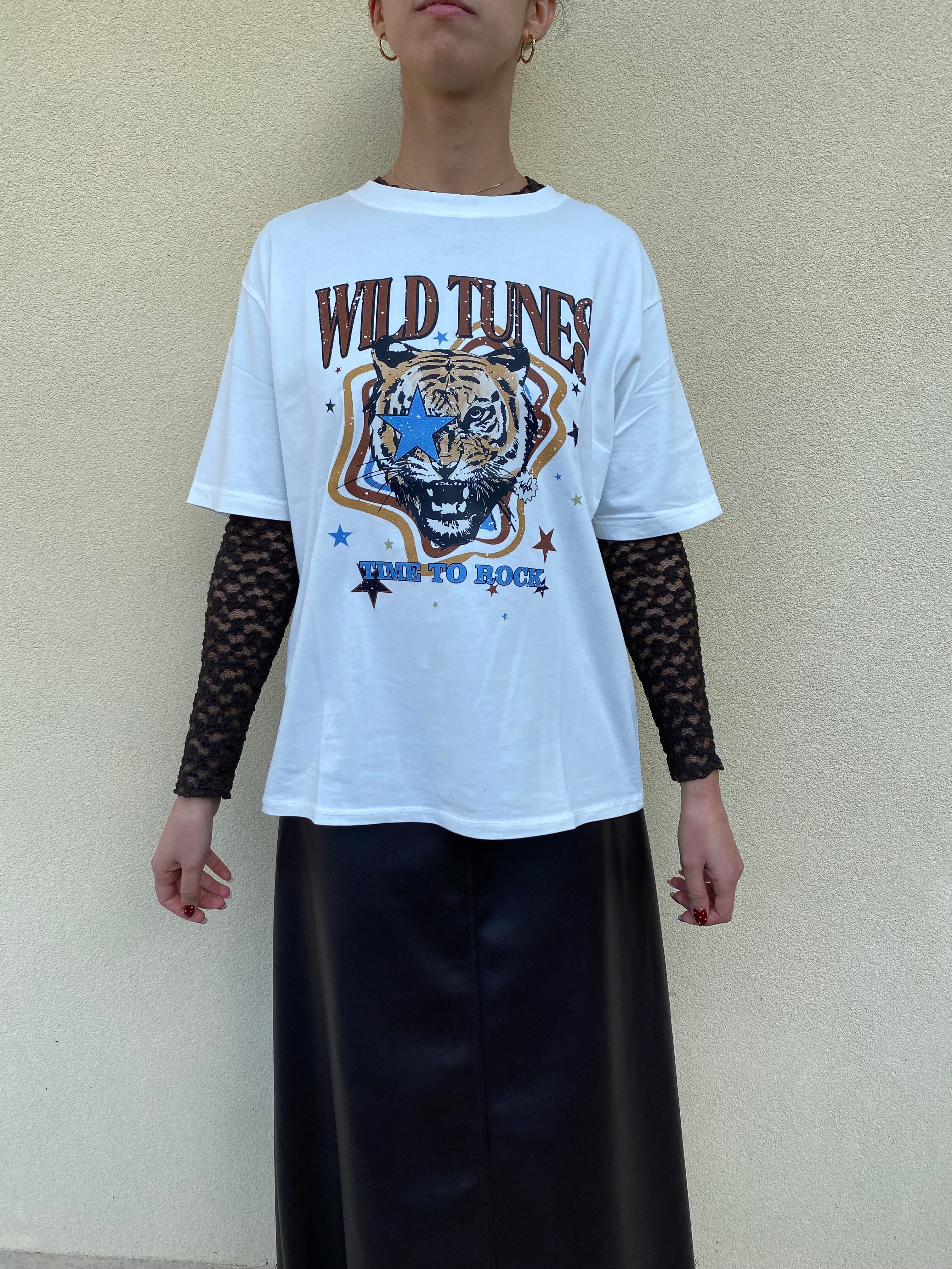 T shirt basica in cotone manica corta con stampa frontale. La t shirt è presente in due varianti colore: su base bianca o base nera. Davanti presenta una stampa grande colorata con scritta e il disegno di una tigre. La maglia è un girocollo ed ha una bella lunghezza. Bella da portare semplice con il jeans e una giacca oppure in questa versione in foto un po’ più particolare. Taglia unica e vestibilità dalla 40 alla 48.