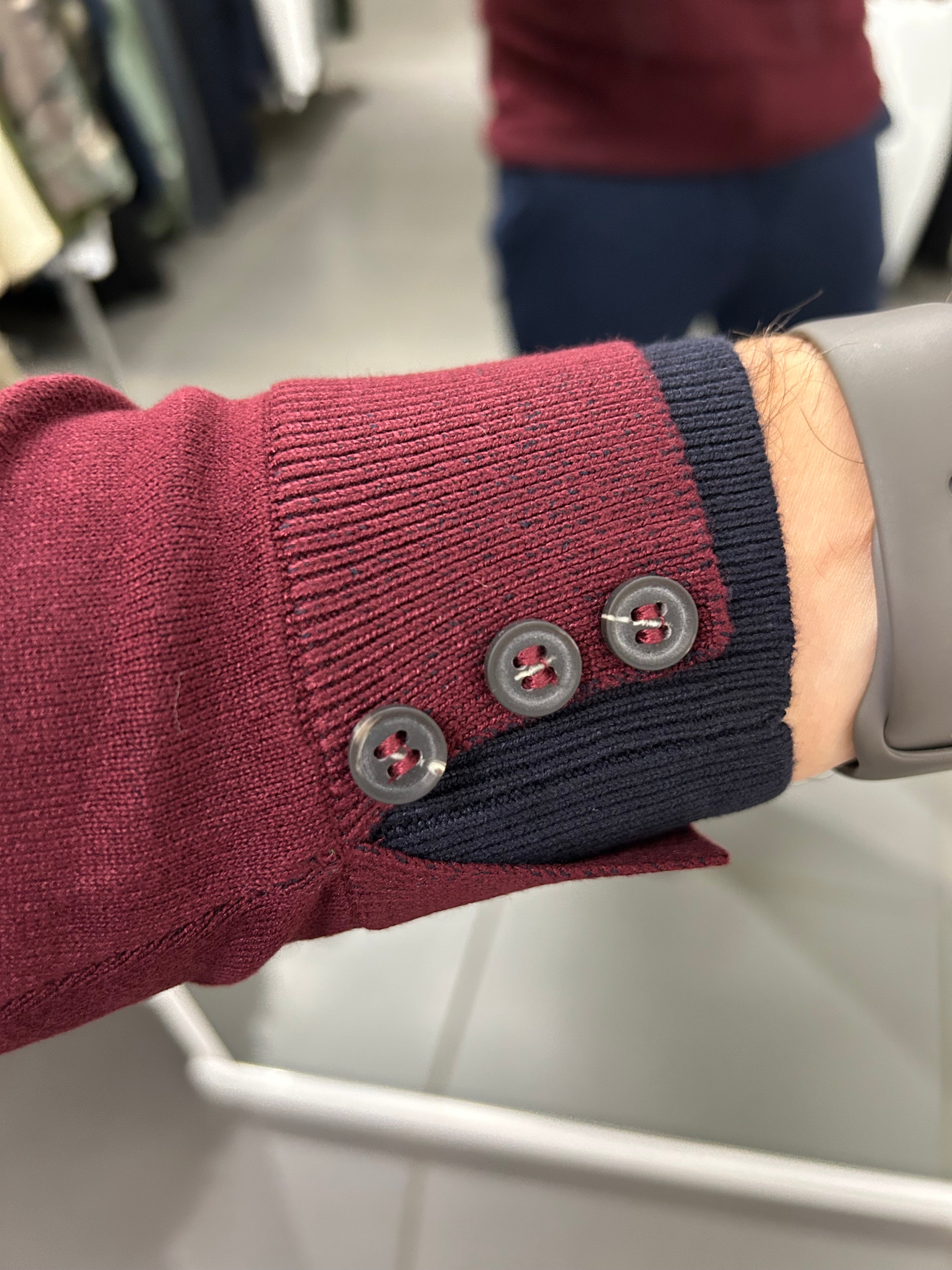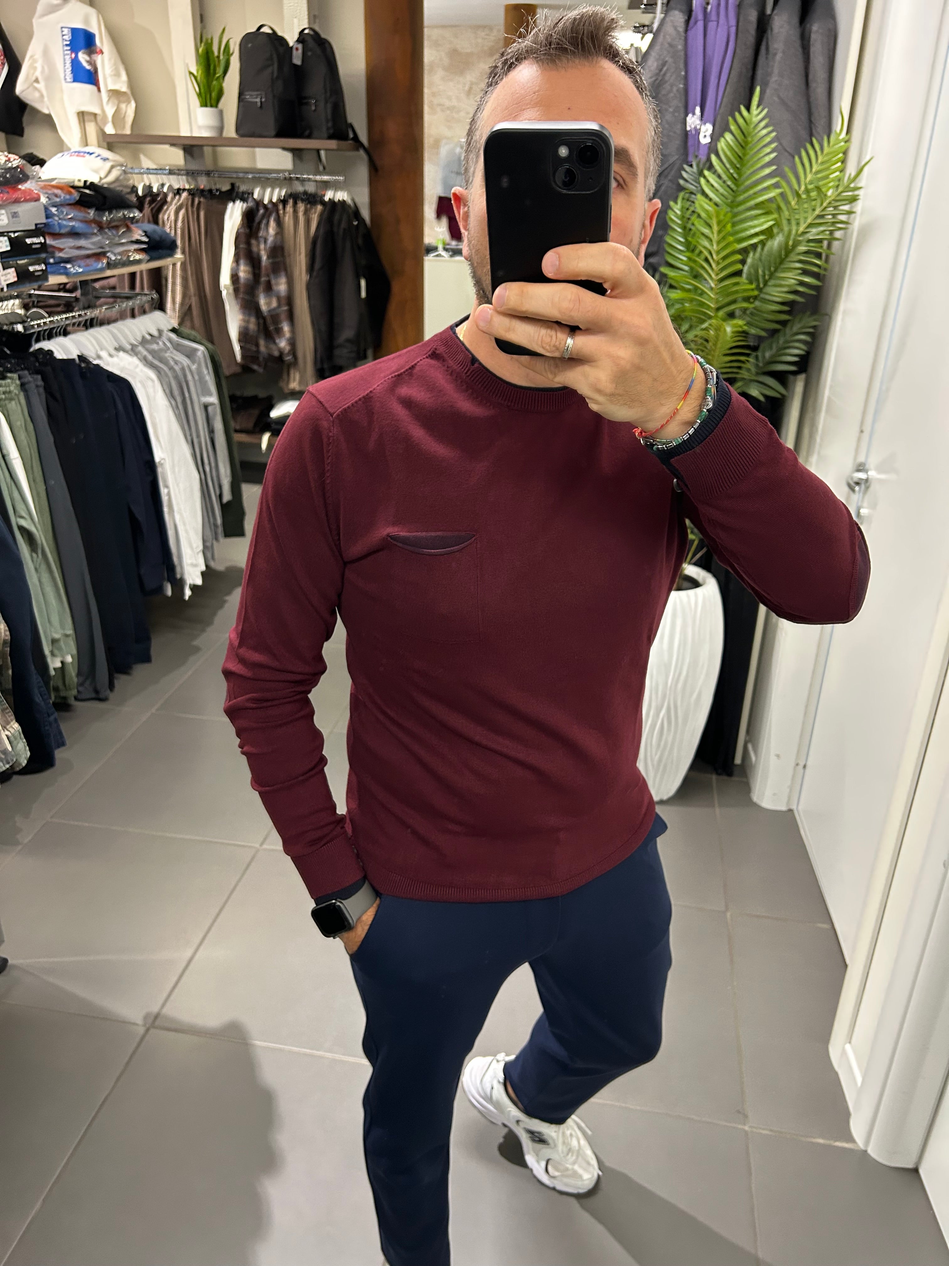 Maglia girocollo bordò con Taschino in contrasto colore bli, toppa sui gomiti in con tessuto colore blu e doppio polsino nella manica
