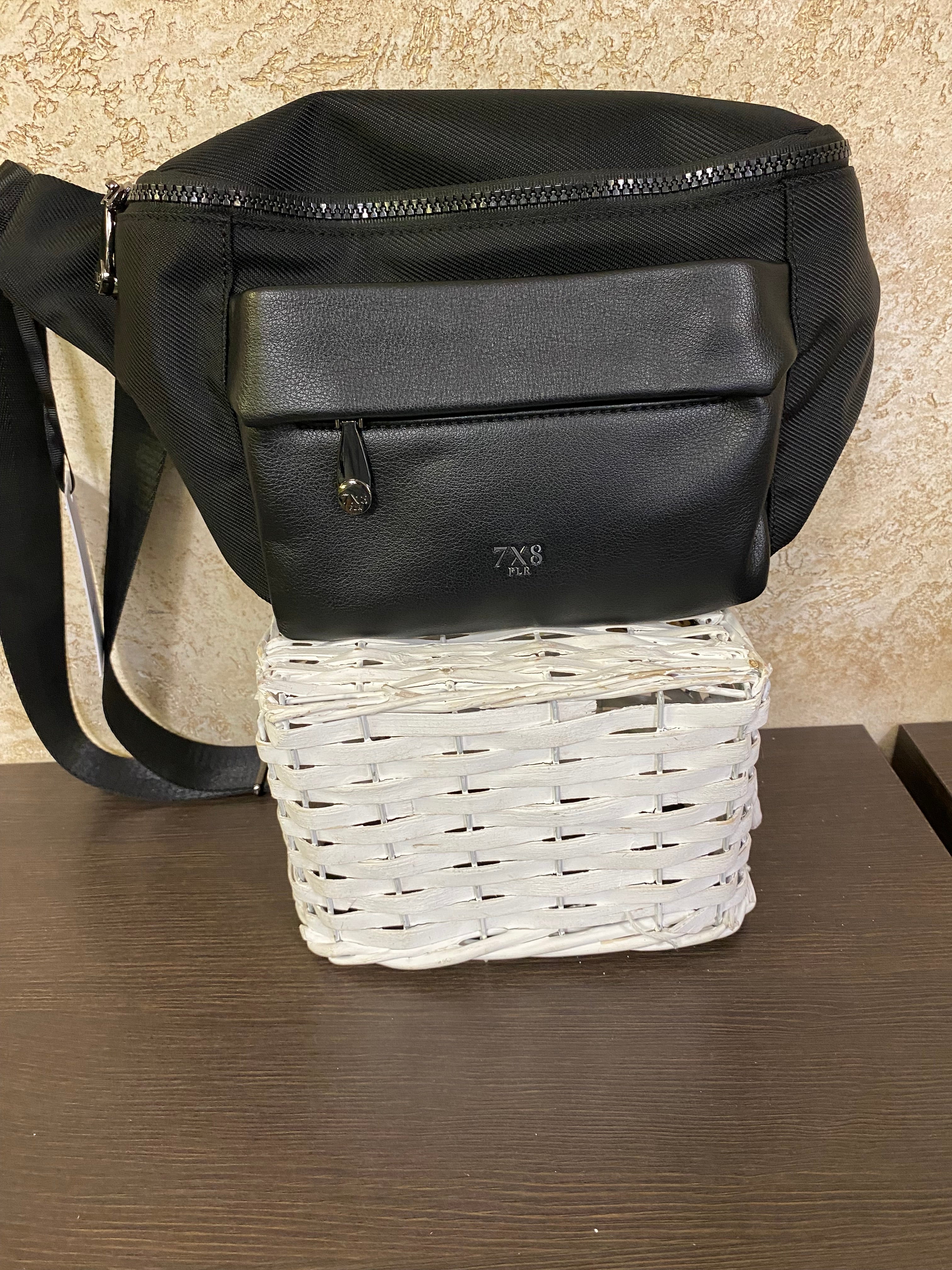Borsello nero in tessuto, ha una forma a marsupio con tracolla regolabile, sono presenti due tasche sul davanti una più grande e spaziosa con cerniera nera, e un altra più piccola in pelle sempre sul davanti con la cerniera argento , é presenti anche una piccola tasche dietro sempre con cerniera nera