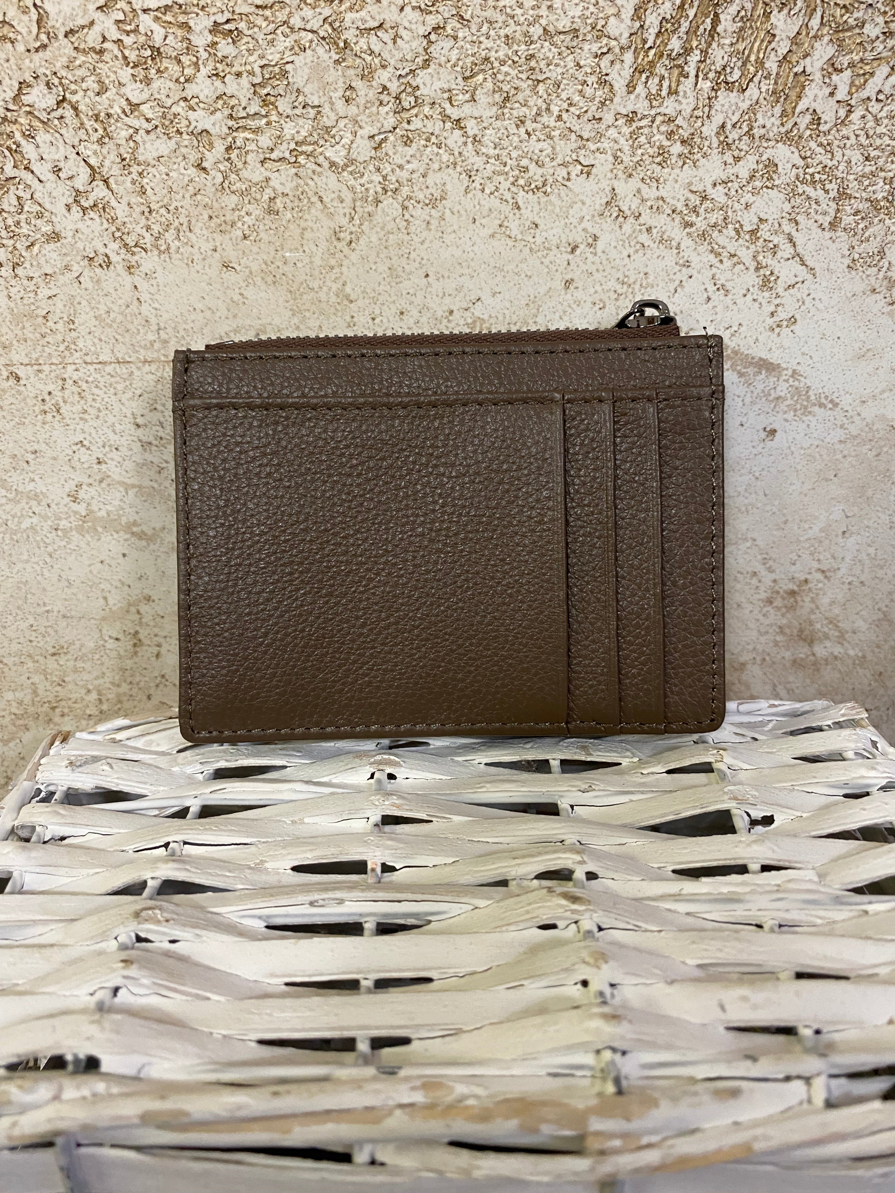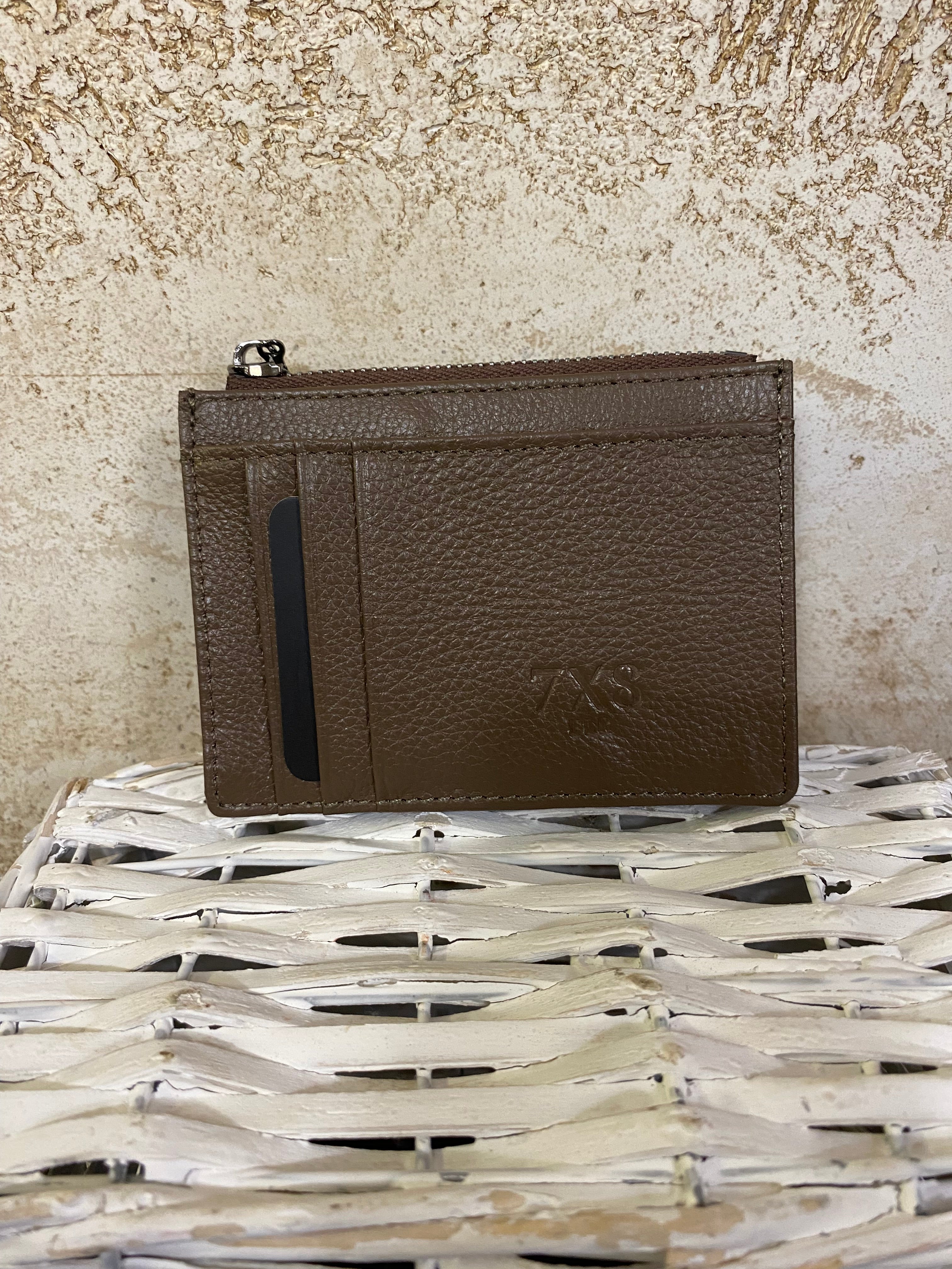 Portafogli piccolo in vera pelle marrone , fascine porta carte all’esterno sia davanti che dietro, ha un’apertura sopra con cerniera color argento