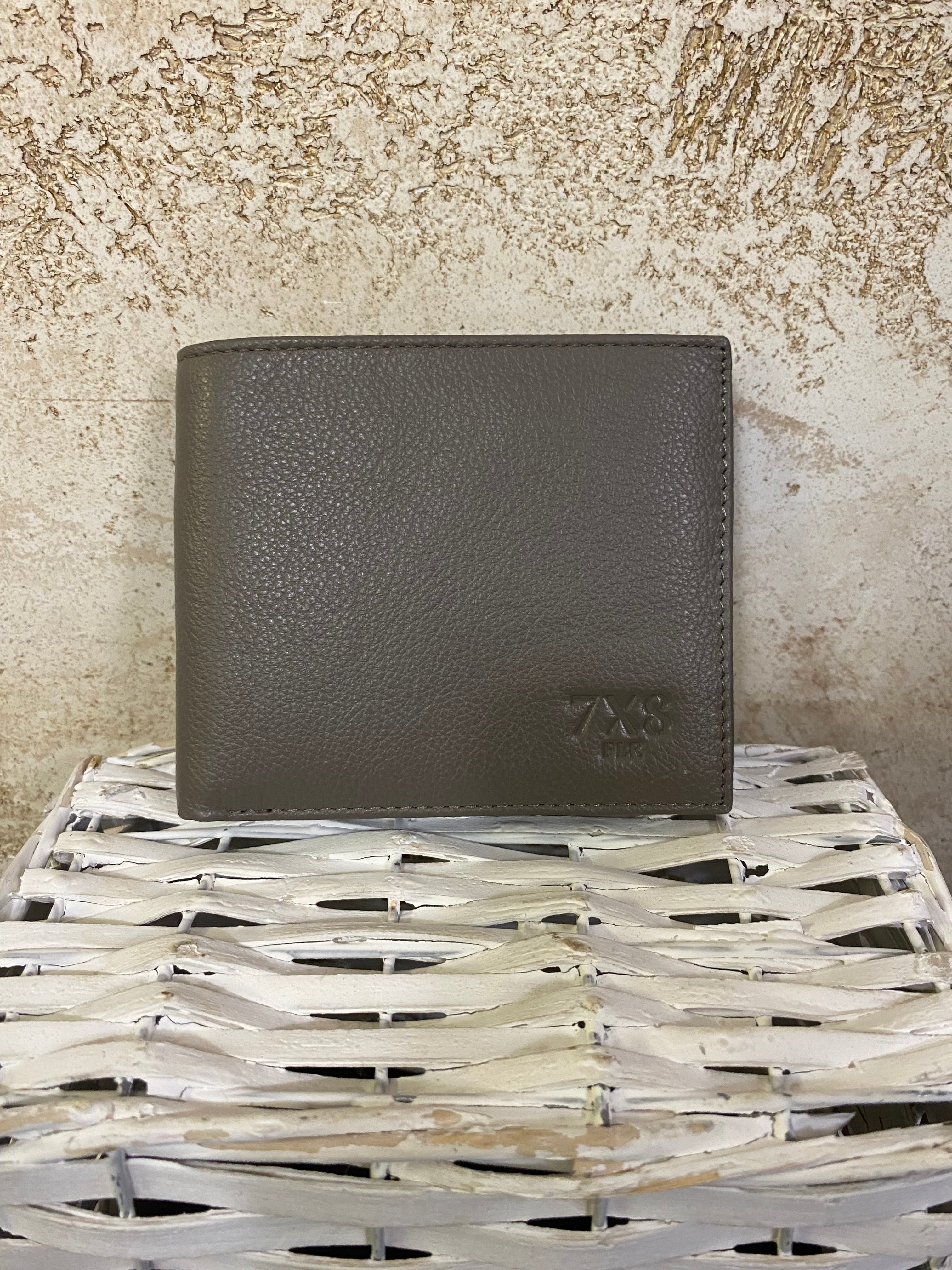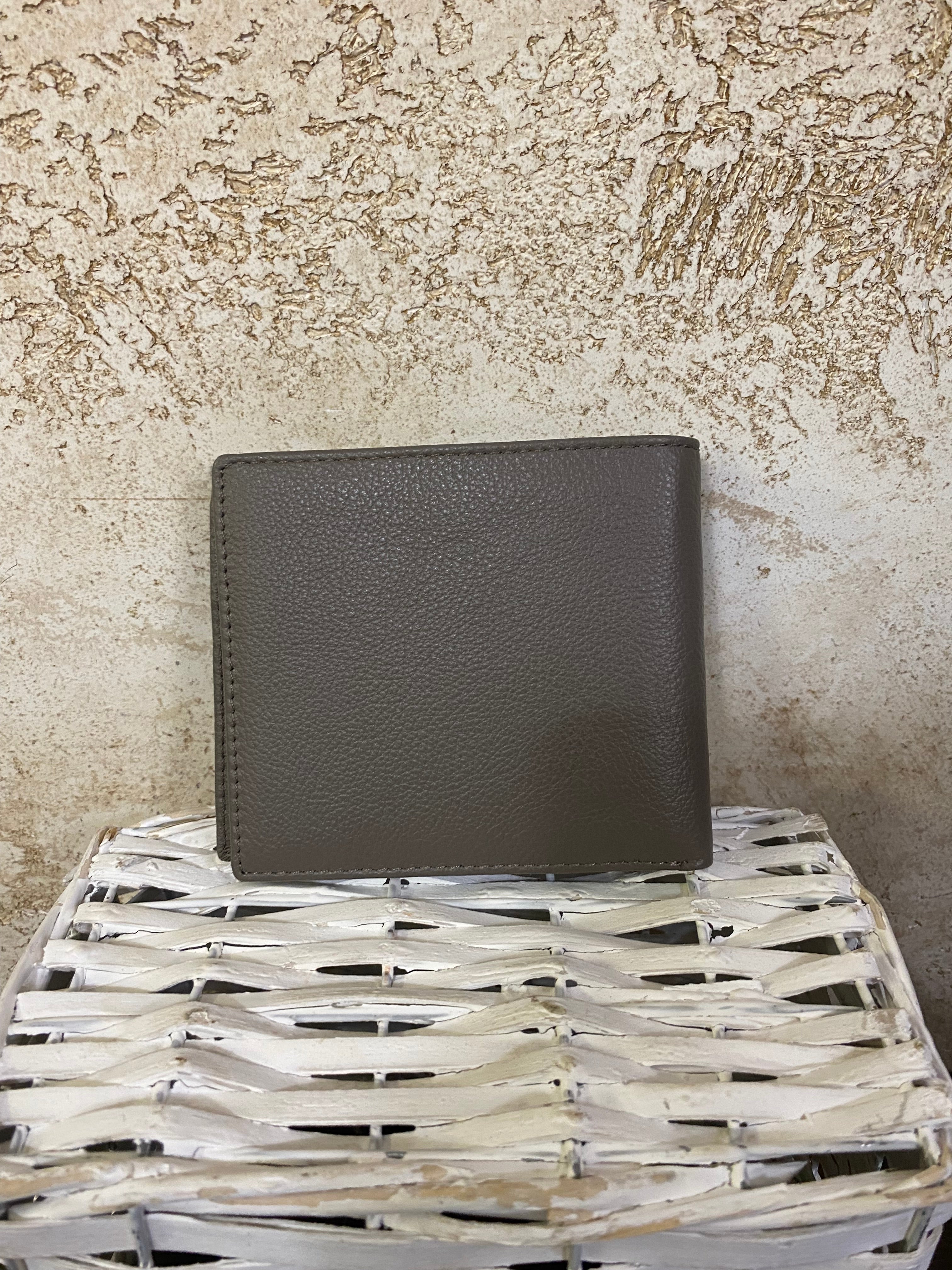 Portafogli piccolo in vera pelle tortora, apertura a libro, all’interno presenti dei piccoli scompartimenti e due scompartimenti un po’ più grandi