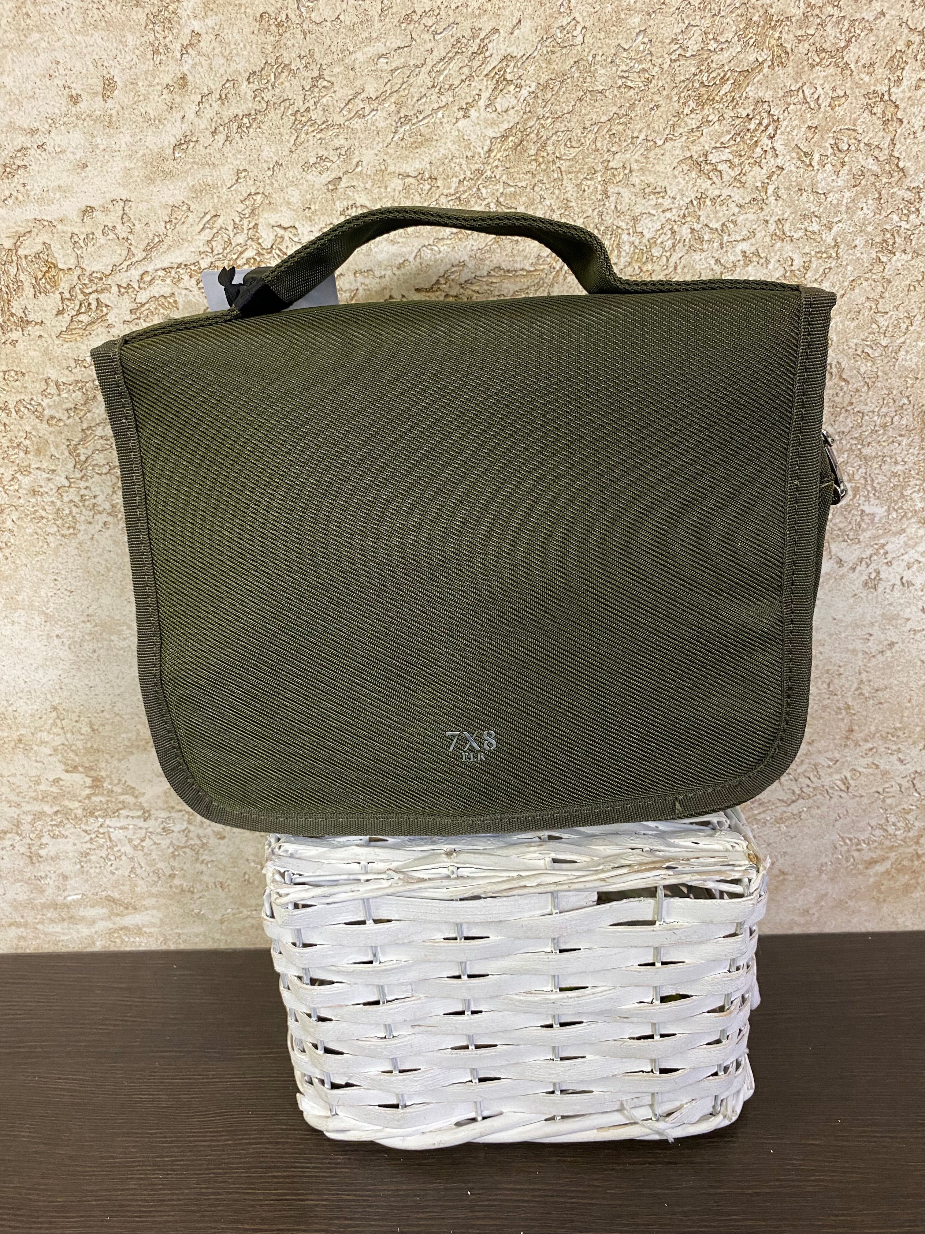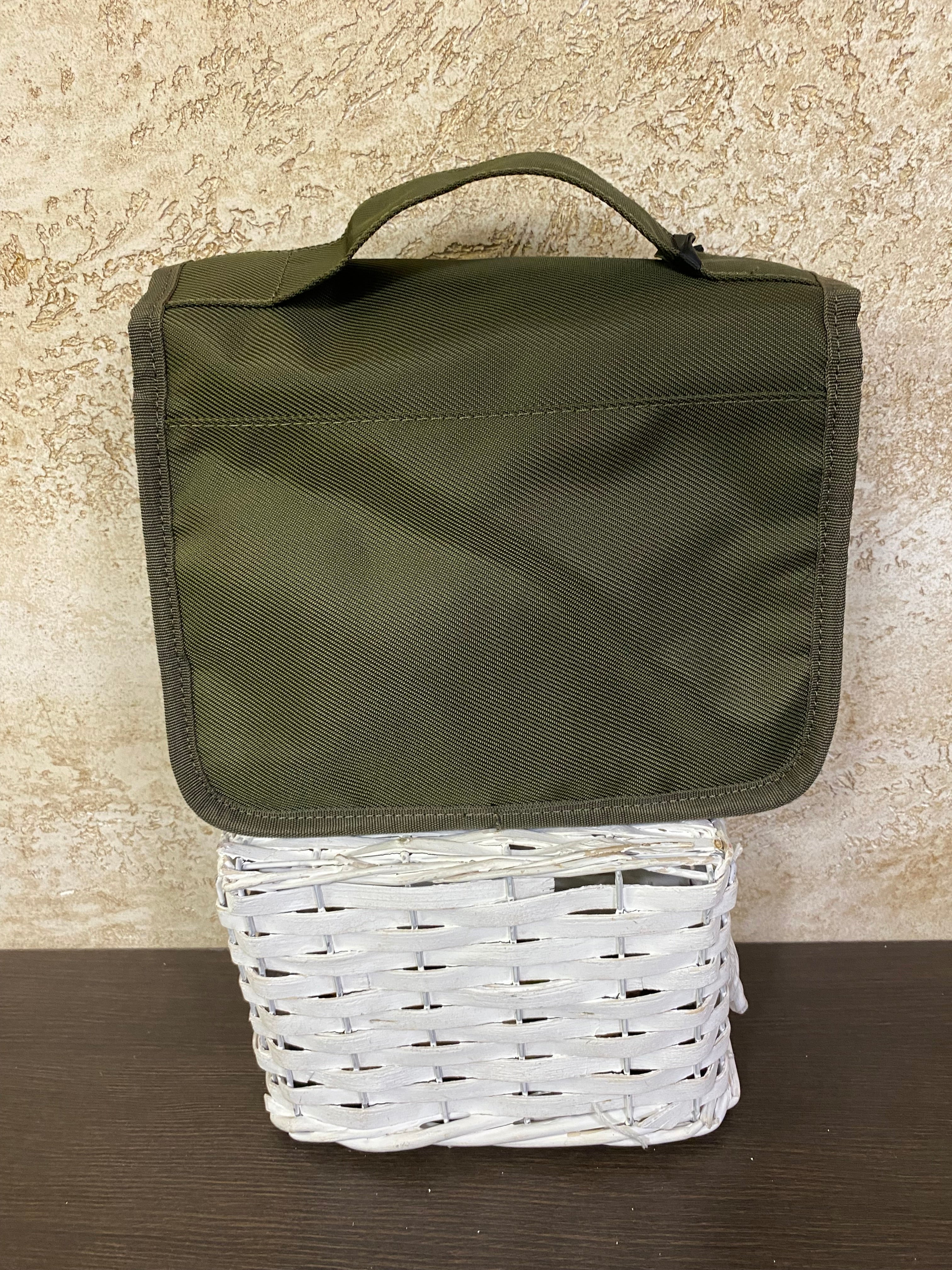 Beauty in tessuto verde, sopra ha una maniglia per mani, presente una tasca sul retro senza chiusura, apertura a libro con strap e all’interno é presente una grande tasca con dentro tante altre piccole taschine