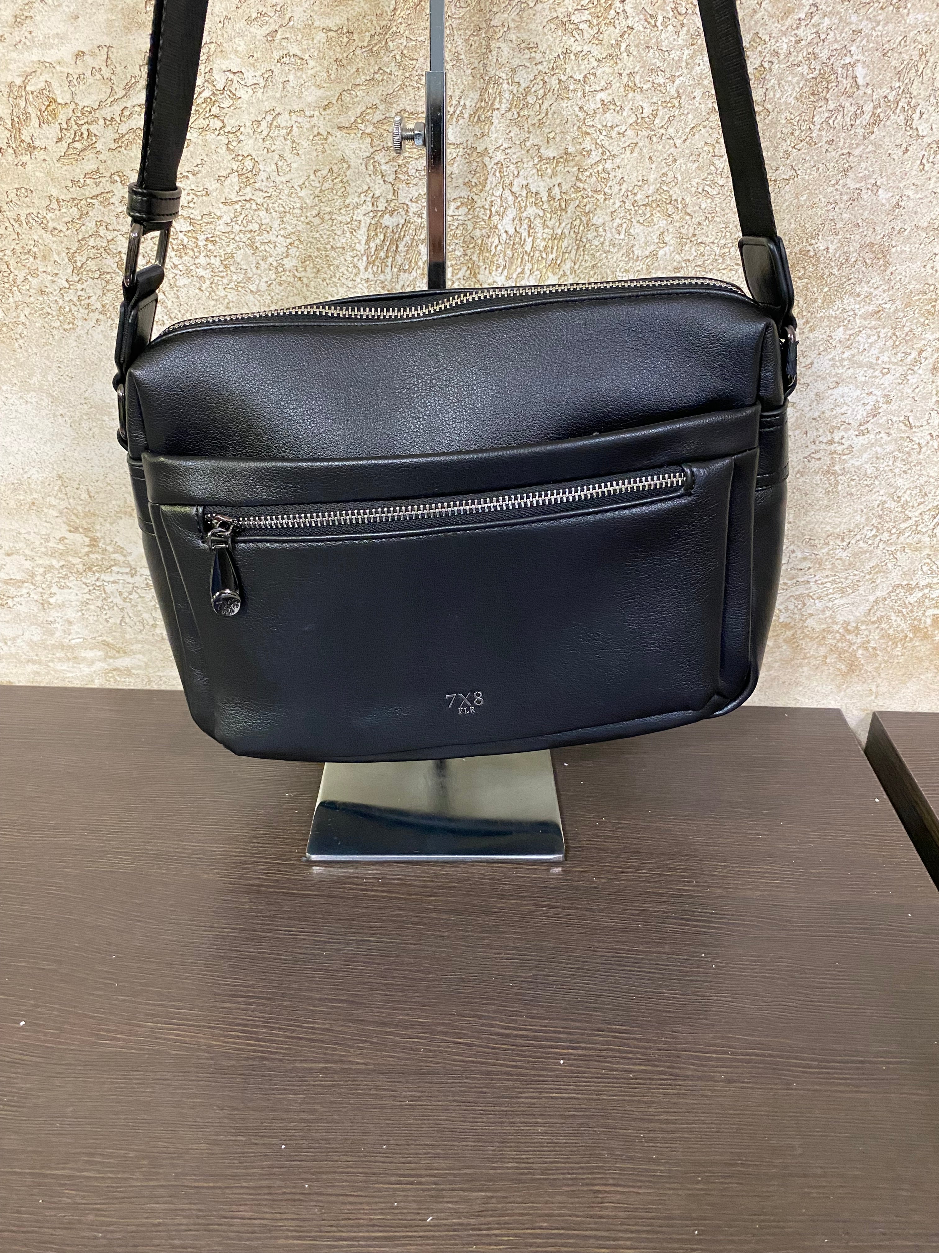 Borsello in vera pelle nero, sono presenti tre tasche sul davanti e una sul retro del borsello, la prima tasca più grande é sopra con cerniera, la seconda é nascosta da una fessura sempre con la cerniera, la terza é quella più piccola è più a vista sempre con cerniera, la tasca dietro é di medie dimensioni sempre con cerniera, tracolla nera regolabile
