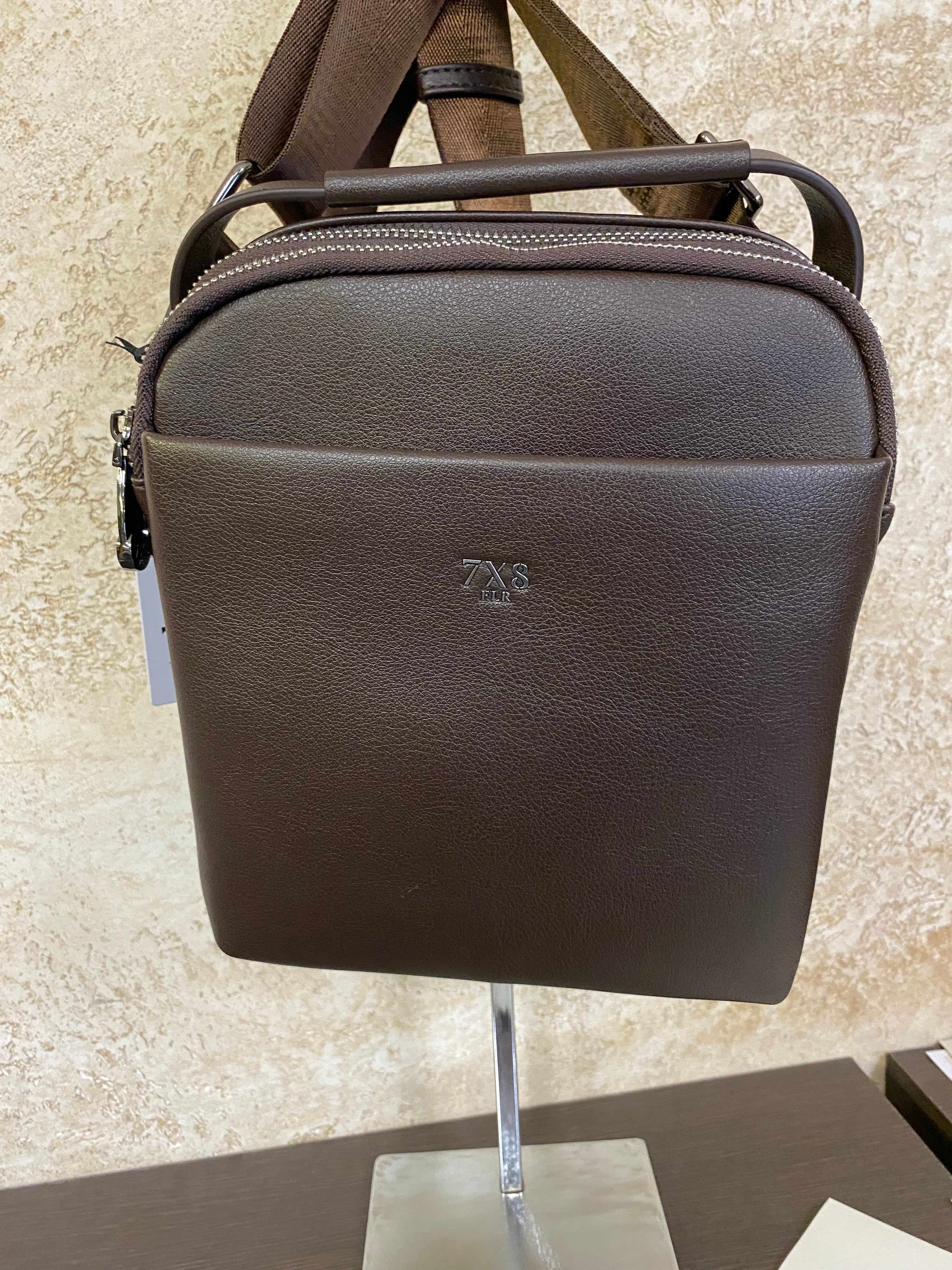 Borsello in vera pelle marrone, con tracolla in tessuto marrone da portare a spalla e una maniglia in pelle mattone da portare a mano, due tasche grandi sopra con cerniera, una tasca nascosta da una fessura sempre con cerniera, e una tasca piccola sul retro con cerniera