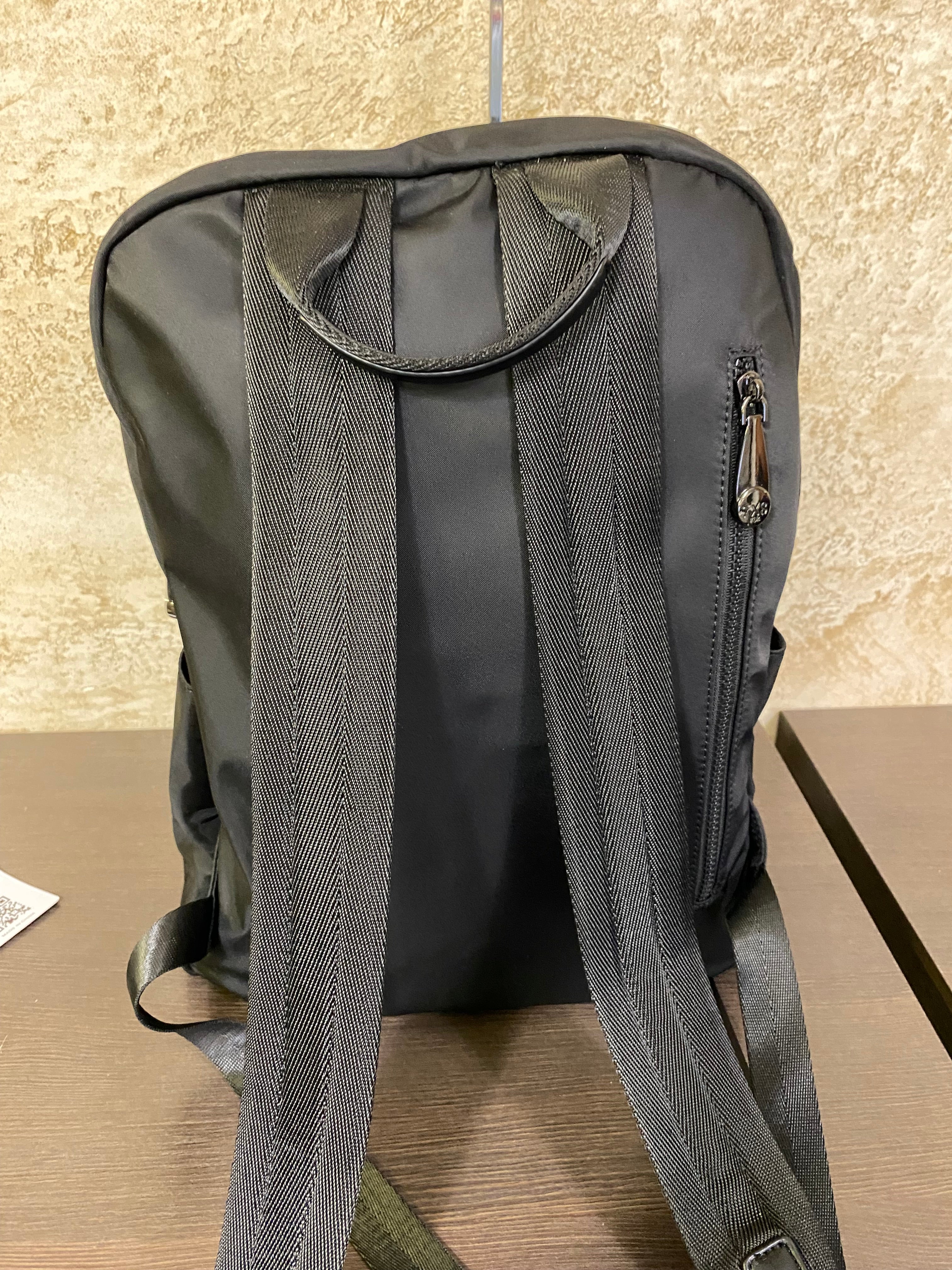 Zaino nero in tessuto, una singola tasca con la cerniera molto spaziosa, presenti altre quattro tasche, due sui laterali e due sulla parte davanti con chiusa a bottone, davanti è presente una striscia in ecopelle nera con scritto il brand, e infine sul retro è presente un altra tasca con cerniera più piccola. Le spalline sono regolabili