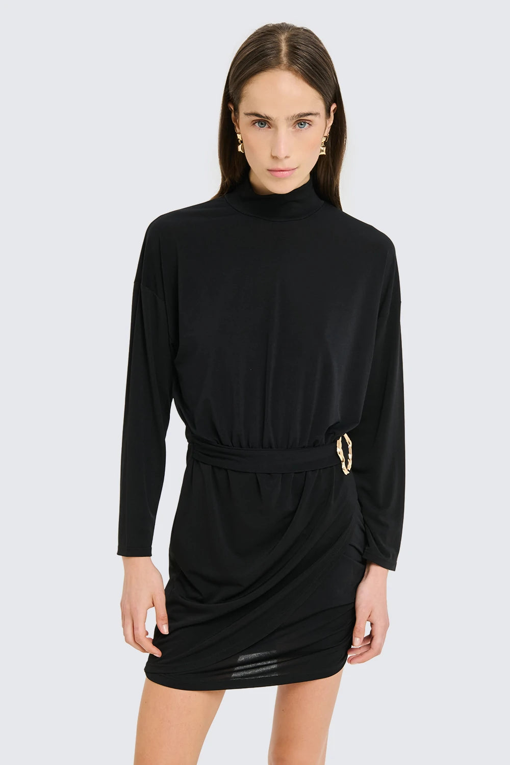 Abito lungo stile tubino corto con maniche lunghe. Il vestito sulla gonna ha un effetto a portafoglio con ama arricciatura sul lato. In vita è dotato di una cintura con attaccato un gioiello in oro. Vestibilità XS,S,M