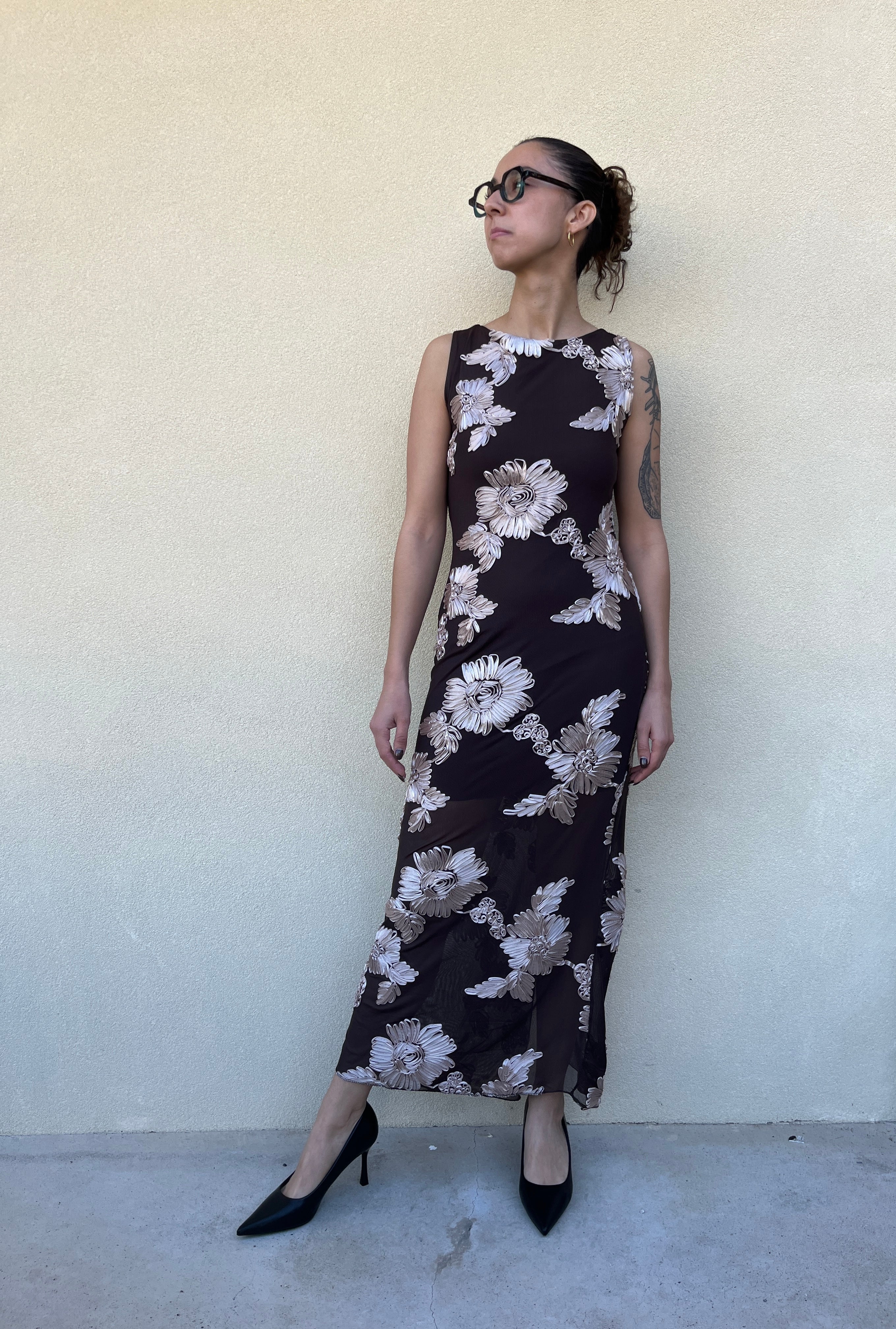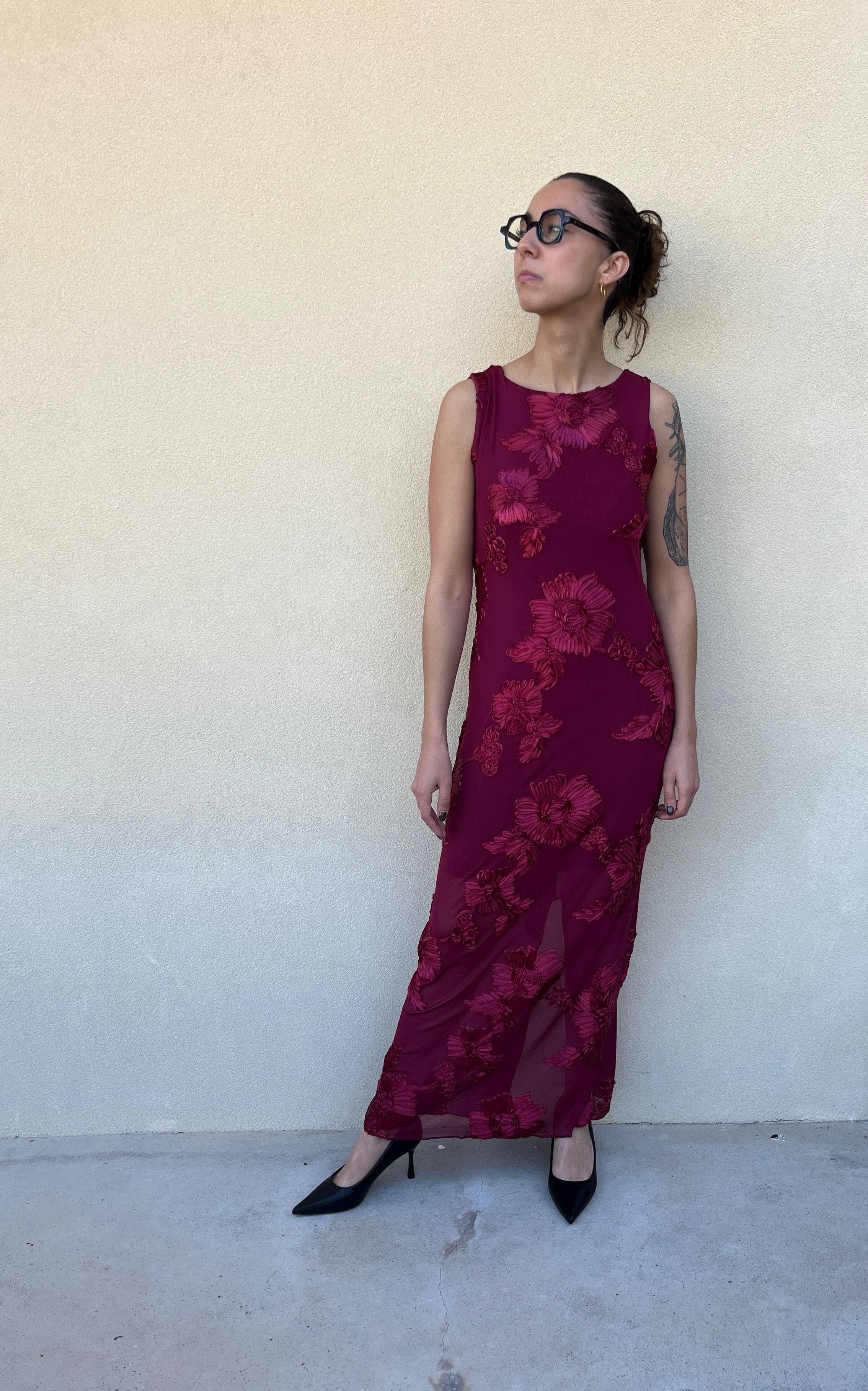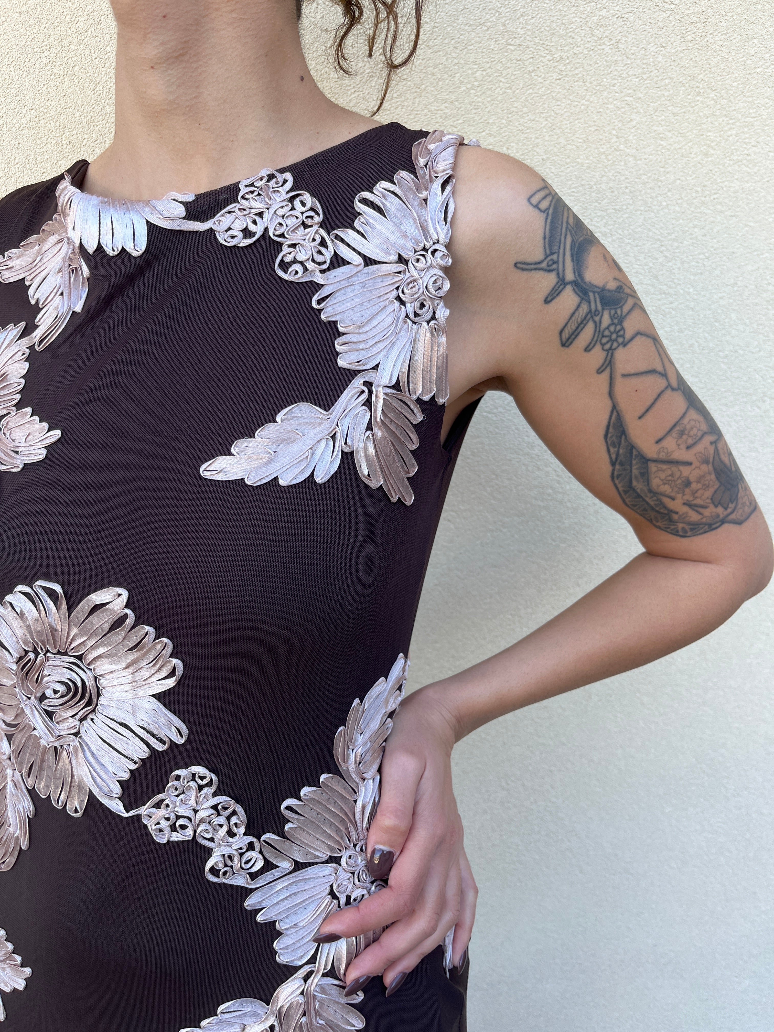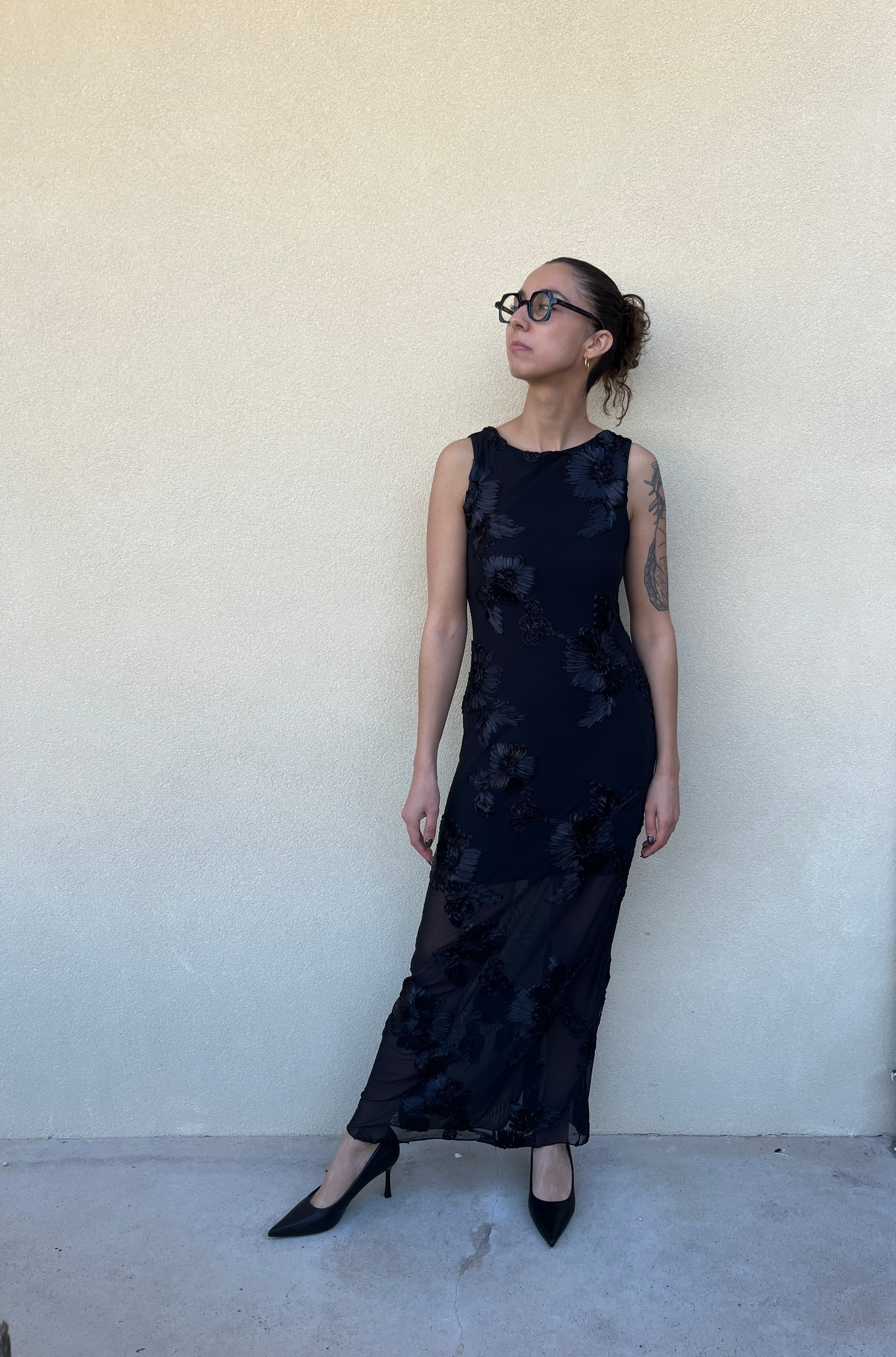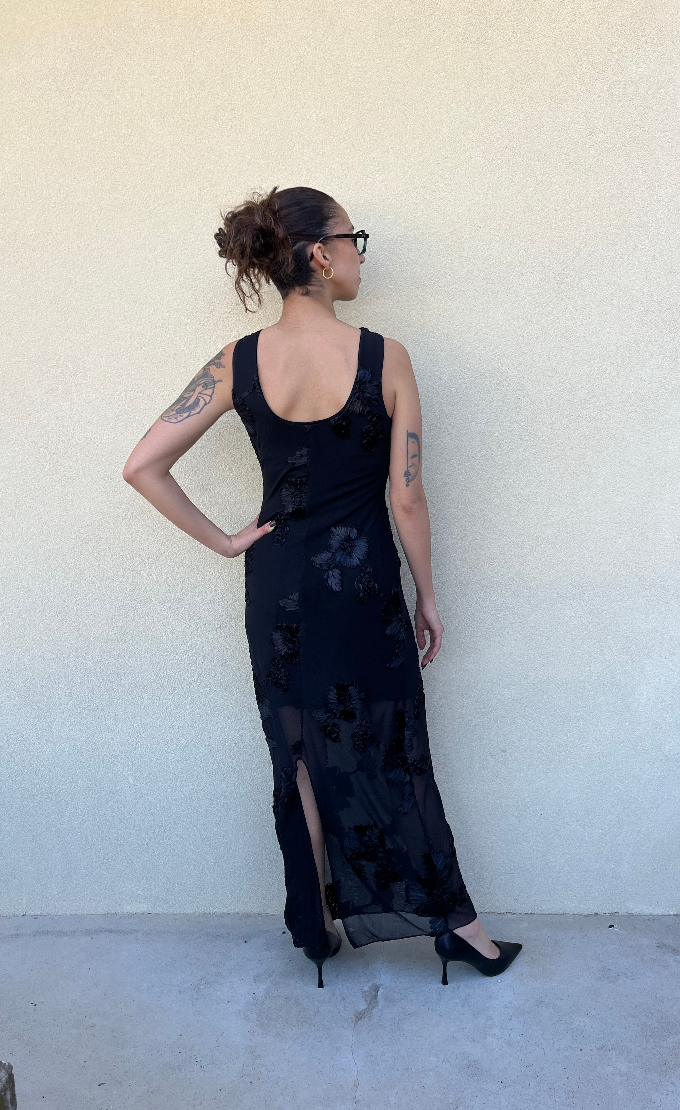 Abito lungo aderente a spalla larga con ricami floreali applicati. Doppio tessuto, sottoveste più corta e aderente e parte sopra in tulle lunga. Sul retro un sensuale scollo rotondo ed un spacco non troppo profondo. Taglia unica con vestibilità dalla 38 alla 44.