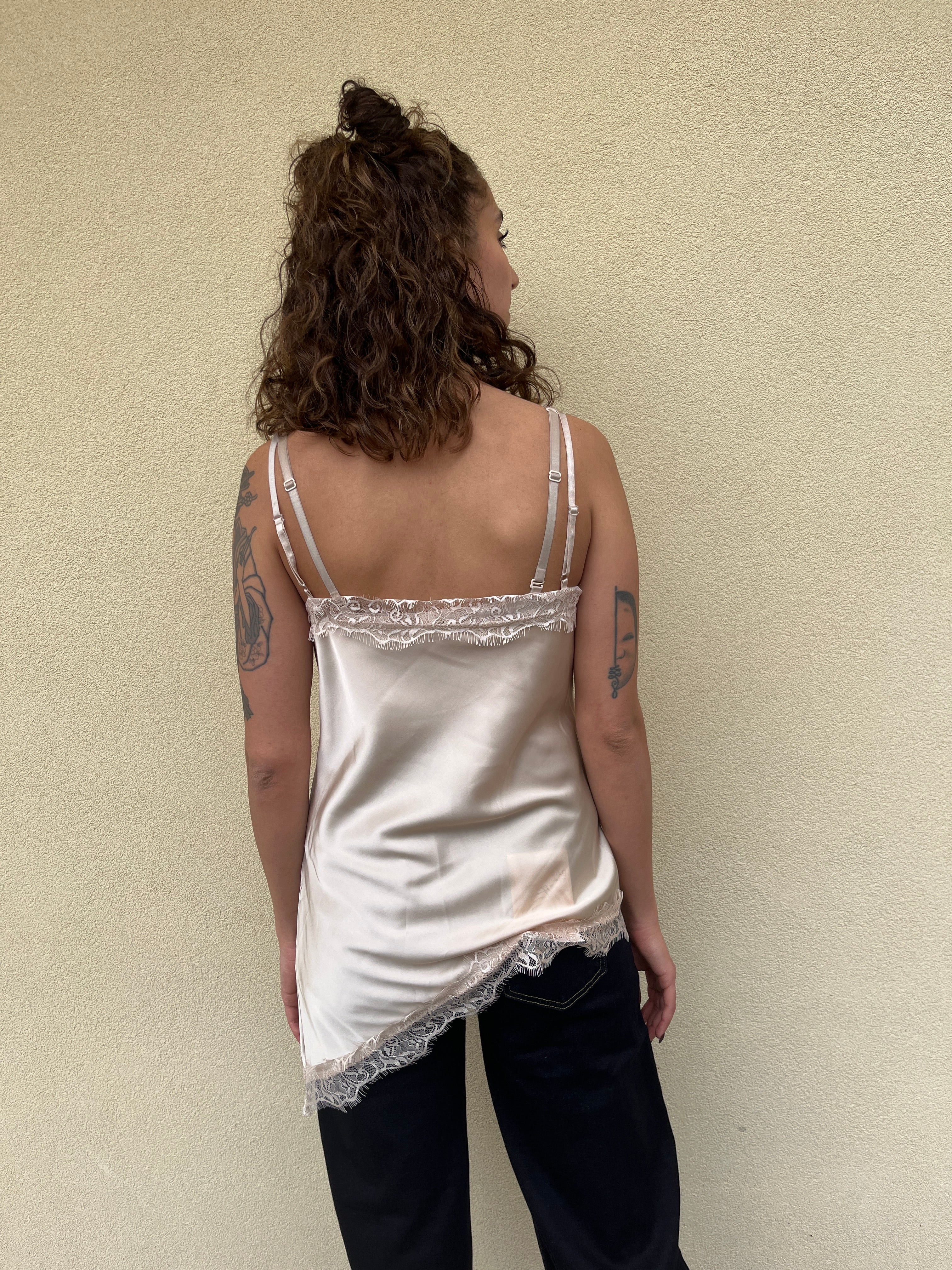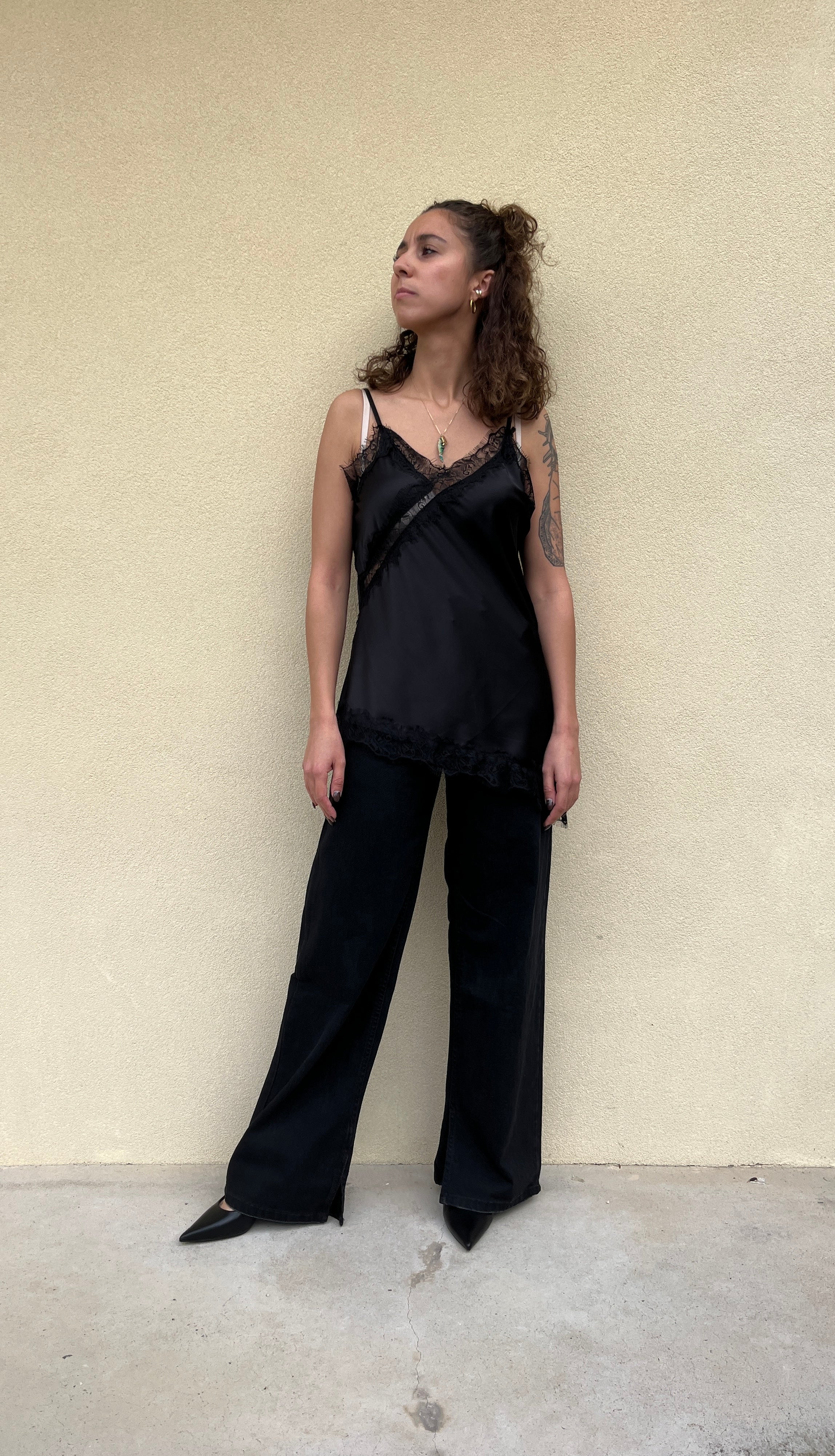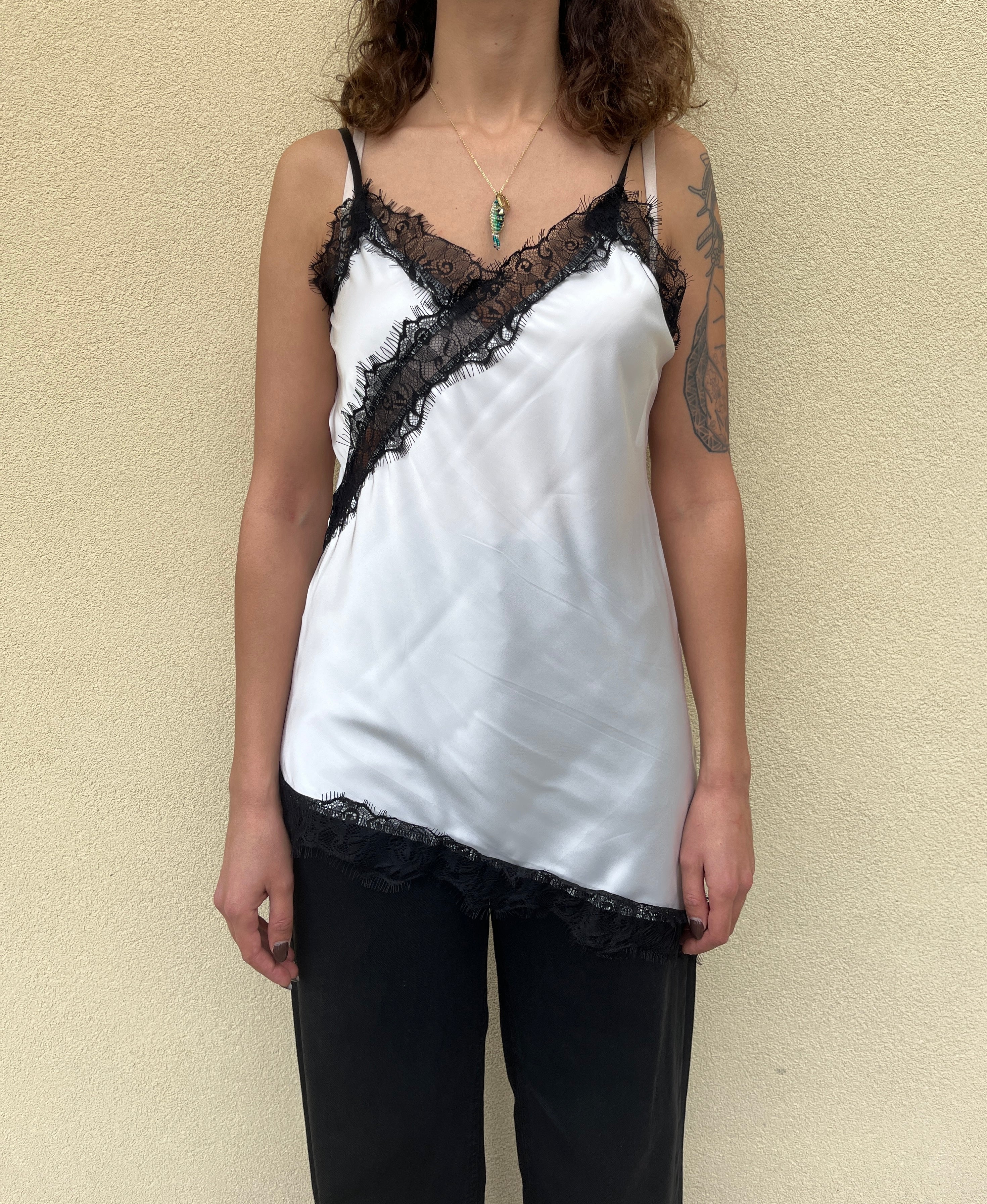 Top effetto raso con bordi in pizzo, finale asimmetrico. Spallina sottile regolabile. Taglia unica e vestibilità dalla 40 alla 46.