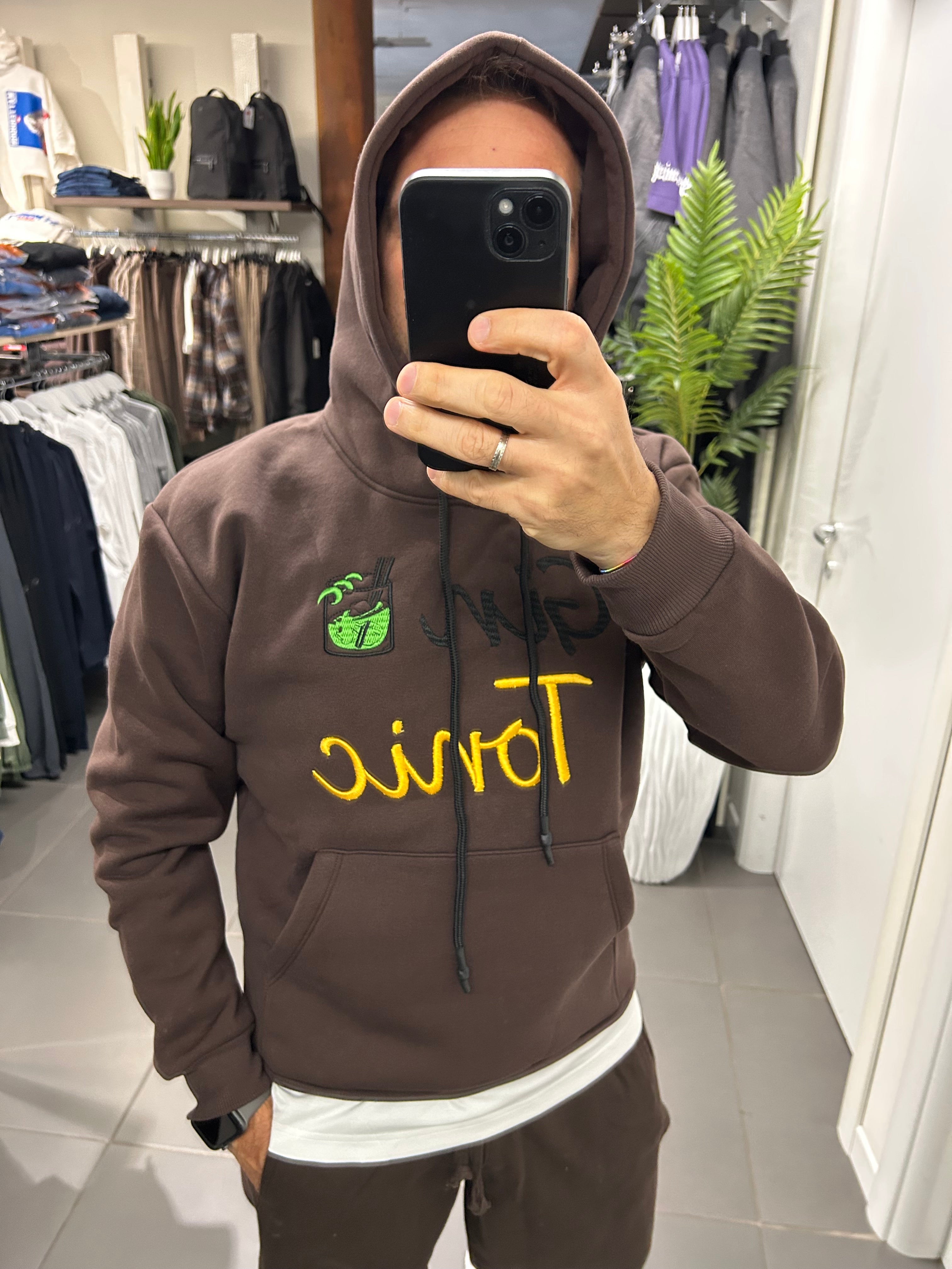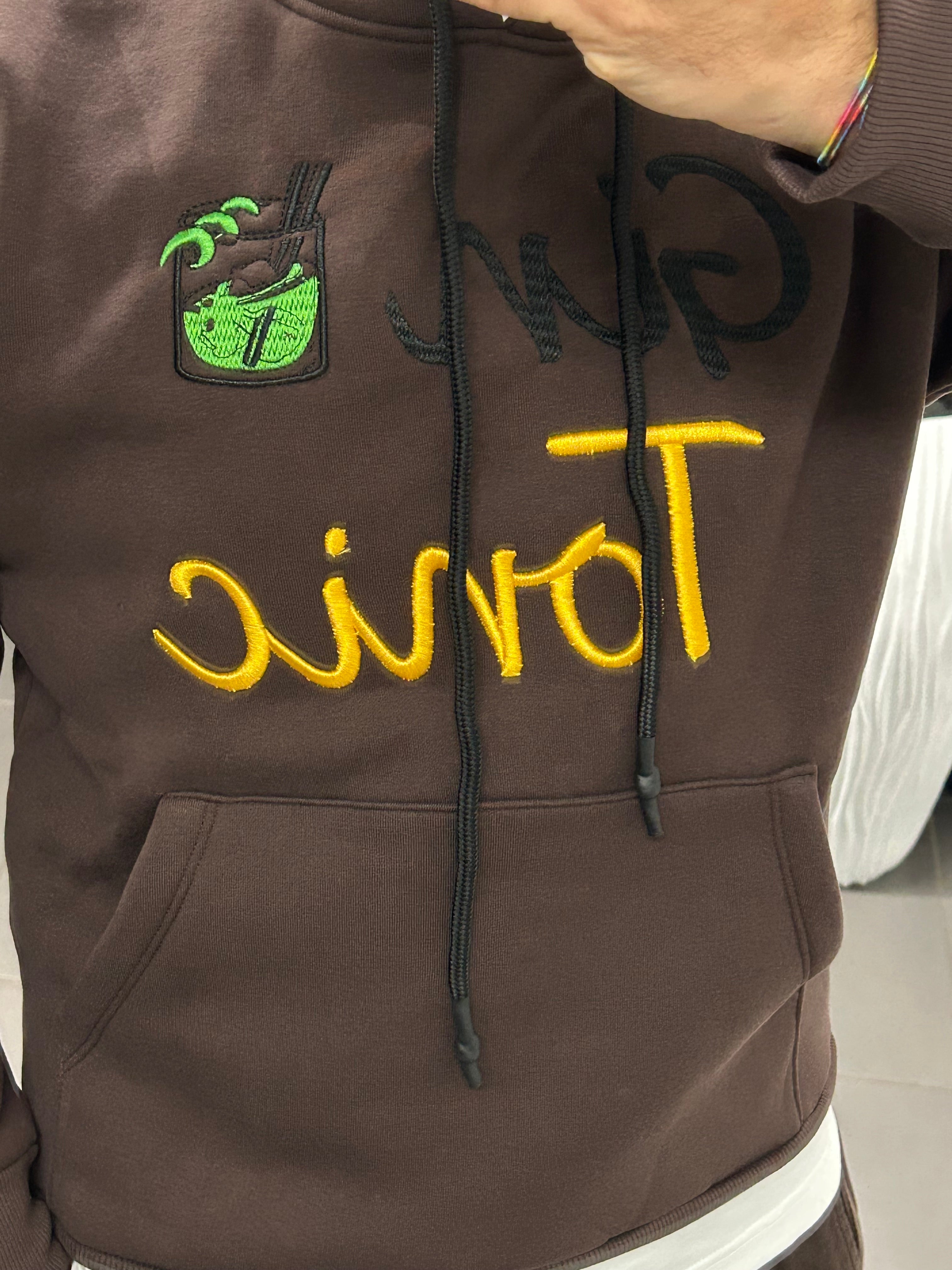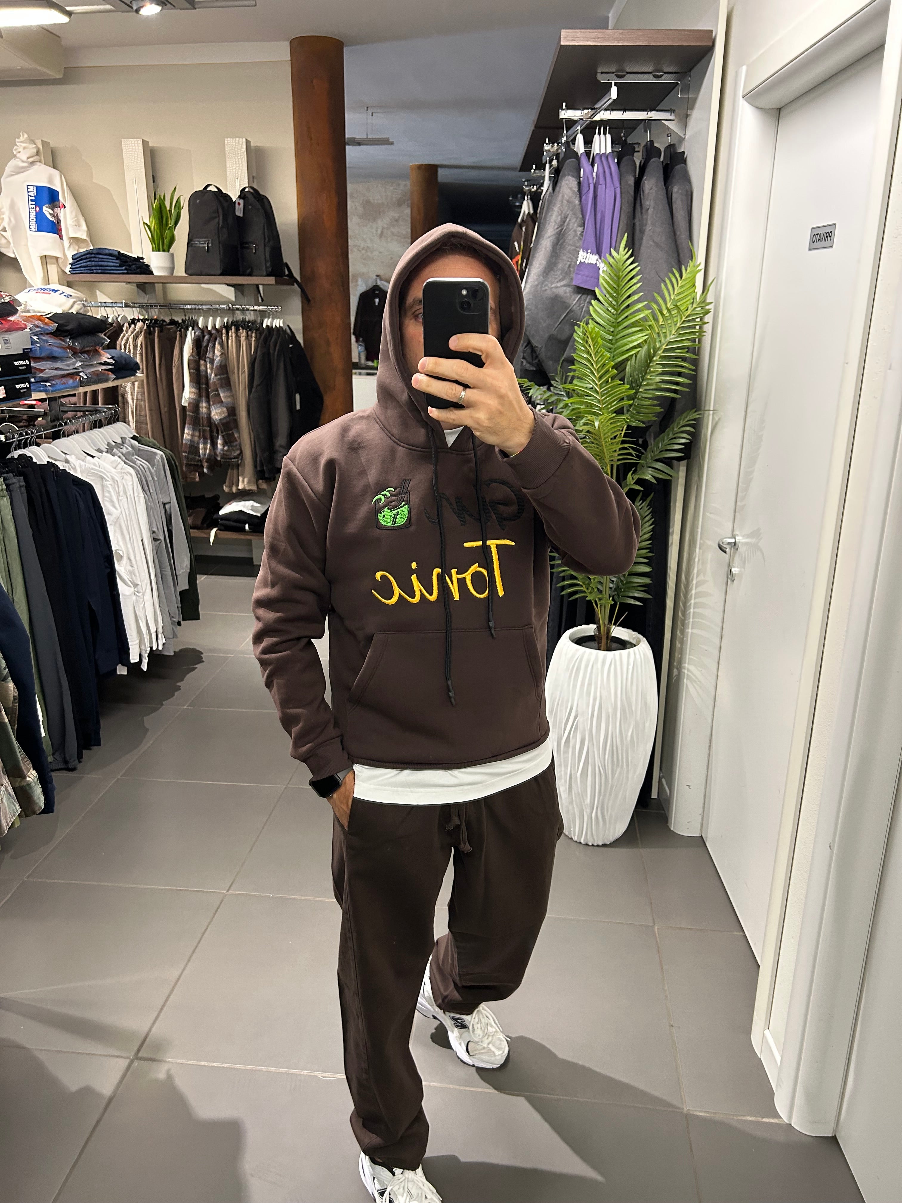 Felpa semplice con cappuccio marrone,  dotata di laccetti neri,con ricamo, tasca a marsupio davanti, vestibilità semi over