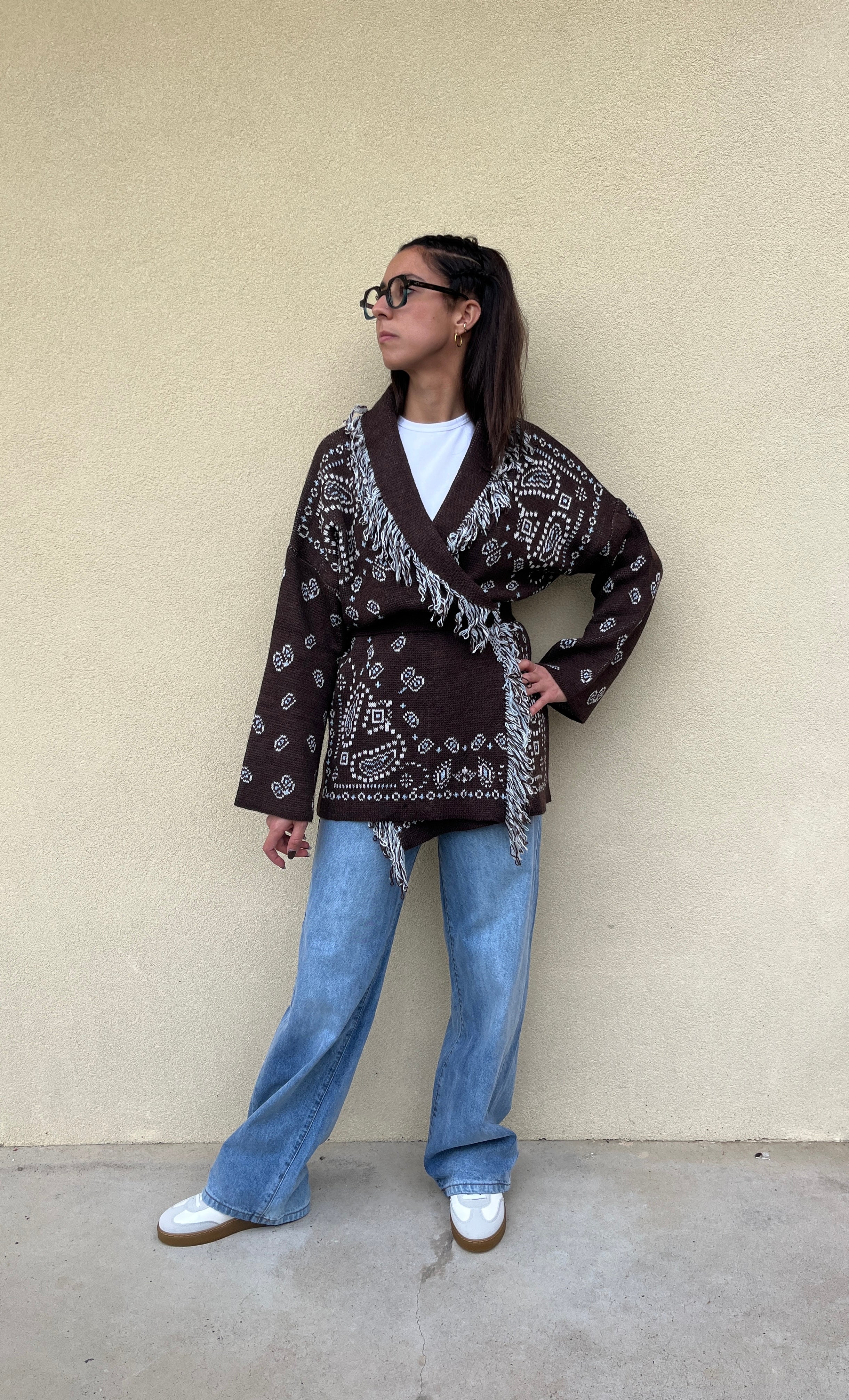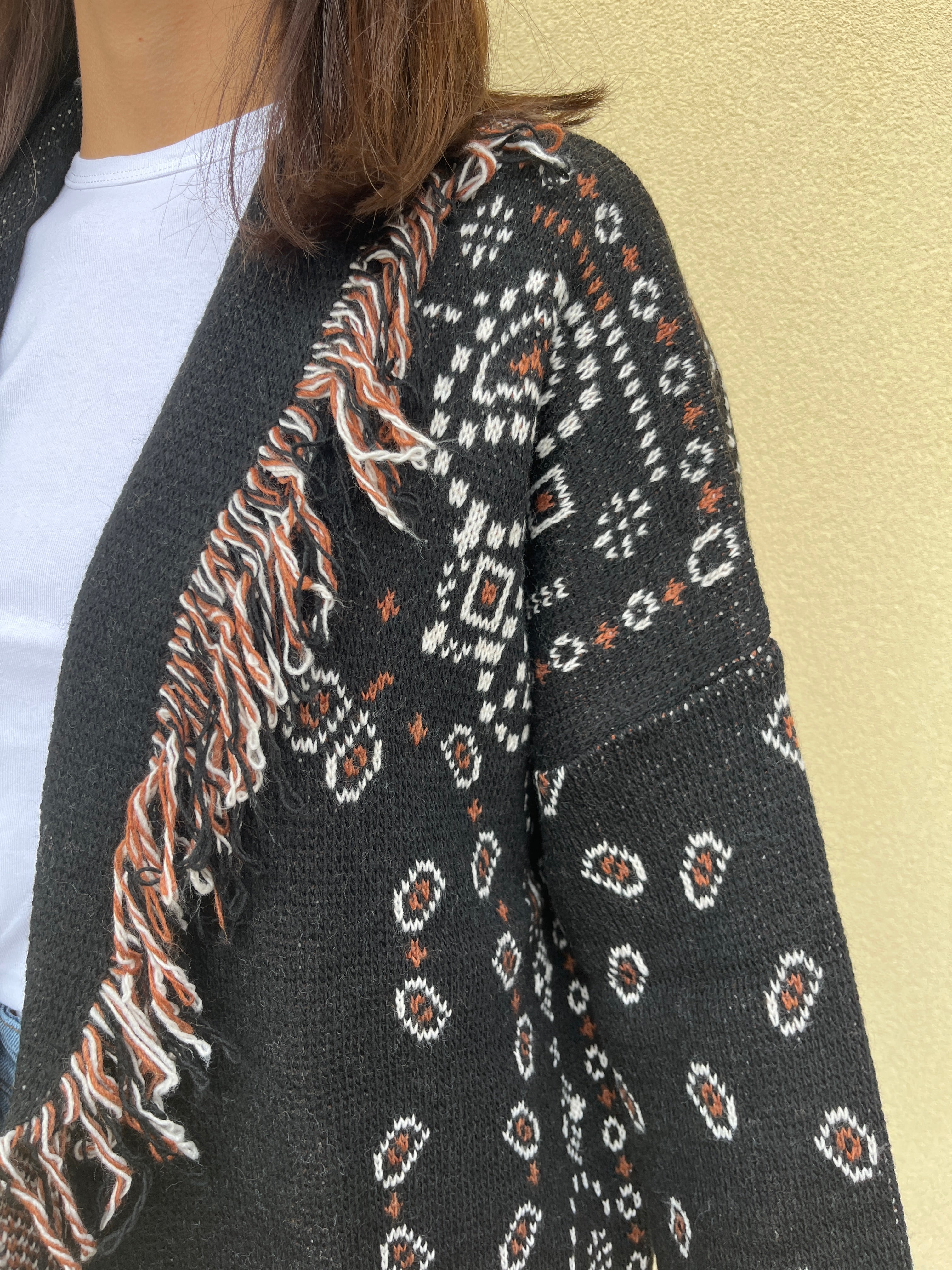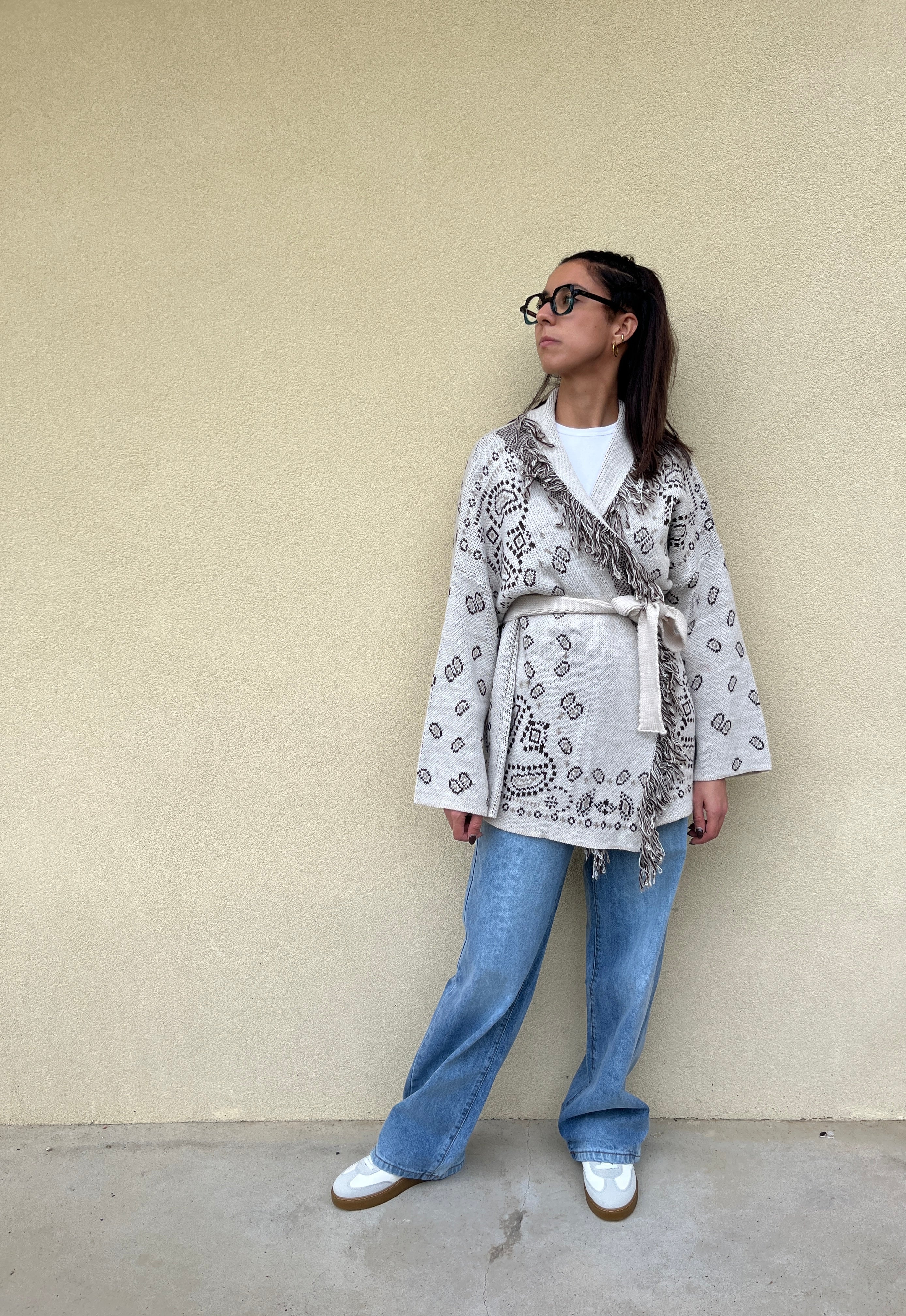 Cardigan stile giacca in fantasia con reverse a contrasto sfrangiato. Il cardigan ha una media lunghezza che arriva a coprire le tasche dei pantaloni. È dotato di una cintura nello stesso tessuto tinta unita quindi è bello da portare chiuso sfiancando il punto vita con la cintura oppure aperto e morbido. Ideale da usare nelle mezze stagioni come giacchina oppure come maglione nella stagione invernale. Taglia unica e vestibilità da una 40 ad una 46.