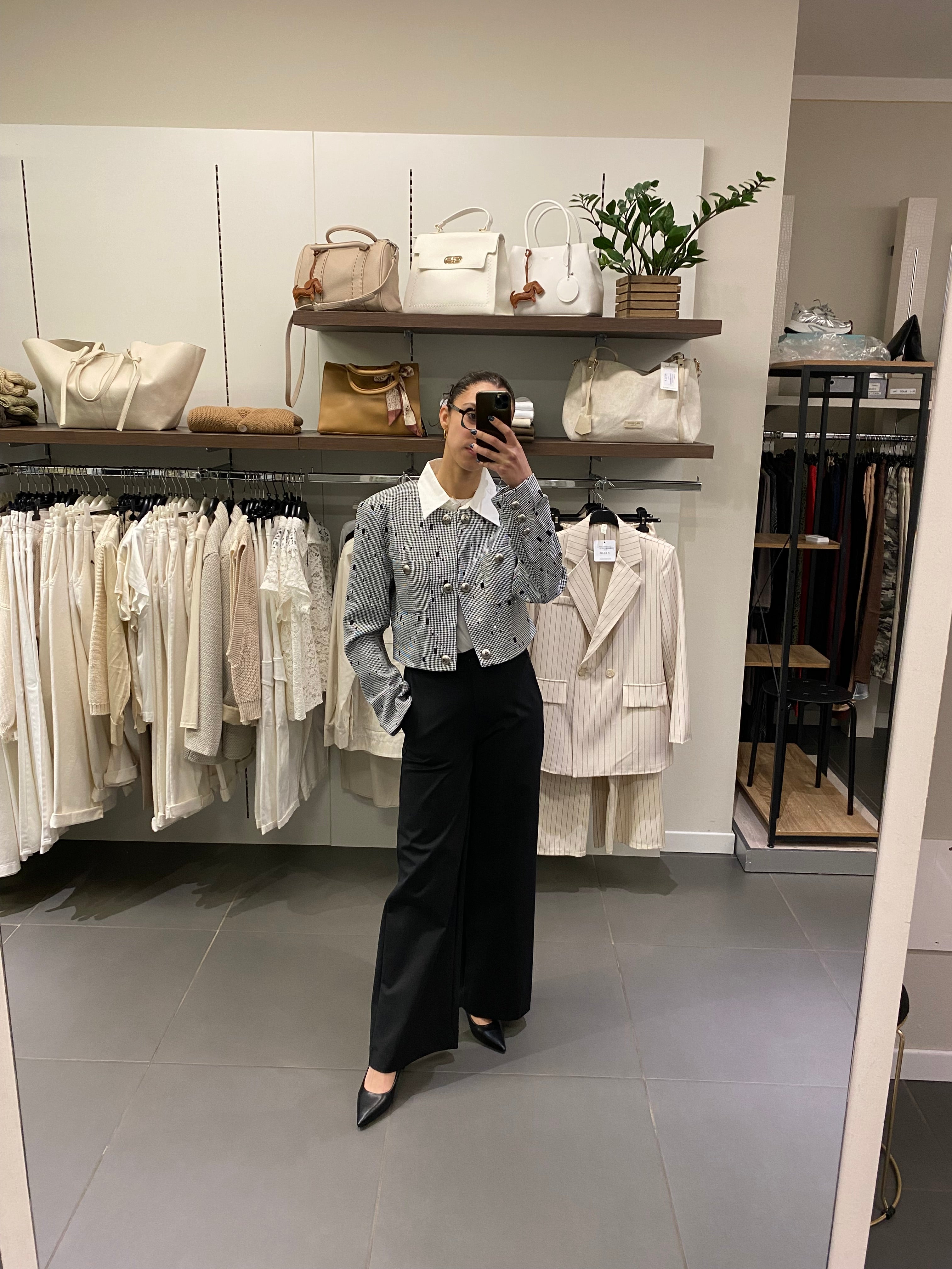 - Il collo a camicia bianco a contrasto si può togliere con dei bottoncini interni così rimane una giacchetta girocollo