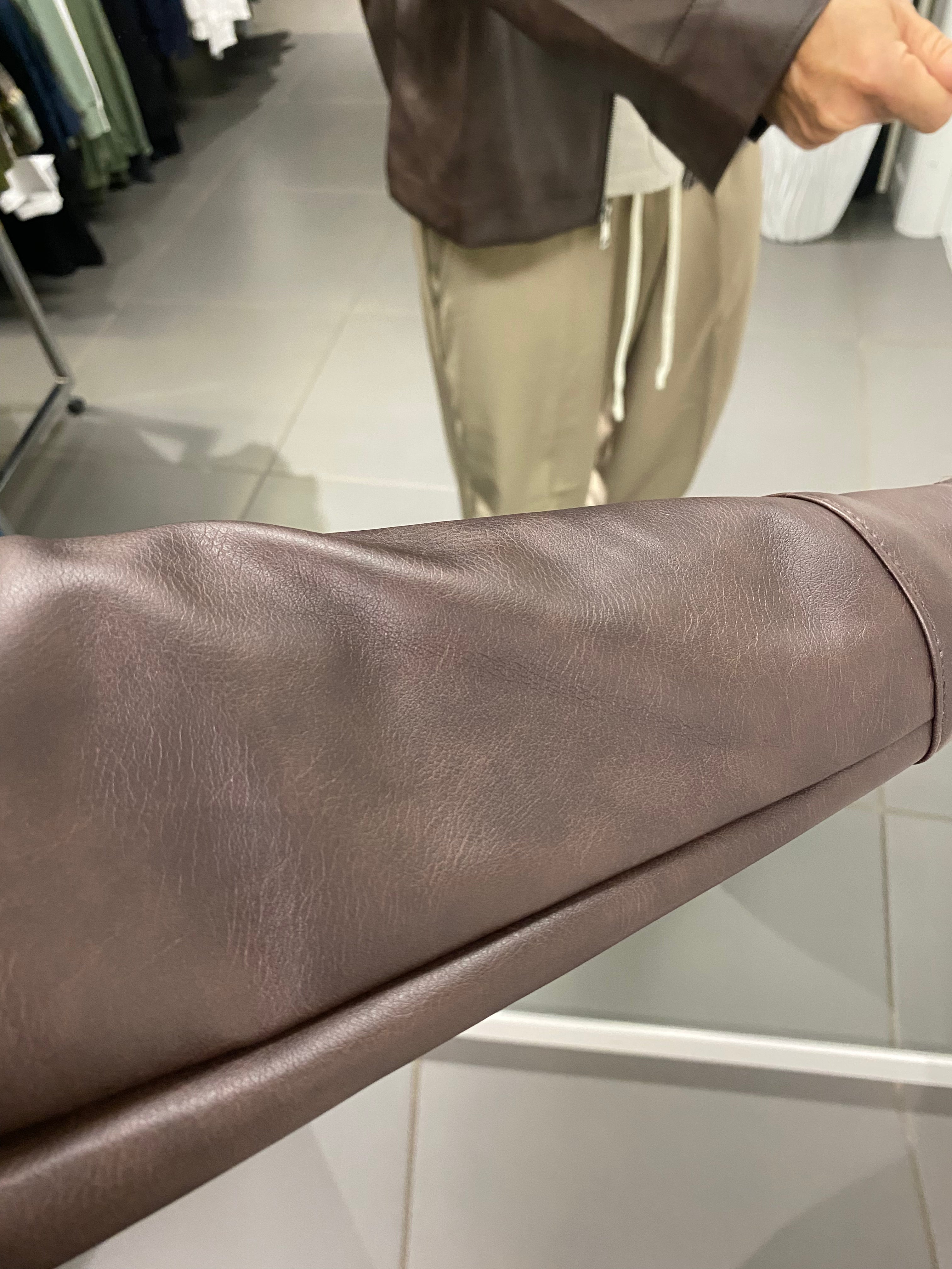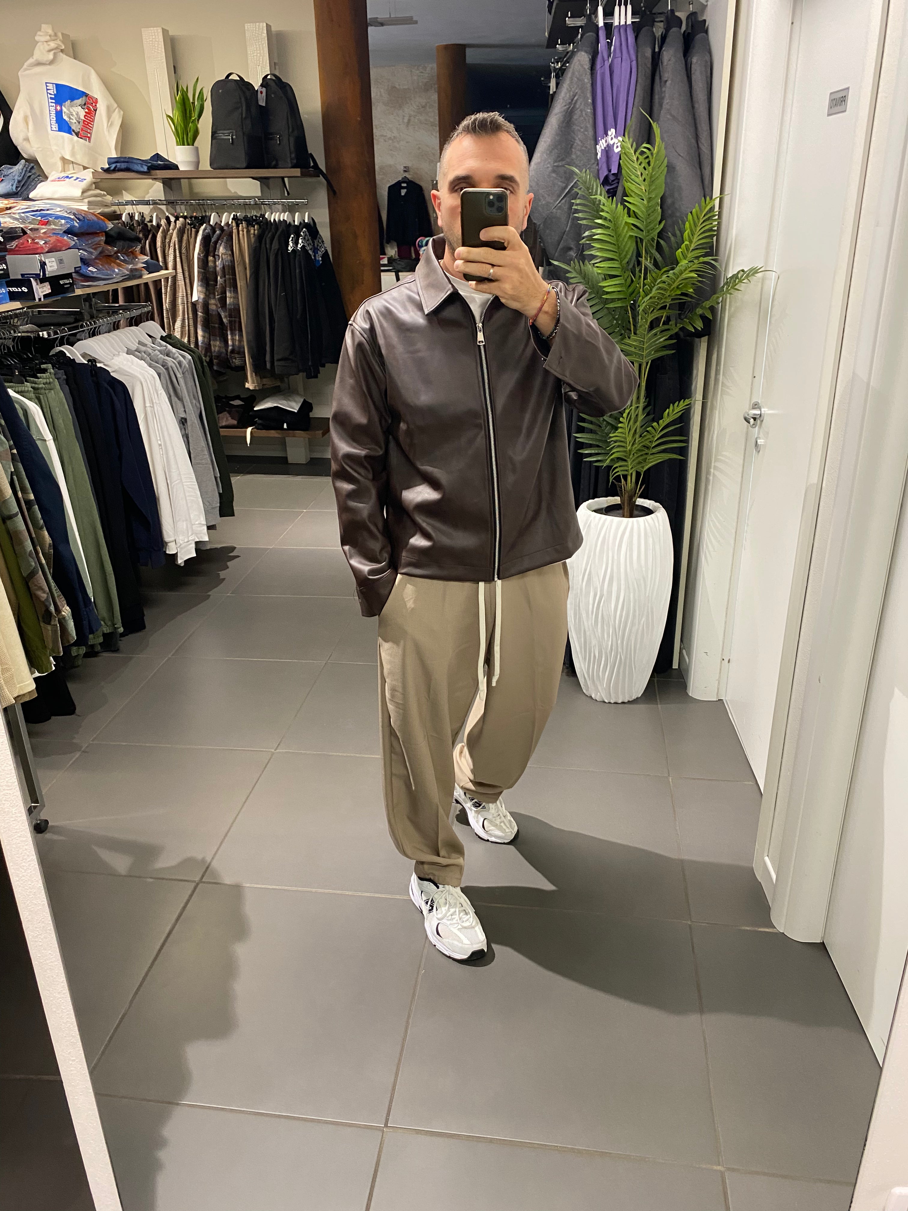 Giacca/camicia in morbidissima nappa effetto ecopelle in color cioccolato. Colletto, chiusura con zip, tasche a filo, sui polsi chiusura con bottone effetto camicia.