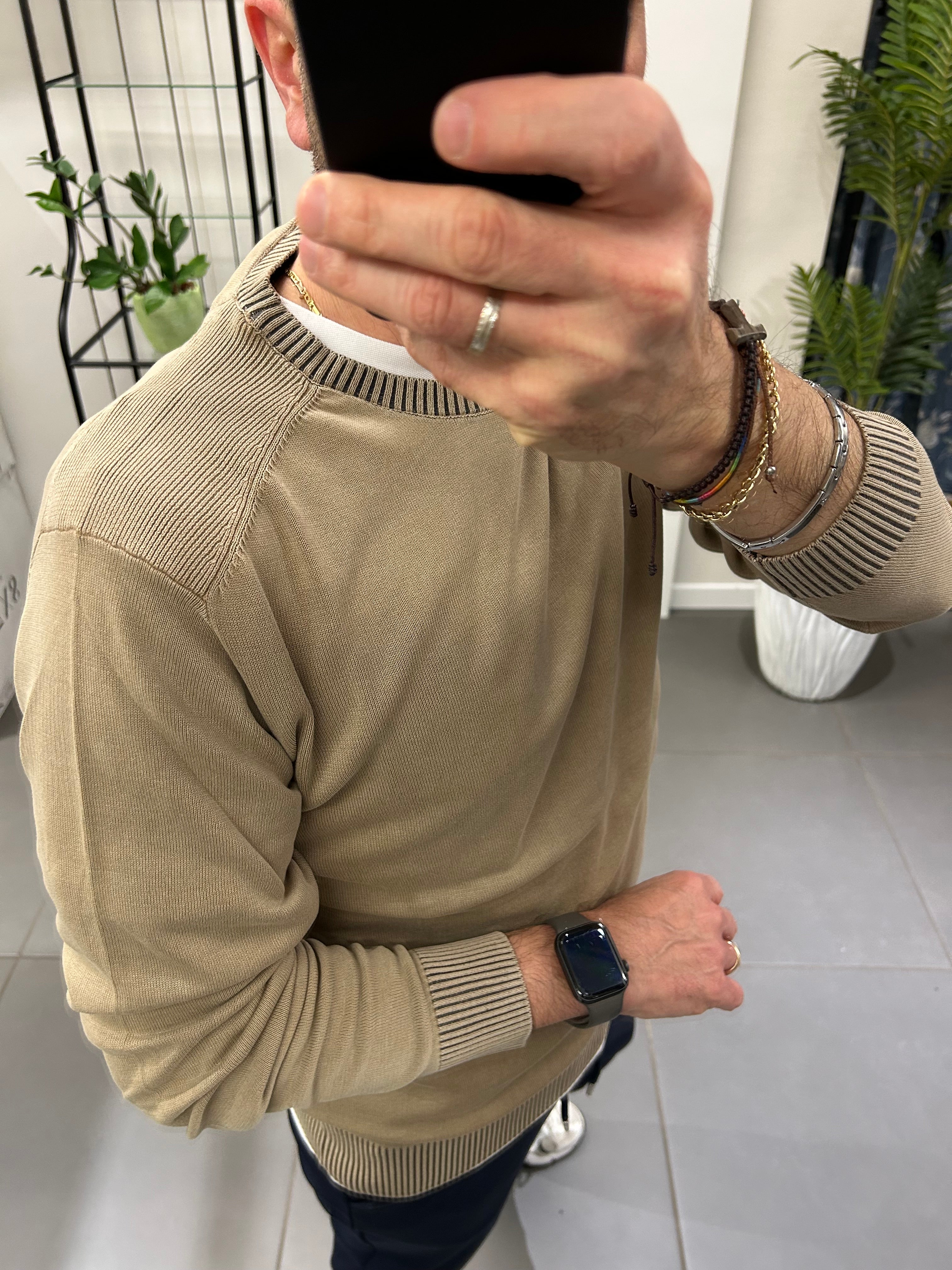 -Girocollo e polsini lavorati nella variante coloniale in contrasto con del blu.