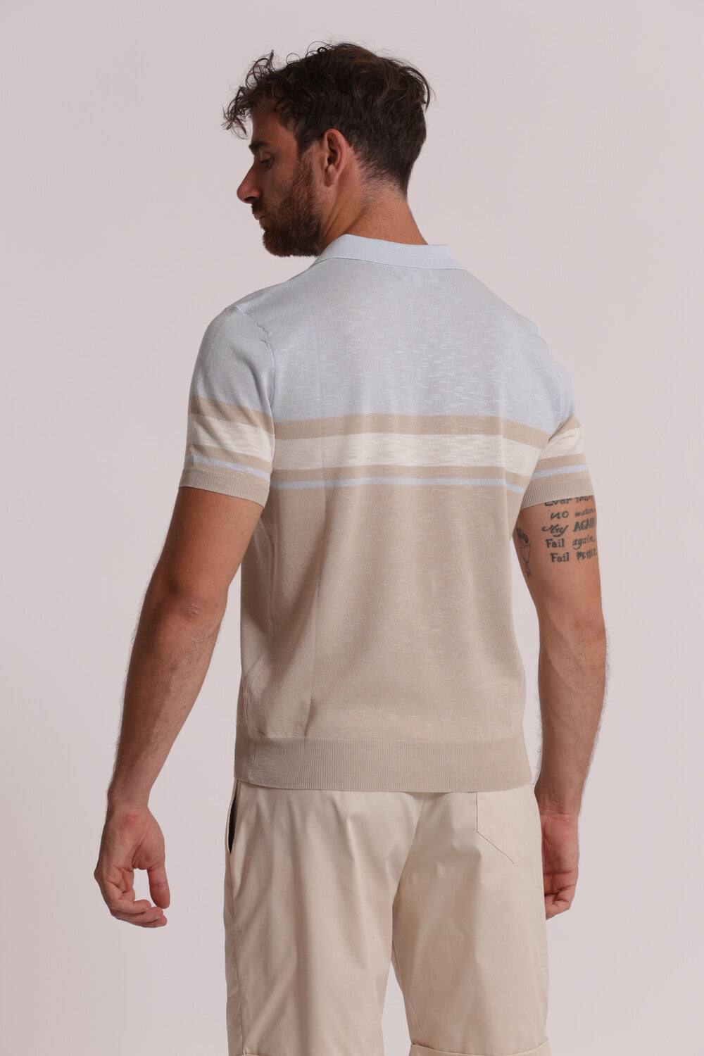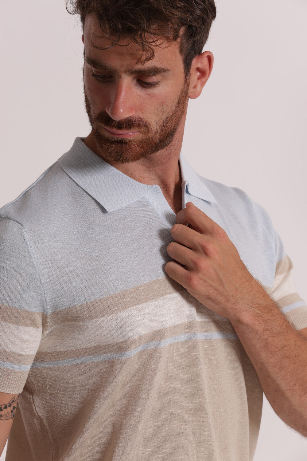 - Polo a maniche corte, morbida con colletto e leggero scollo a V, motivo a righe sul davanti, dietro e maniche