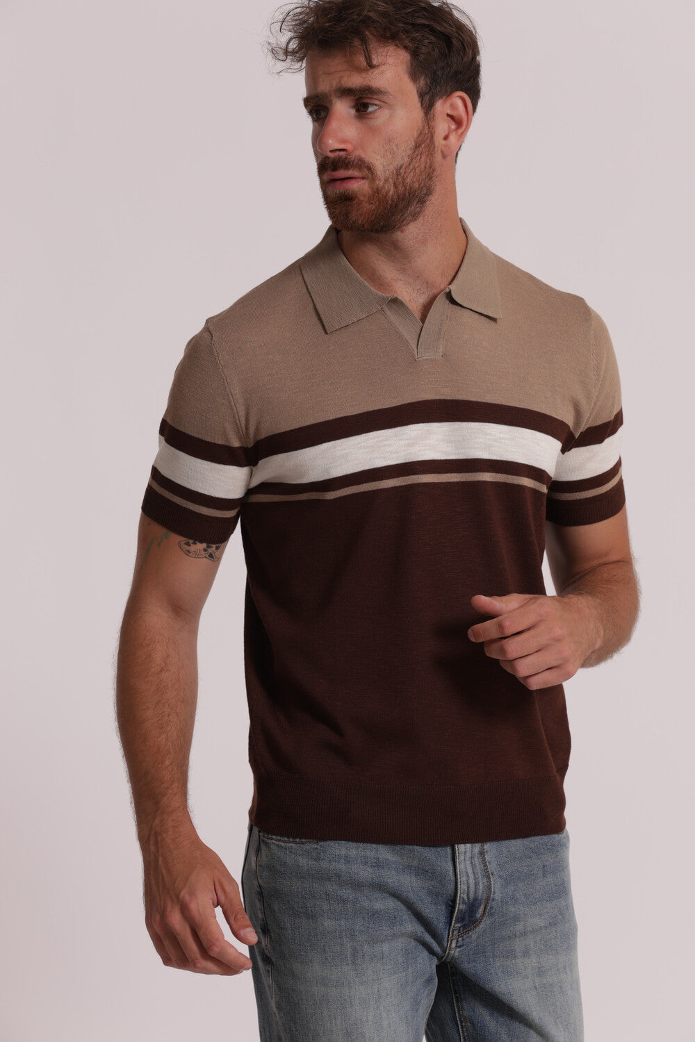 - Polo a maniche corte, morbida con colletto e leggero scollo a V, motivo a righe sul davanti, dietro e maniche