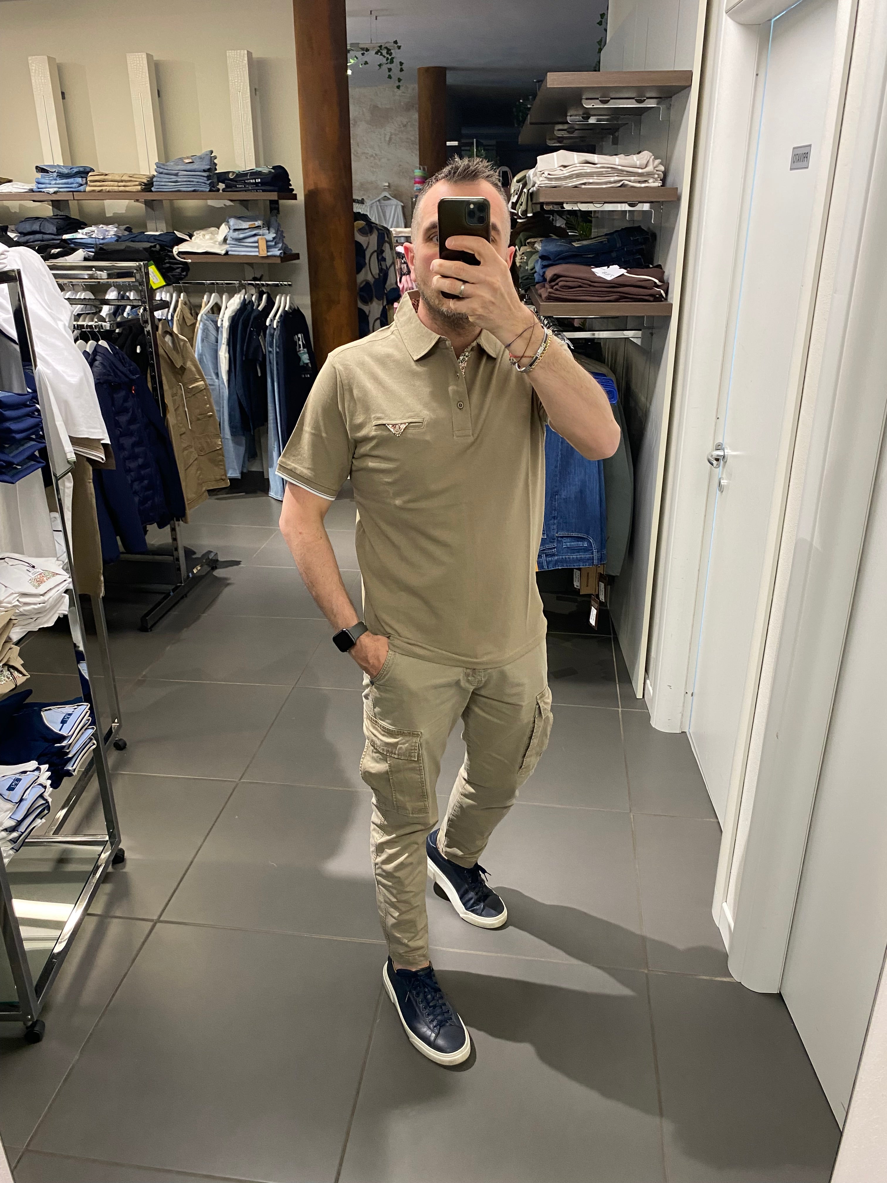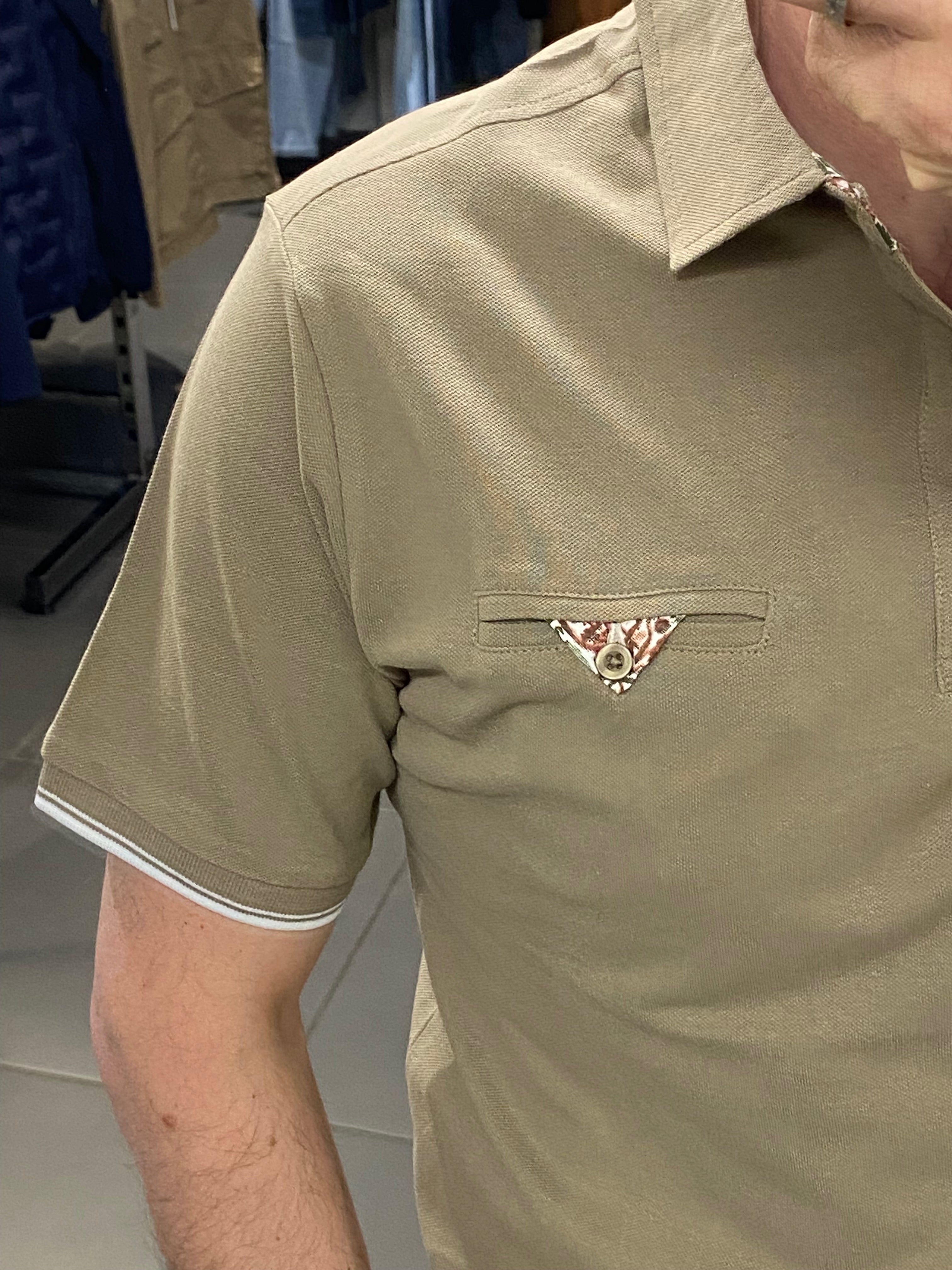 Polo Manica Corta in Piquet da Uomo semplice con spacchetti laterali con dettagli di impunture nel bordo spacchetto, taschino con applicazione in fantasia, interno e sotto collo in fantasia e nel bordo manica riga in contrasto.