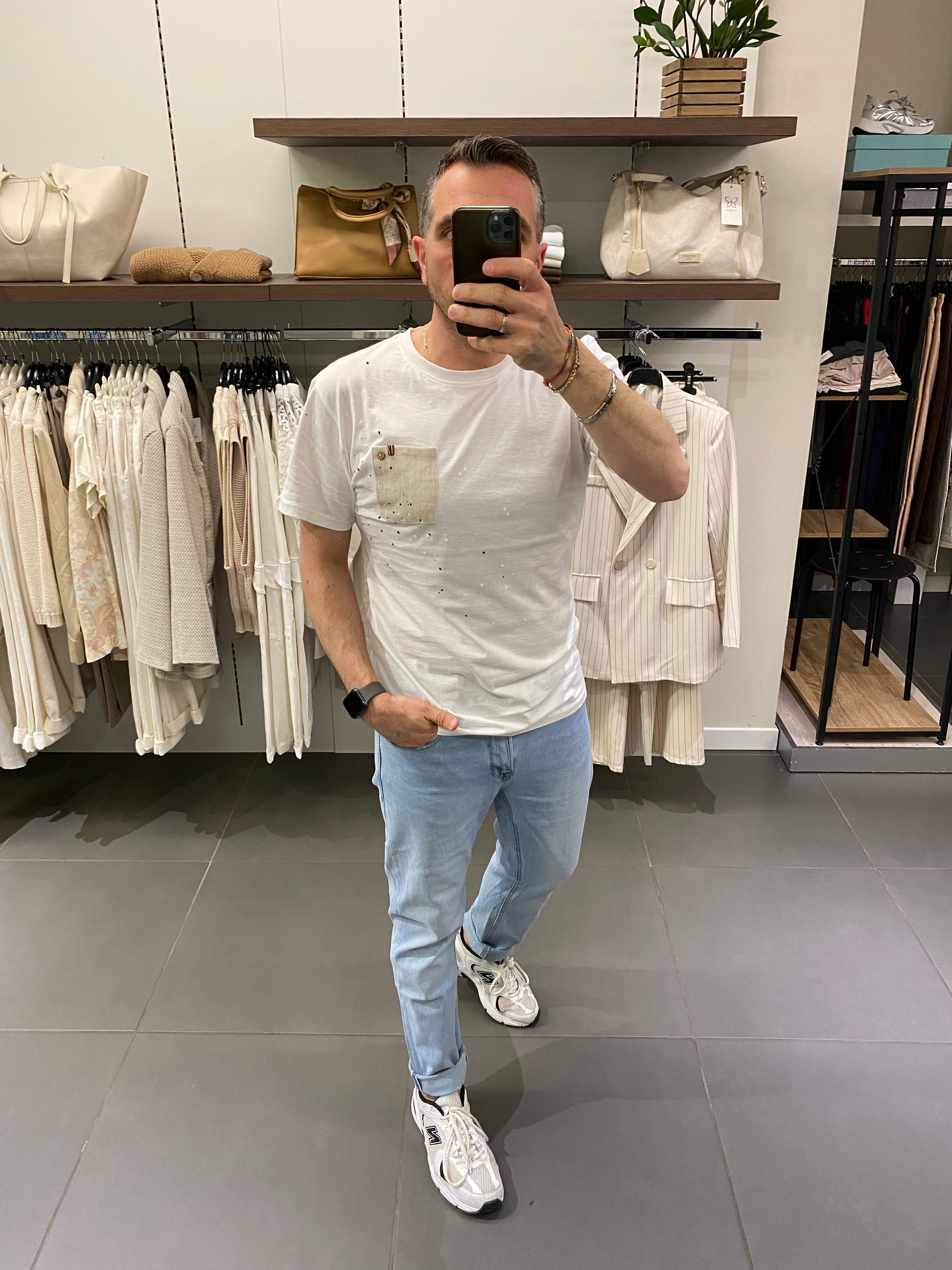 -in tinta bianca con tasca in contrasto e schizzi di colore